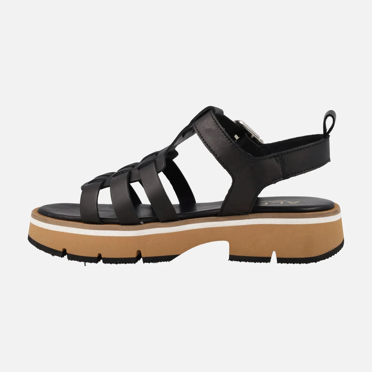 Sandalias negras de piel de la marca Alpe modelo Zanzibar 5489 negro. Sandalias negras de piel estilo romanas, con cierre de hebilla ajustable. Interior forrado de piel. Plataforma ligera de 4 cms de altura trasera (3 cms parte delantera) en color cuero, blanco y negro..