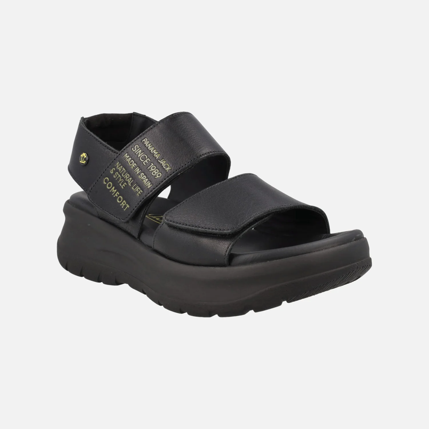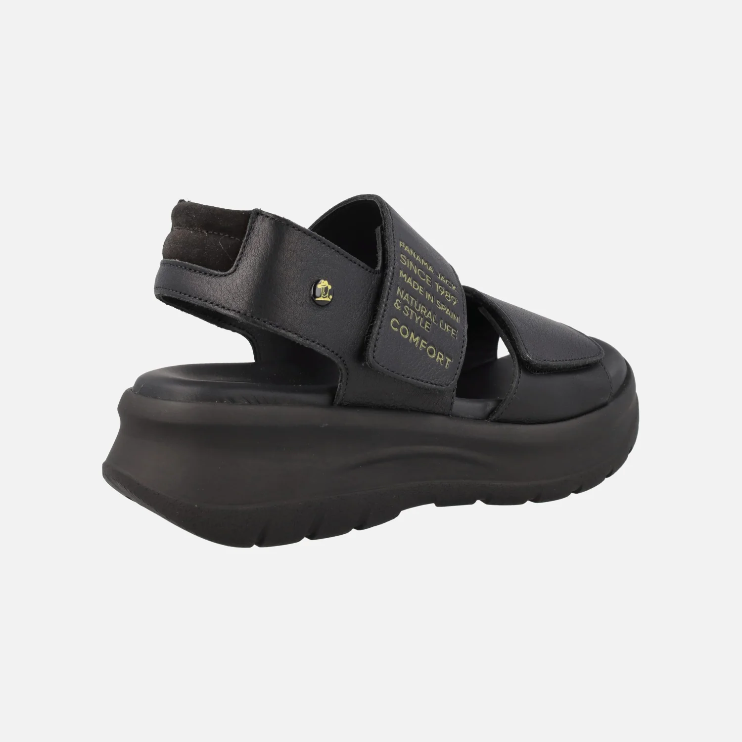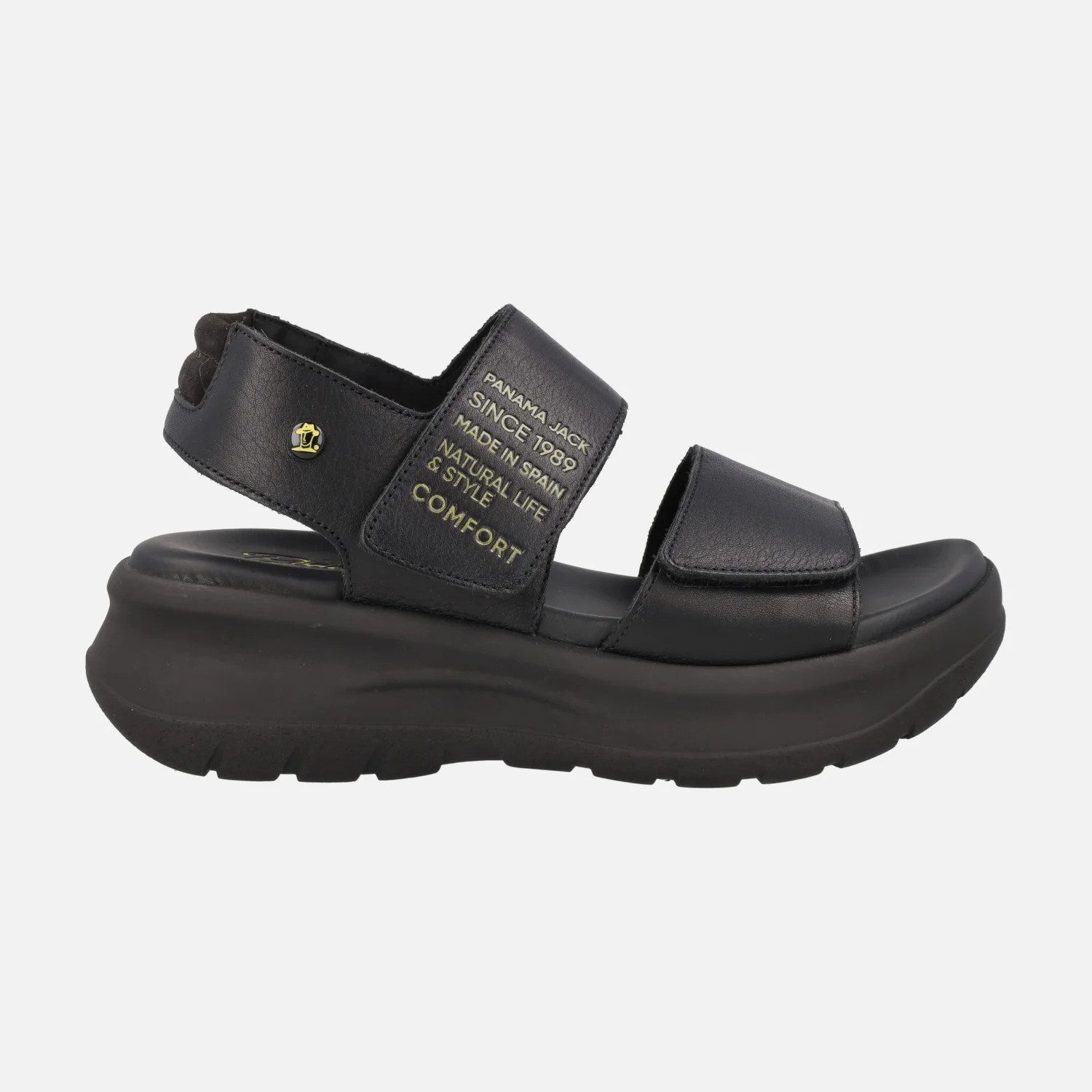 Sandalias Panama jack para mujer con cierre de velcros Noah B1 Napa Negro Black. Sandalias de piel con cierre de velcros, elaboradas en napa negra. Detalle de letras en amarillo en la tira del empeine. Planta anatómica, muy confortable. Piso de poliuretano, ligero y resistente, de aproximadamente 6 cms de altura trasera (4 cms parte delantera). Made in Spain.