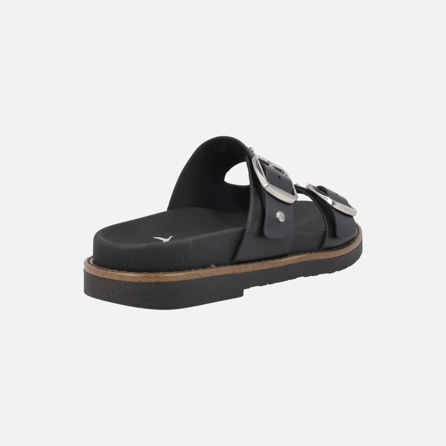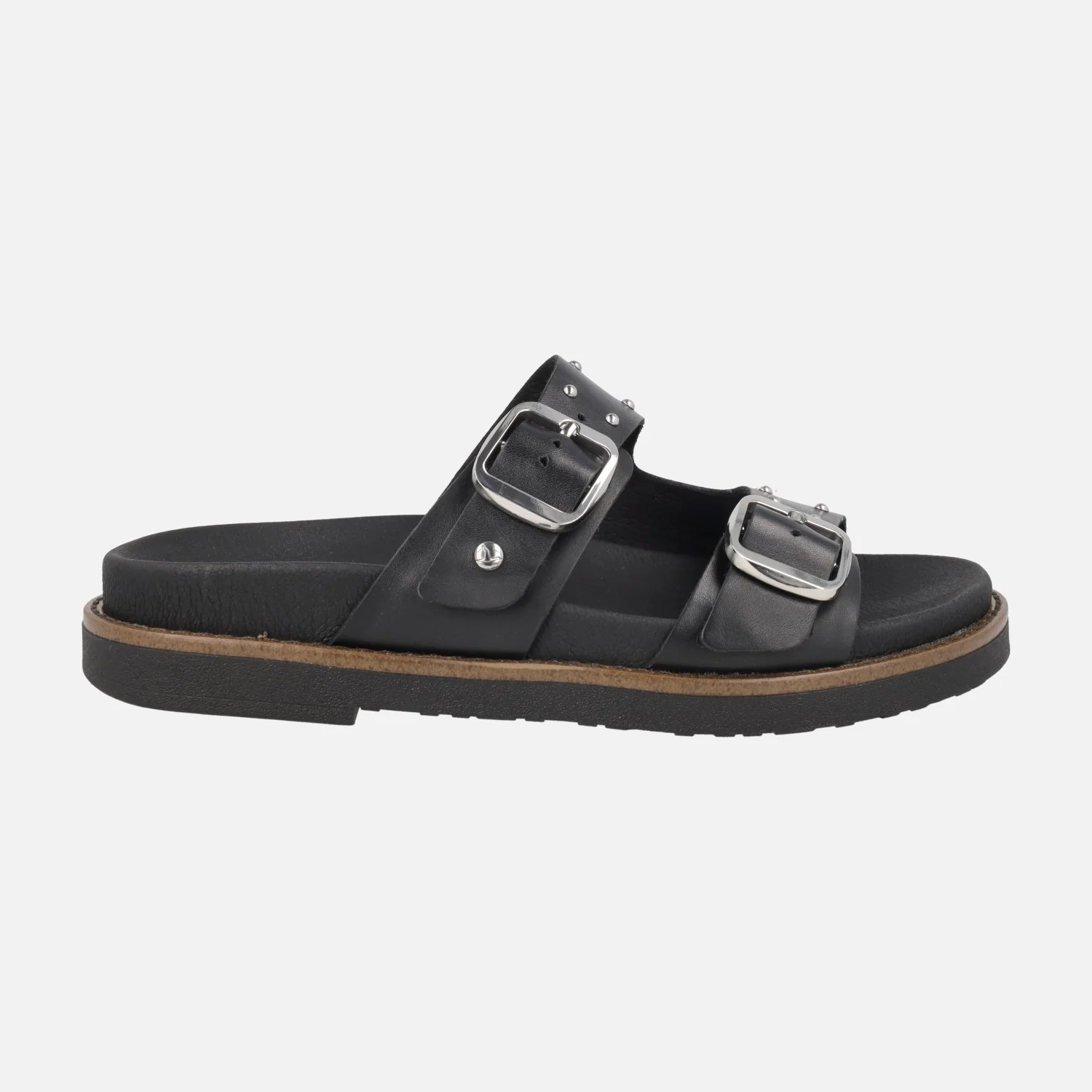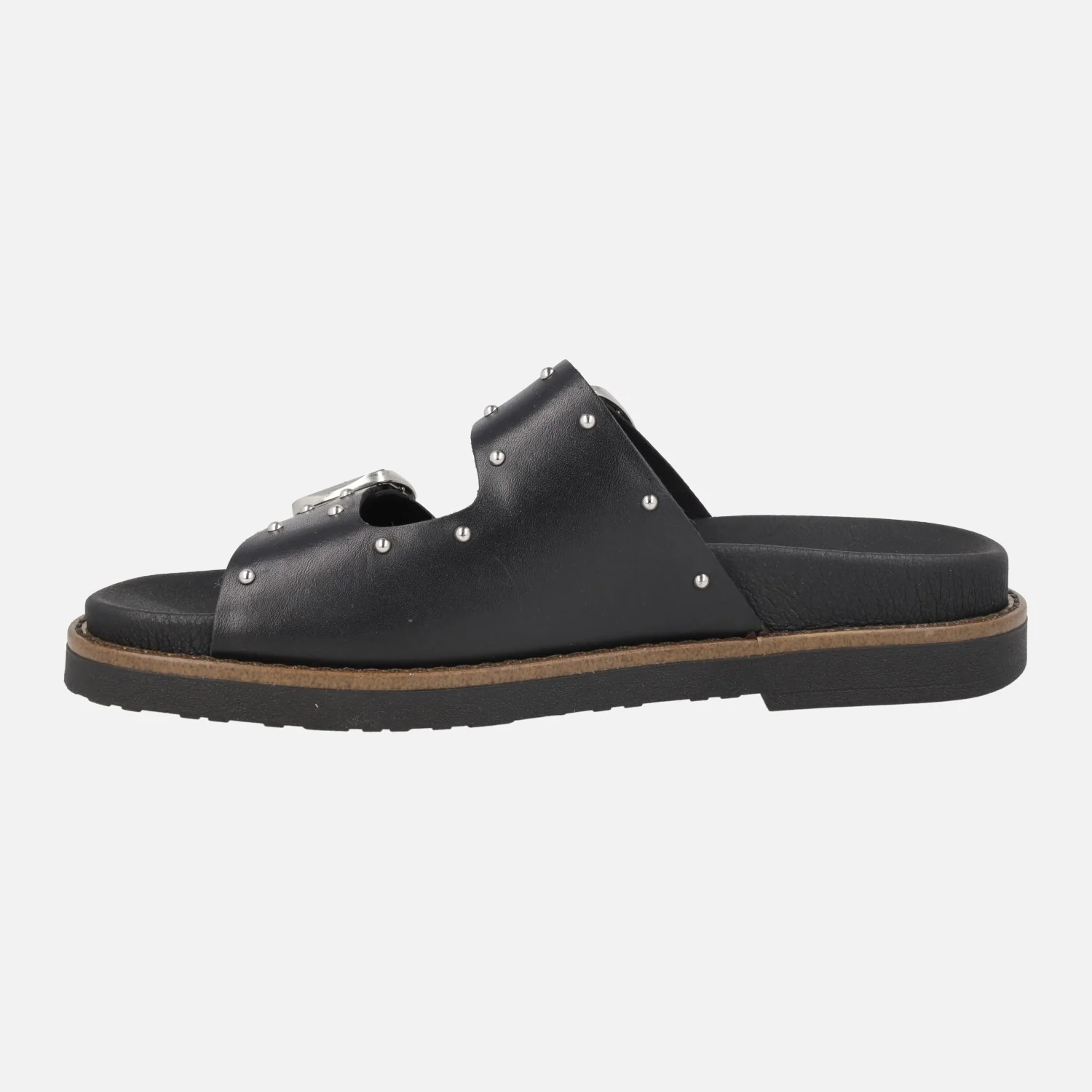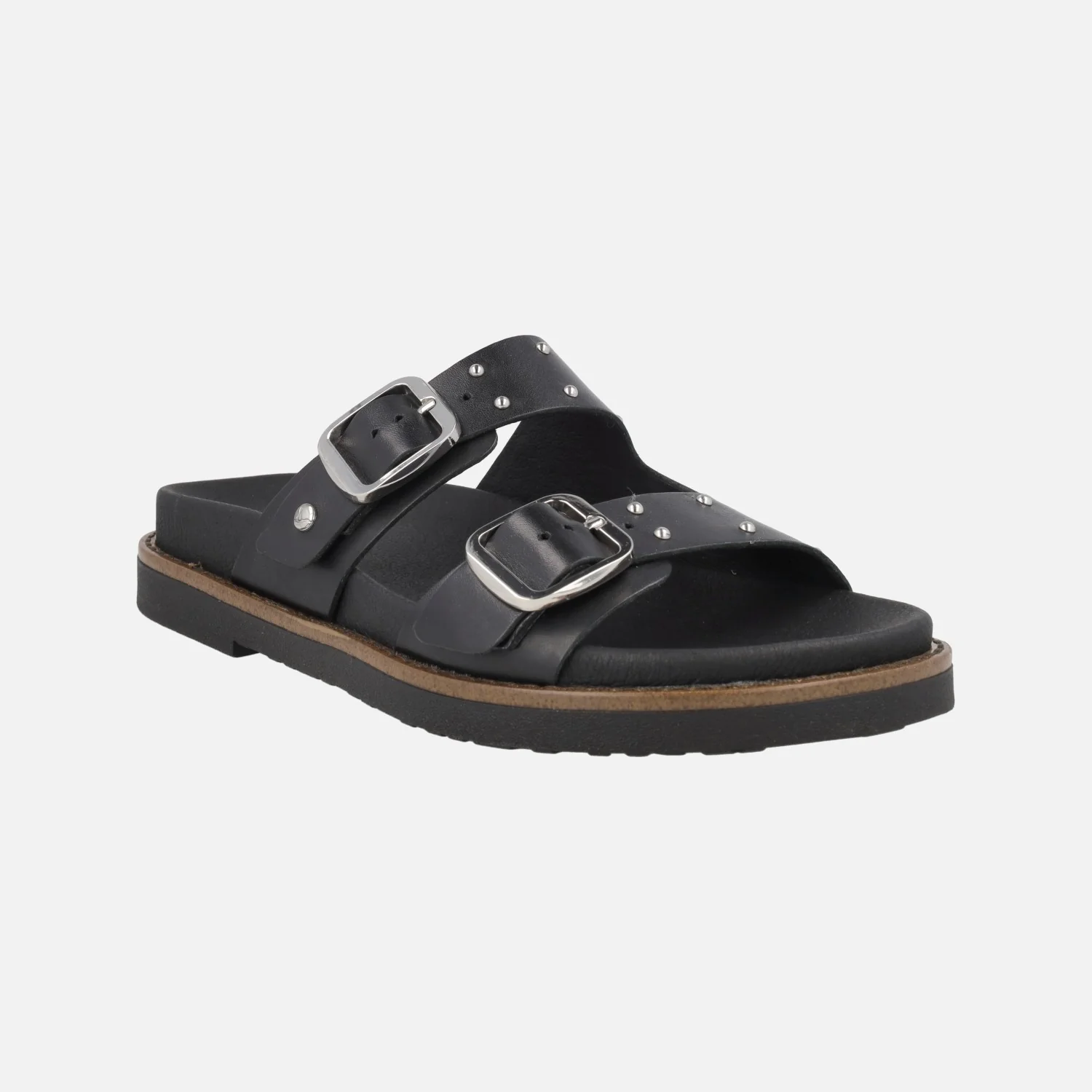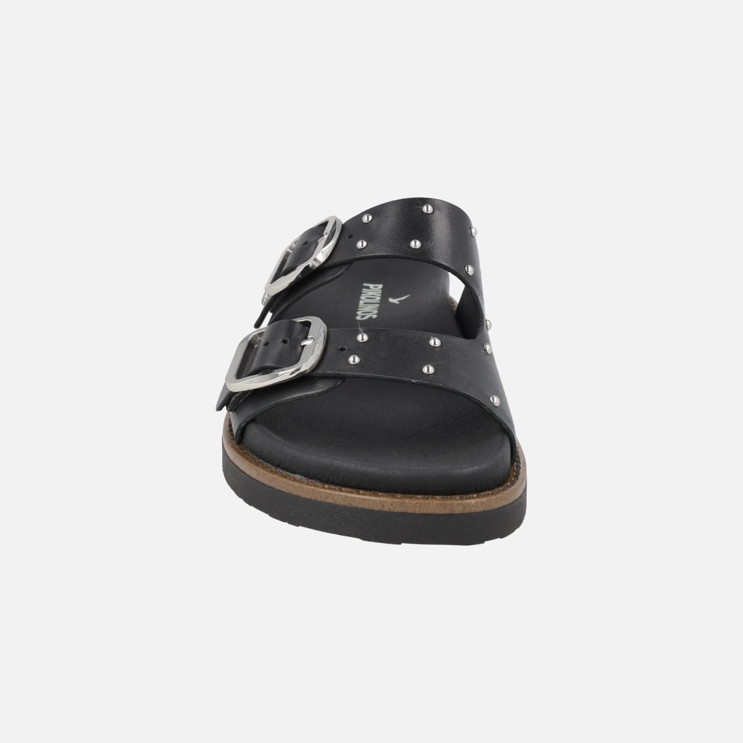Sandalias negras de piel Pikolinos Aitana 0939-W7Z Black. Sandalias con detalle de hebillas y tachas metálicas plateadas. Planta acolchada, interior textil. Suela sintética muy ligera, de aproximadamente 3 cm de altura en la parte trasera (2 cm parte delantera).
