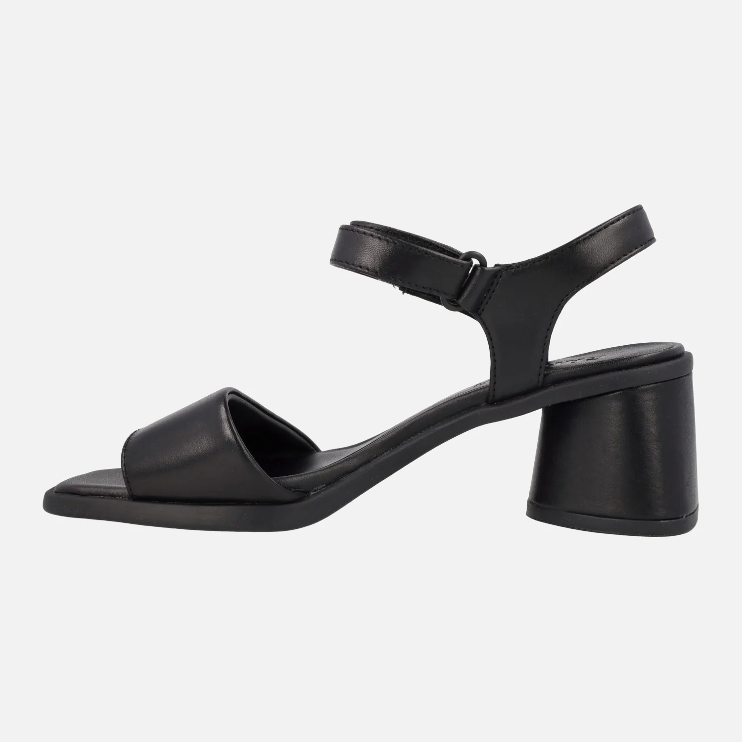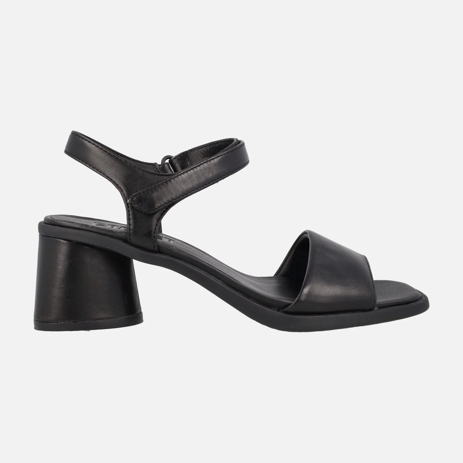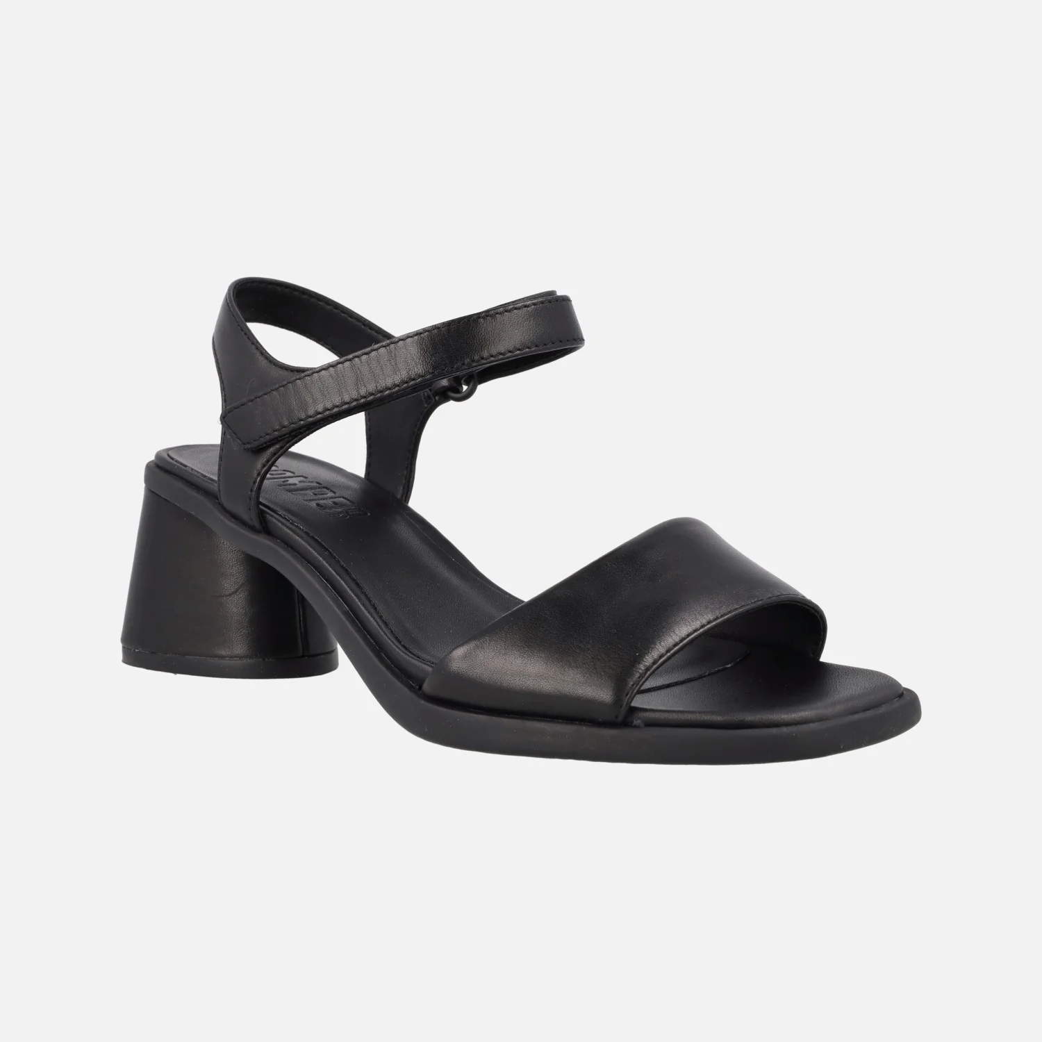 Sandalias negras de piel de la marca Camper modelo Kiara K201501 Ultrasoft negro/Kiara S.Ultrasoft negro. Sandalias con tira ancha delantera y pulsera al tobillo con cierre de hebilla. Plantillas Ortholite recicladas. Tacones de 6,5 cms de altura, suela de goma.