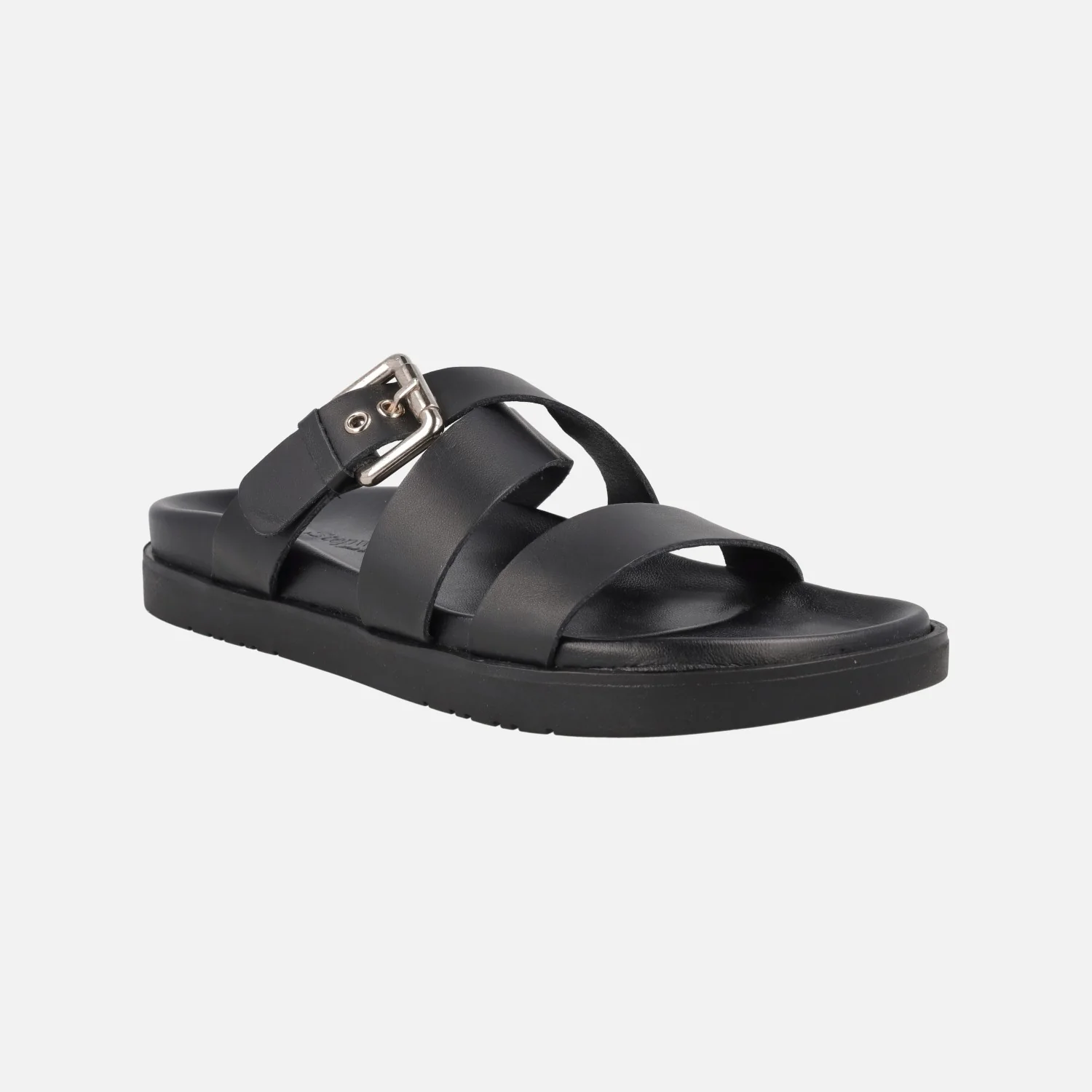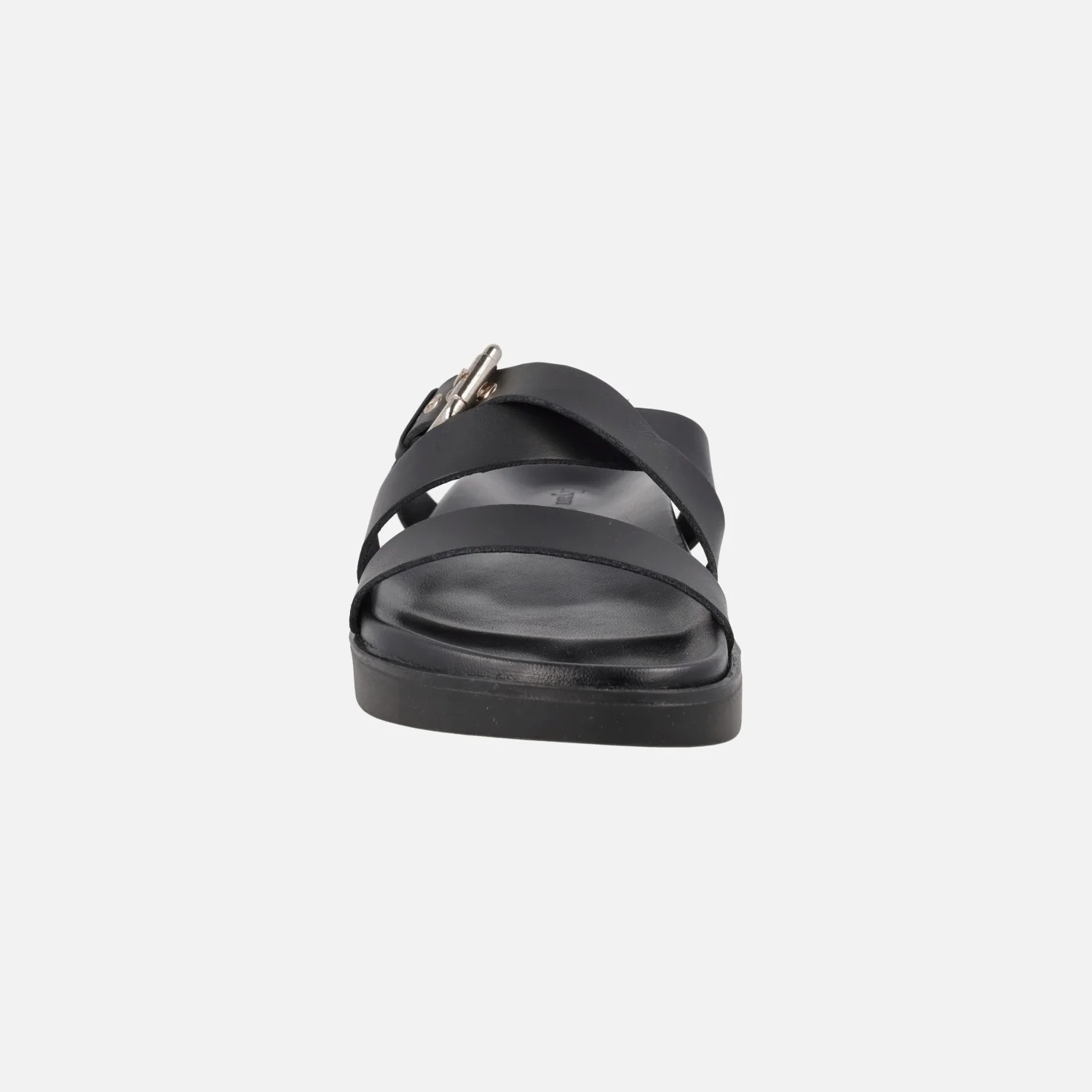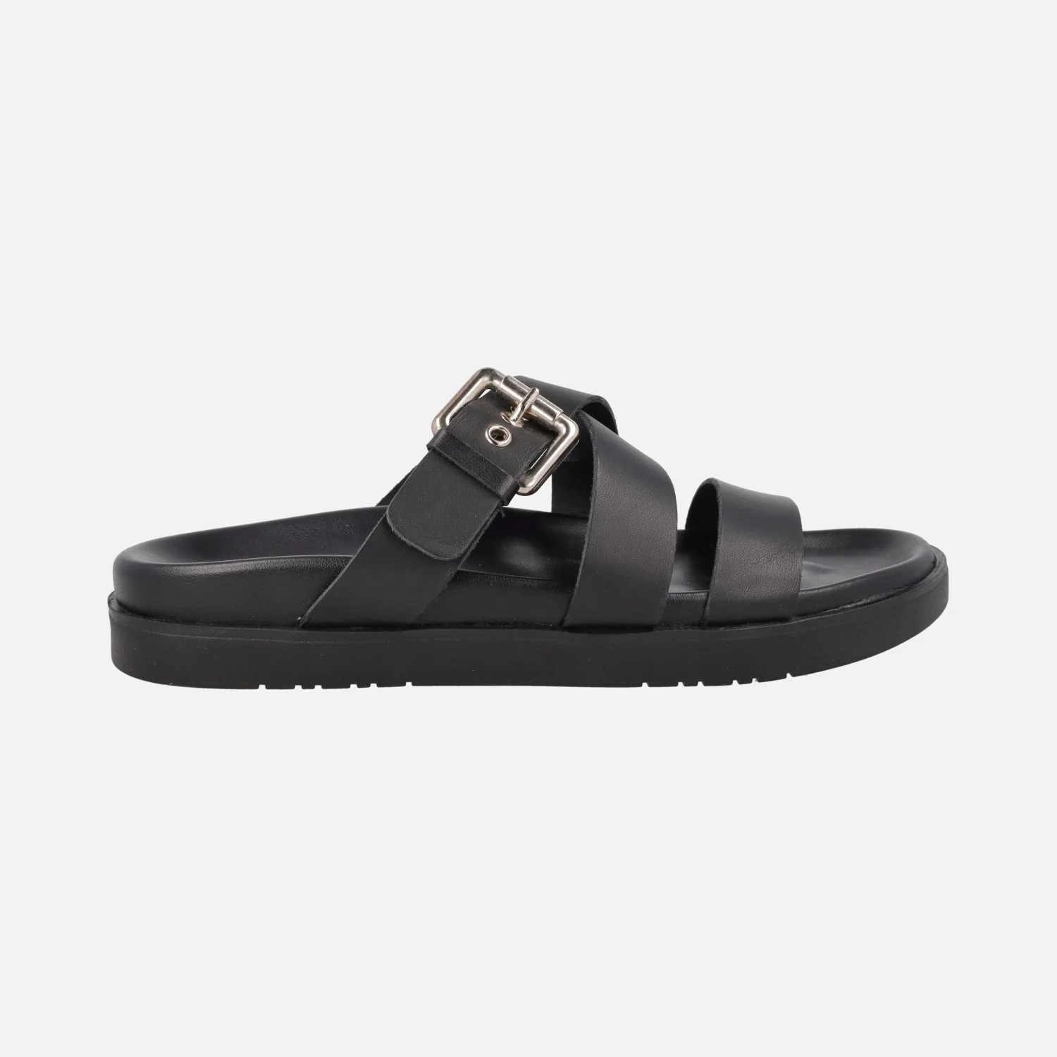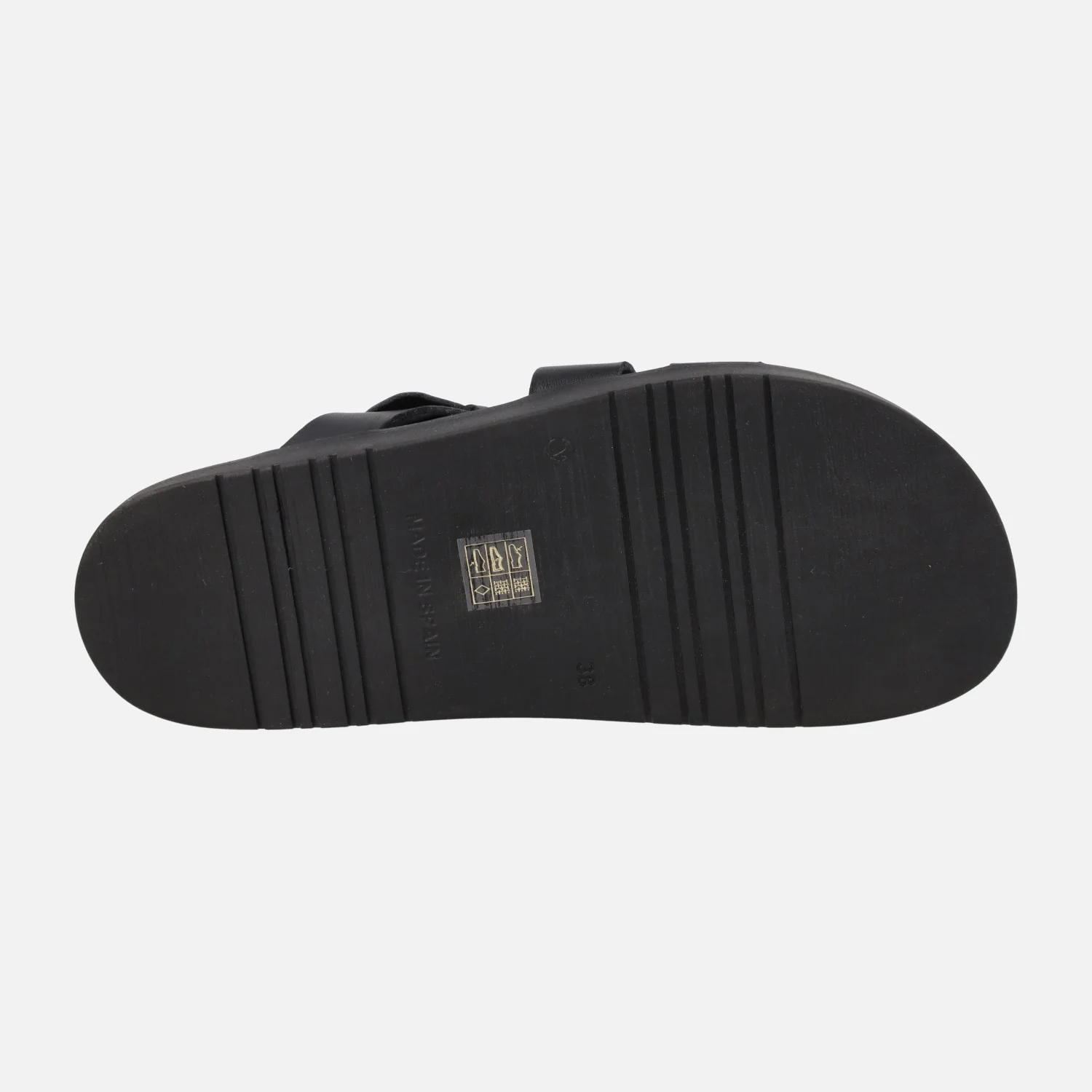 Sandalias descalzas con tiras anchas para mujer de la marca Bryan Stepwise, modelo 5113 Negro. Sandalias negras de piel con varias tiras y cierre con hebilla metálica dorada. Interior textil. Piso de goma, con 3,5 cm de altura trasera (2,5 cm parte delantera).