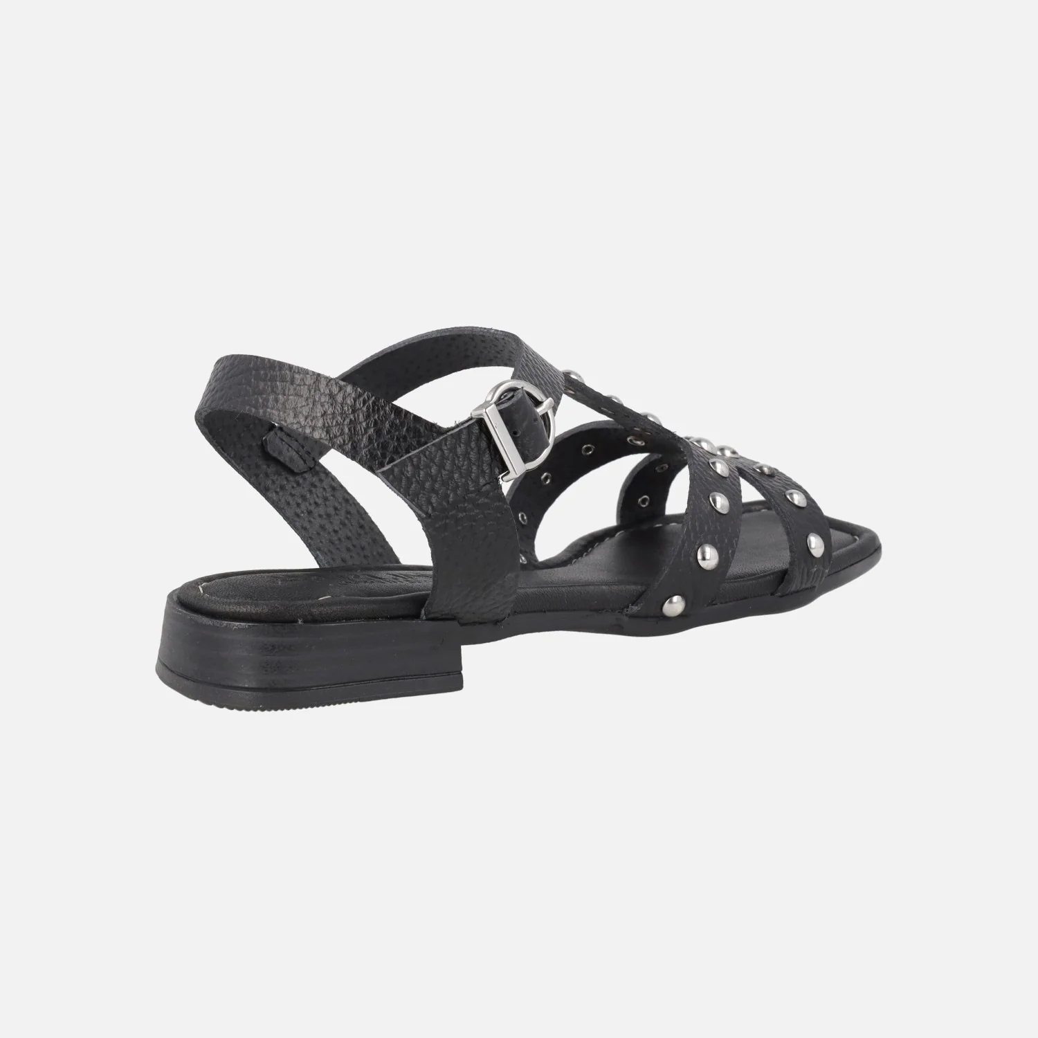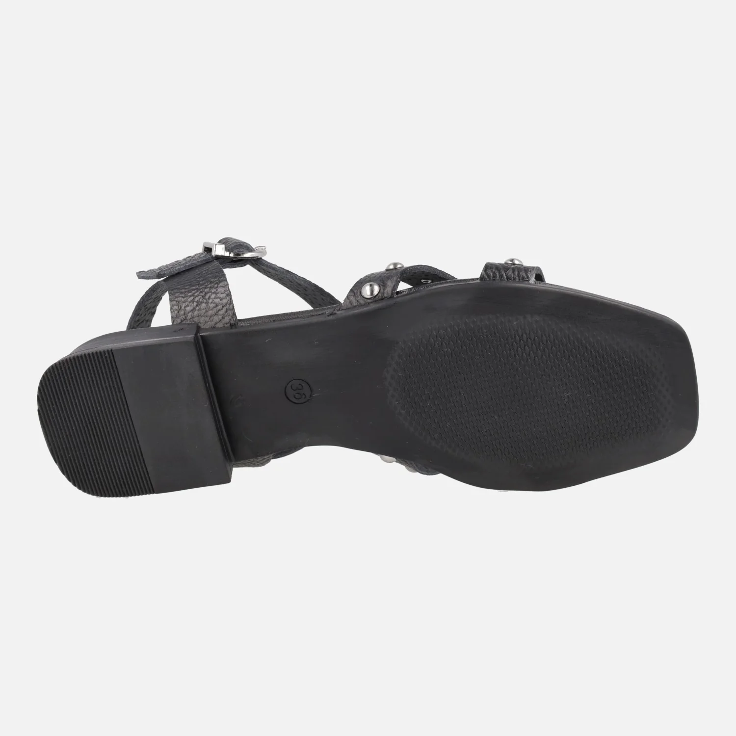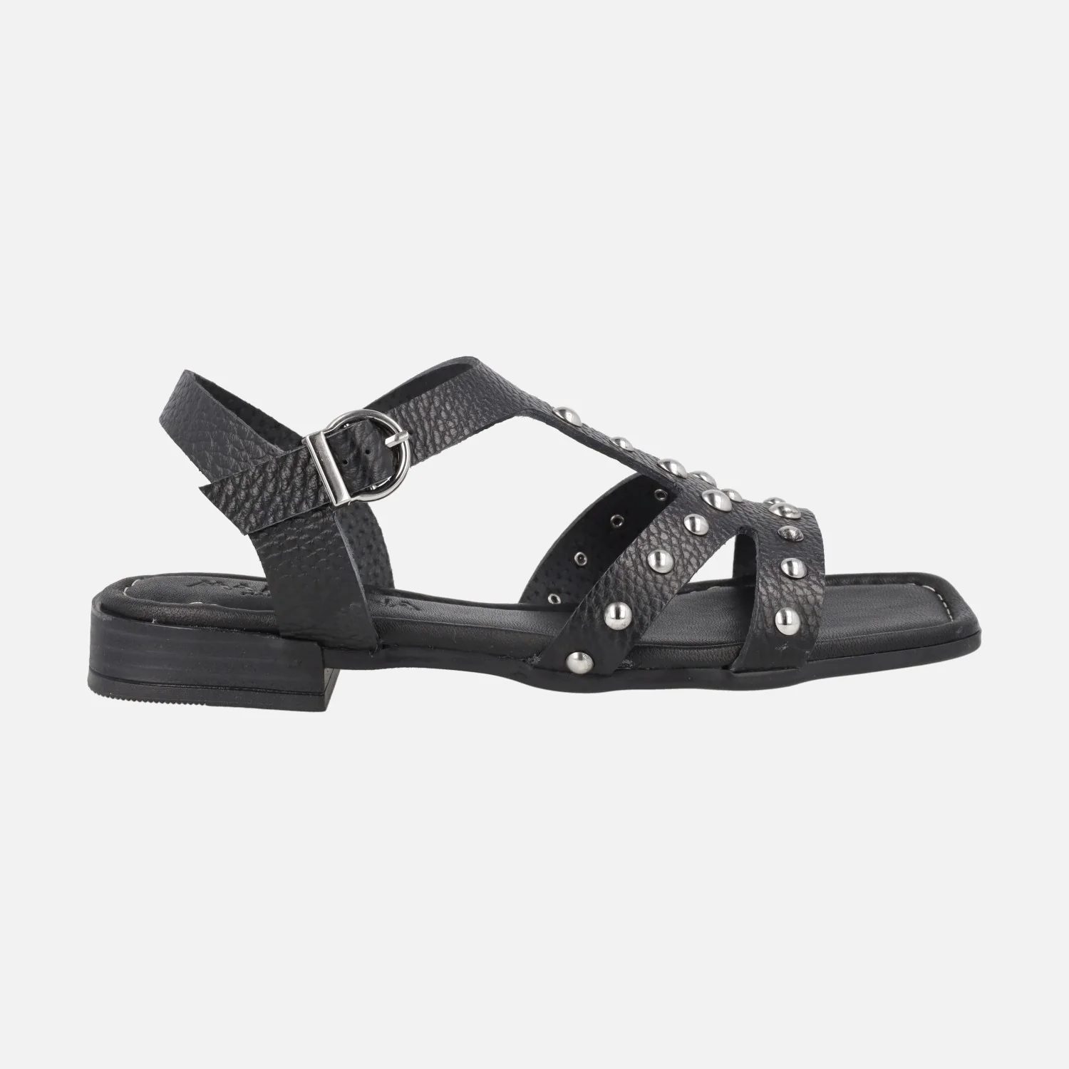Sandalias negras de piel de la marca Lince, modelo 51764 Negro. Sandalias negras en piel grabada con cierre de hebilla ajustable al tobillo. Detalle de tachas metálicas plateadas. Interiores forrados de piel. Suela sintética, con tacones de 2 cm de altura. Made in Spain.
