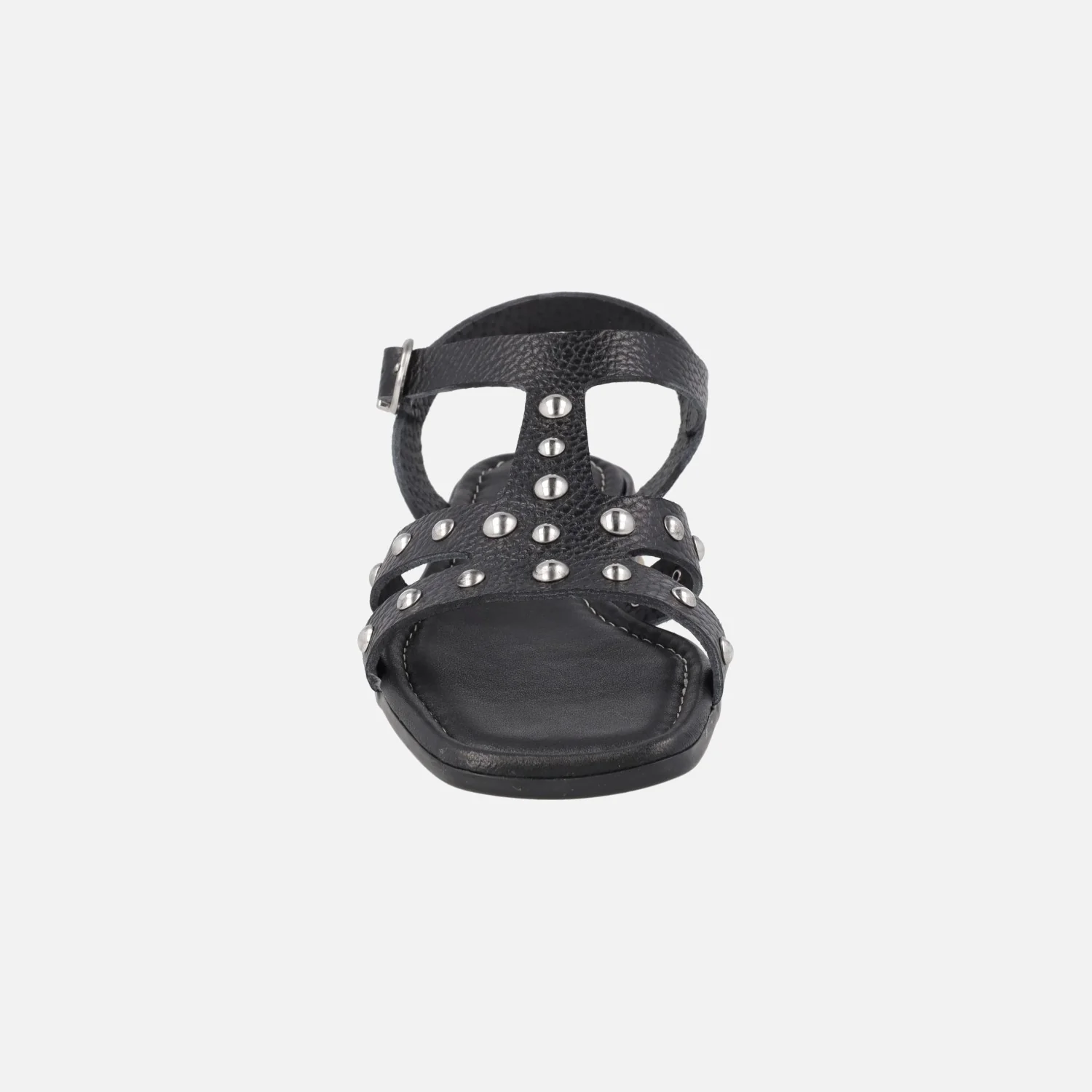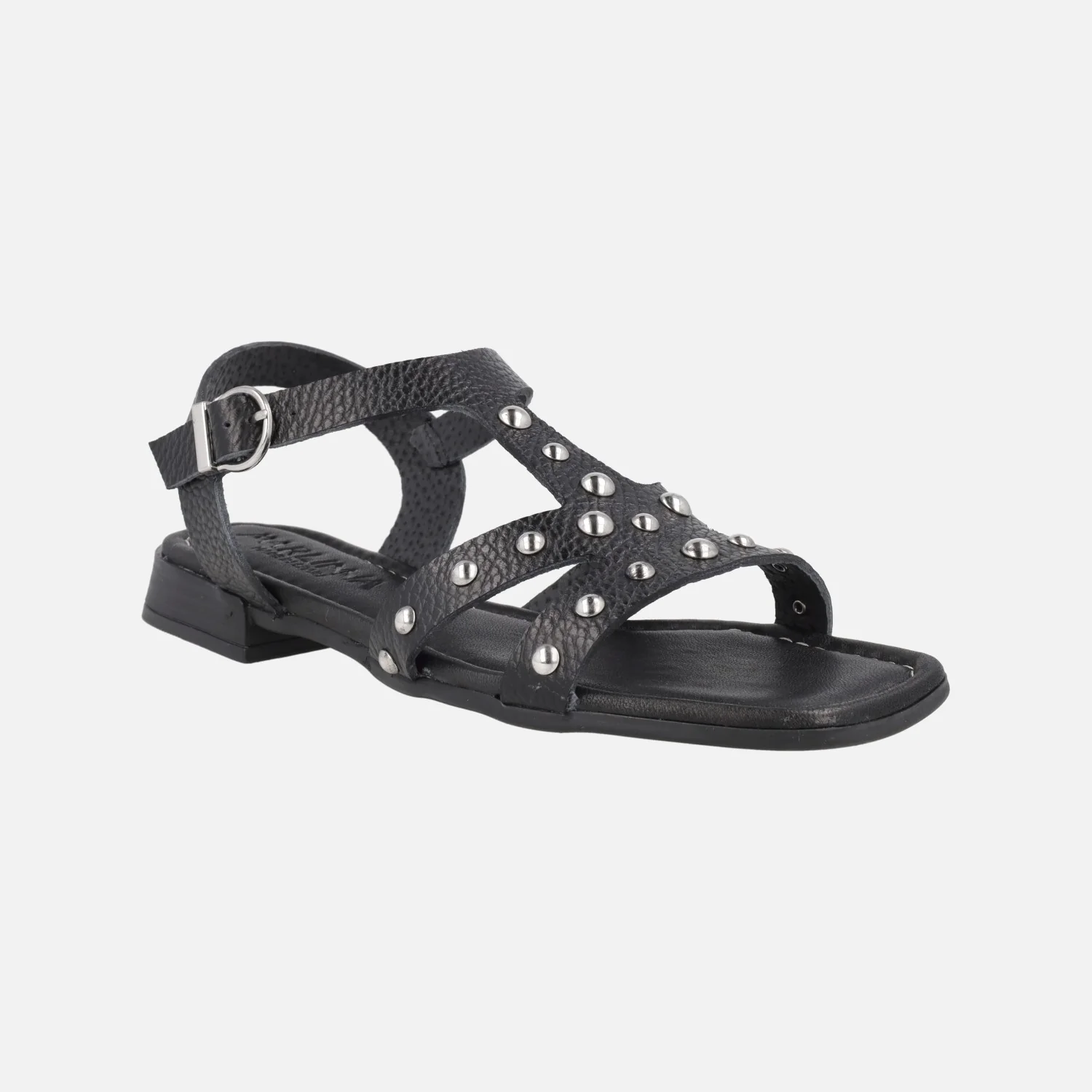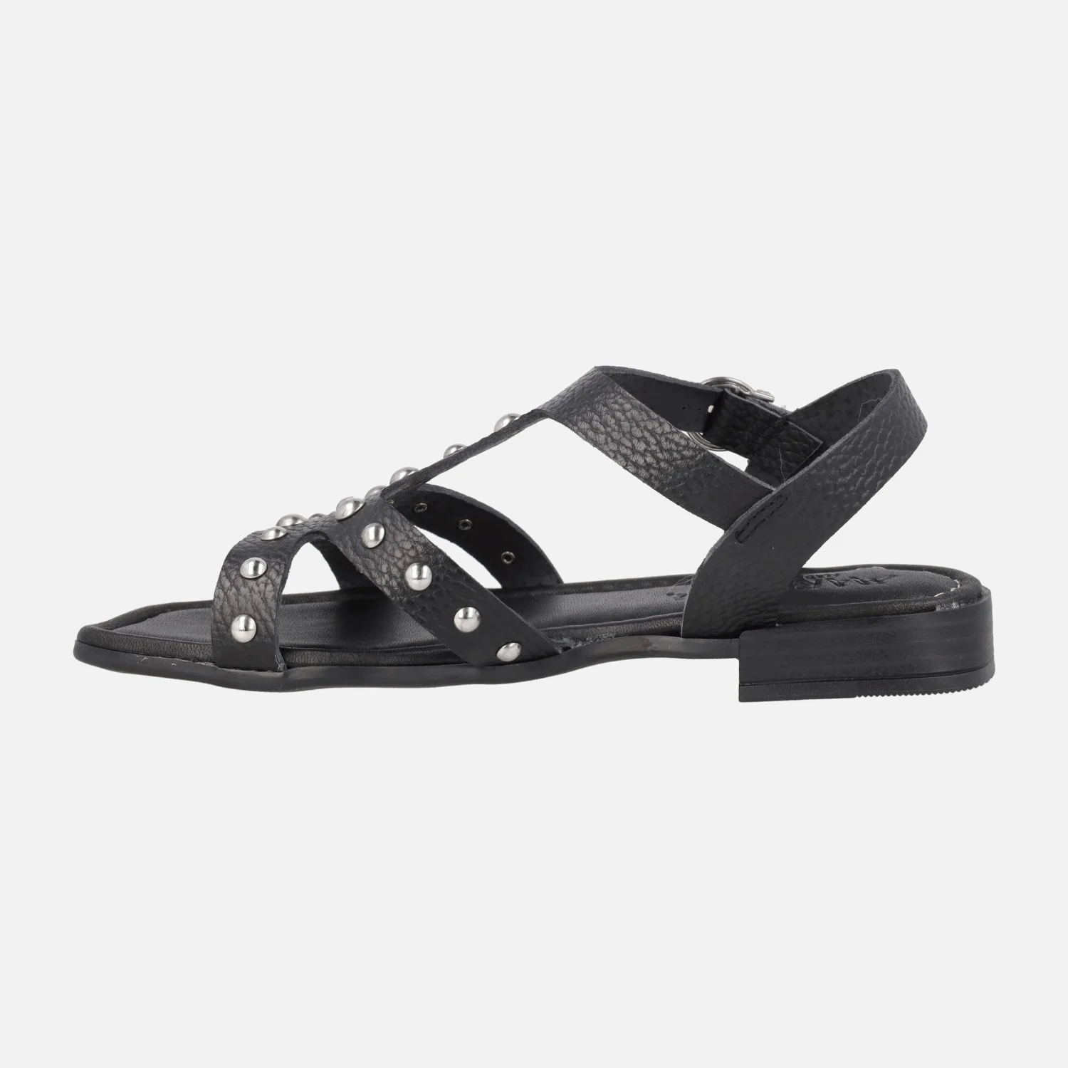 Sandalias negras de piel de la marca Lince, modelo 51764 Negro. Sandalias negras en piel grabada con cierre de hebilla ajustable al tobillo. Detalle de tachas metálicas plateadas. Interiores forrados de piel. Suela sintética, con tacones de 2 cm de altura. Made in Spain.