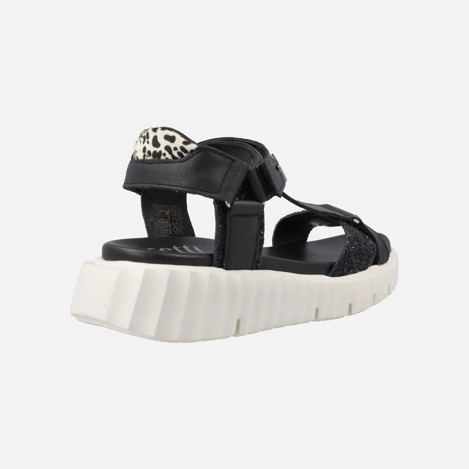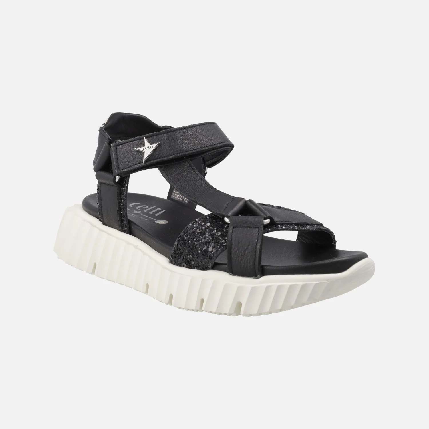 Sandalias negras modelo 1316 Nature negro de la marca Cetti. Sandalias elaboradas en piel negra con detalles en glitter. Cierre de velcro. Interiores de piel. Plataforma de goma, muy ligera, con 5 cms de altura trasera (3 cms parte delantera). Made in Spain.