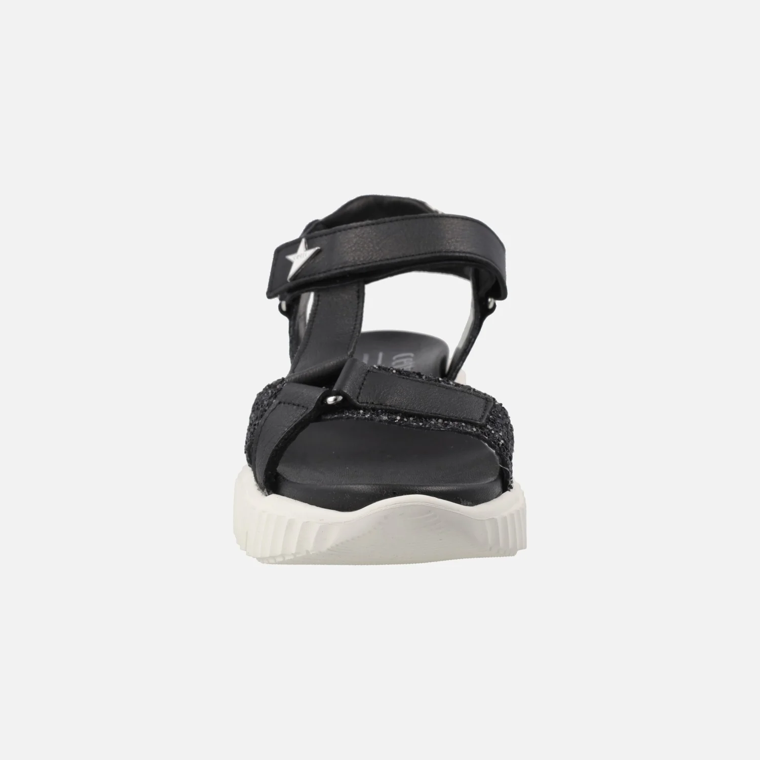 Sé el primero en valorar “Sandalias negras en combinado de piel y glitter con cierre de velcro”