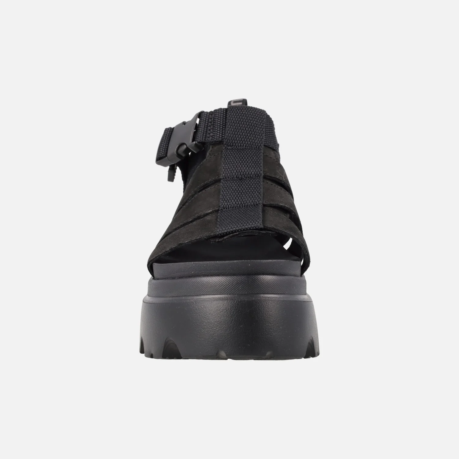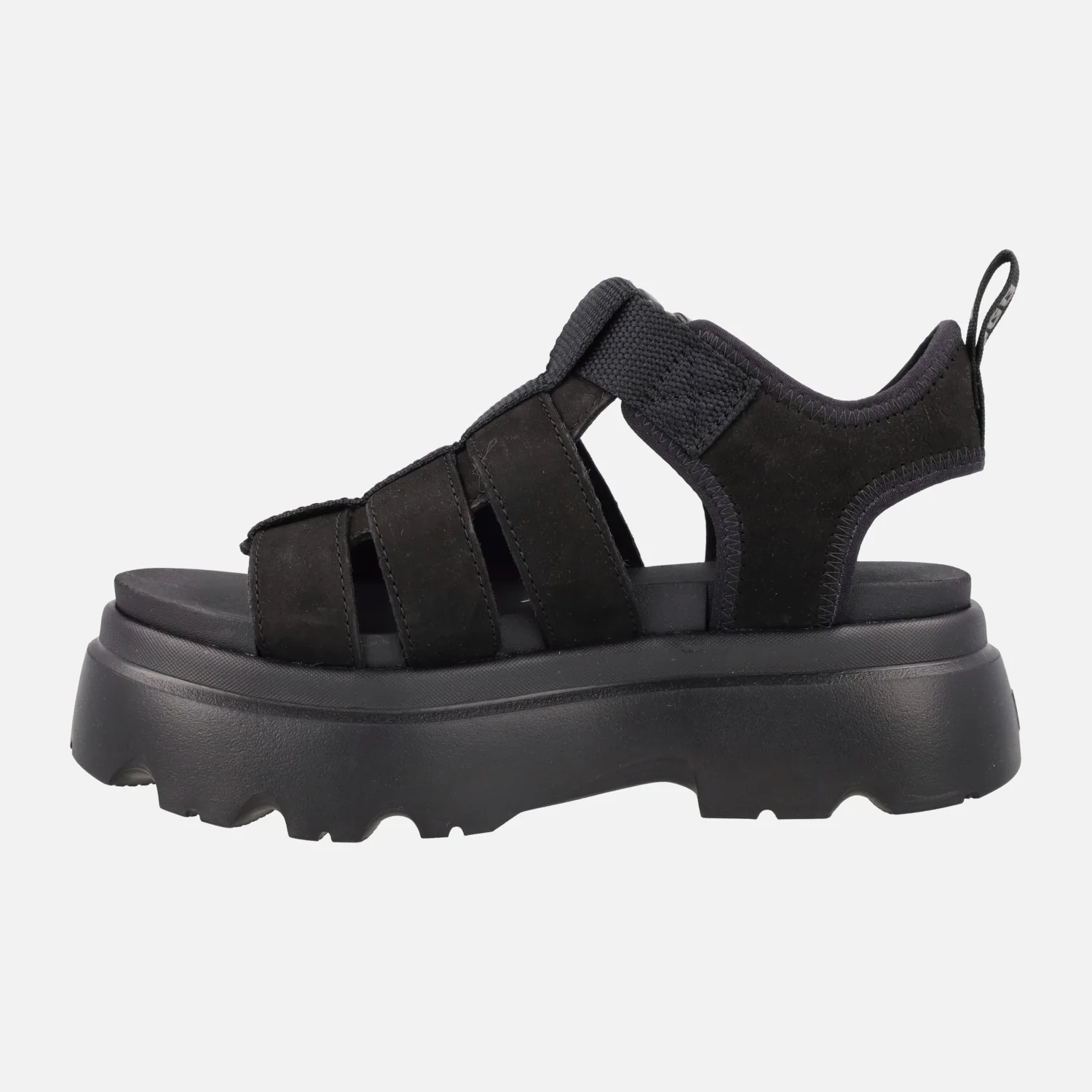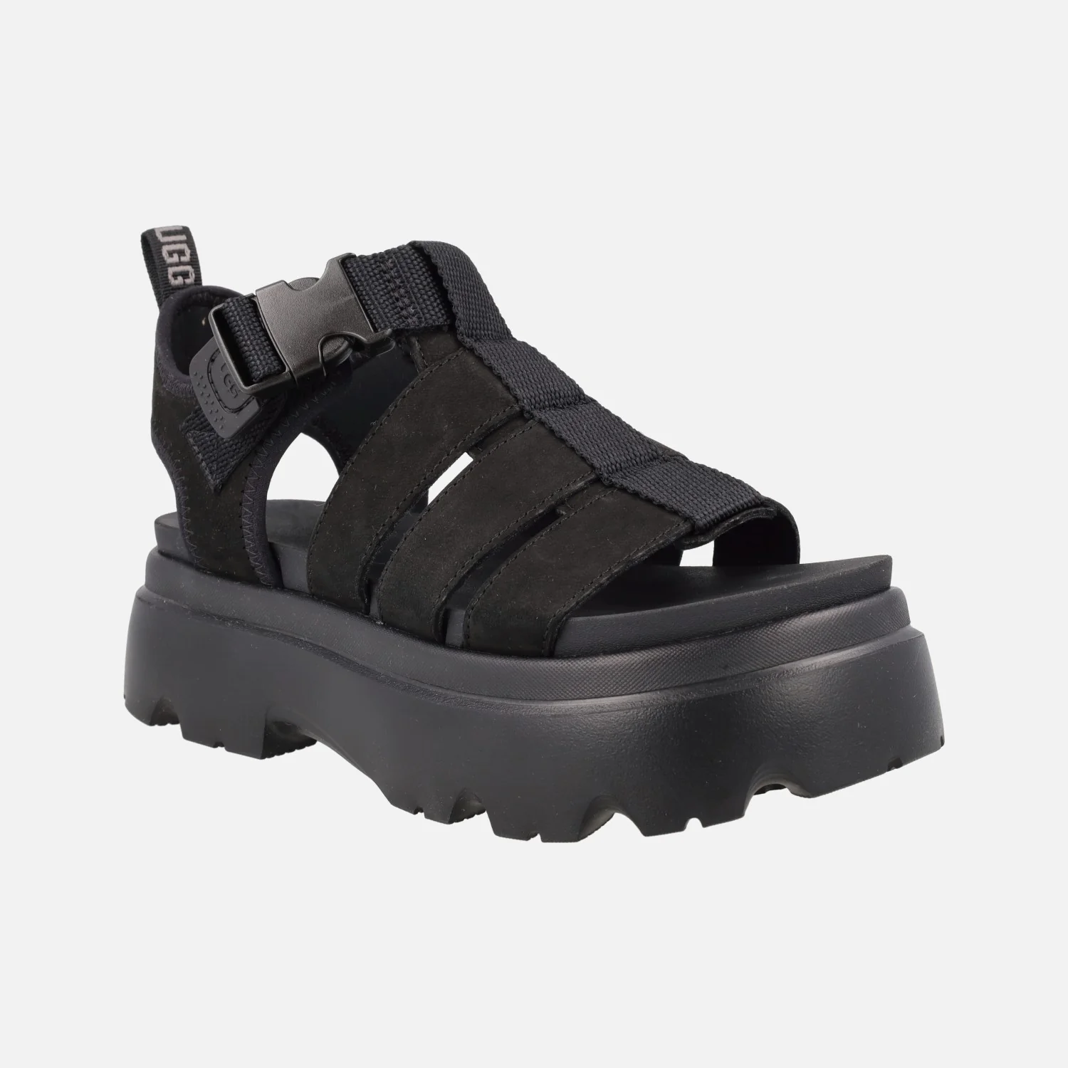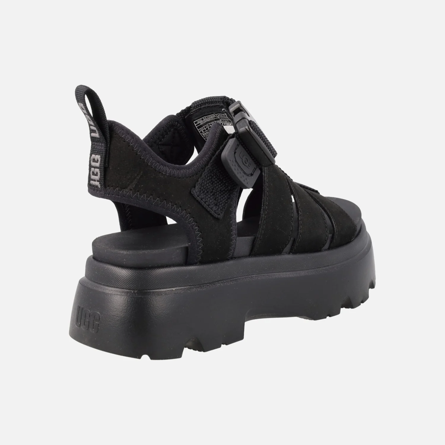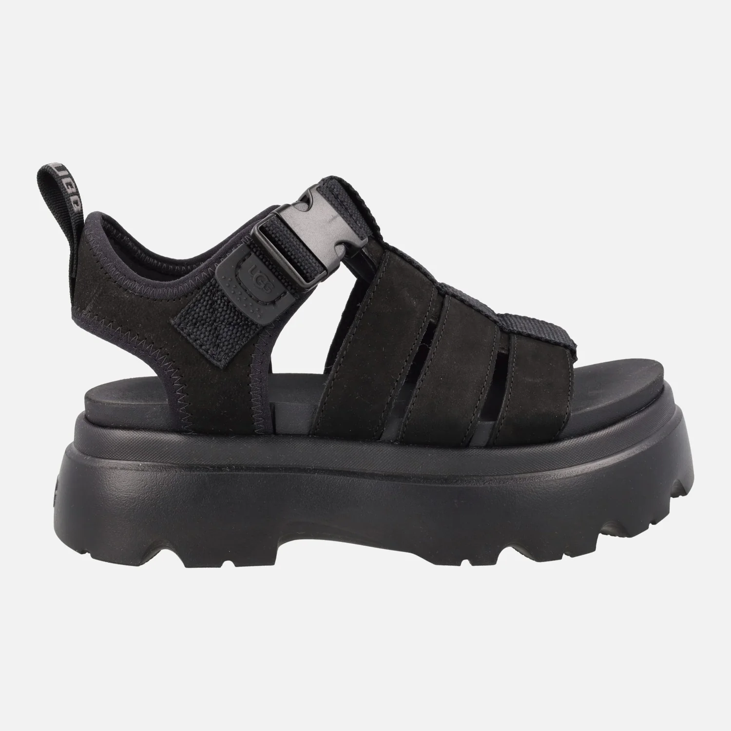 Nuevas sandalias UGG Cora black, 1152698. Sandalias elaboradas en piel nobuck, con detalle de tiras textiles. Tira ajustable con cierre de broche plástico. Tirador trasero. Interiores en tejido y EVA. Planta acolchada. Piso y plataforma de EVA, muy ligero, de 6 cms de altura trasera (5 cms parte delantera).