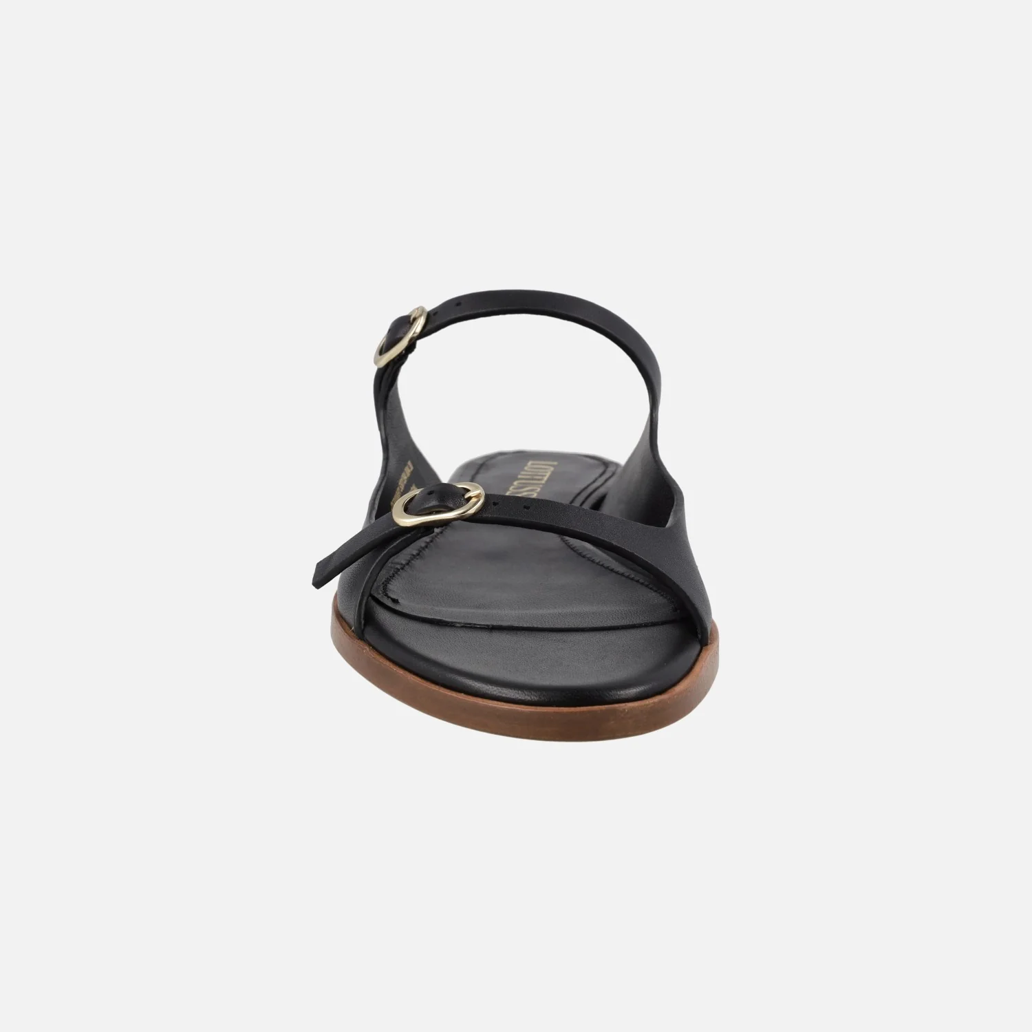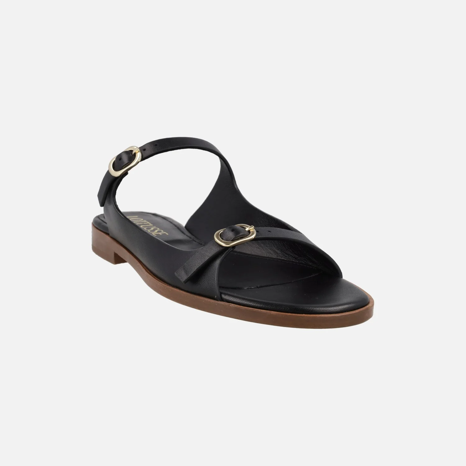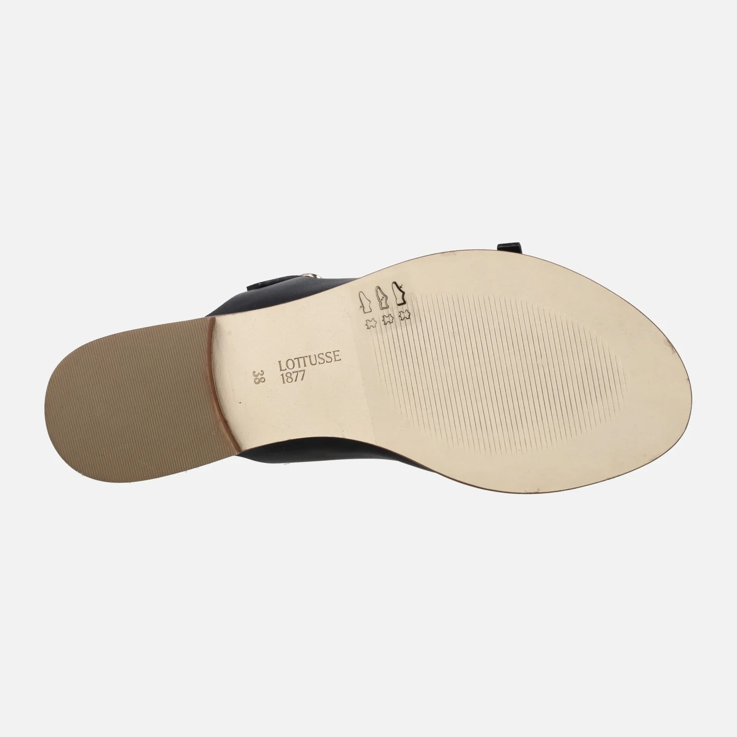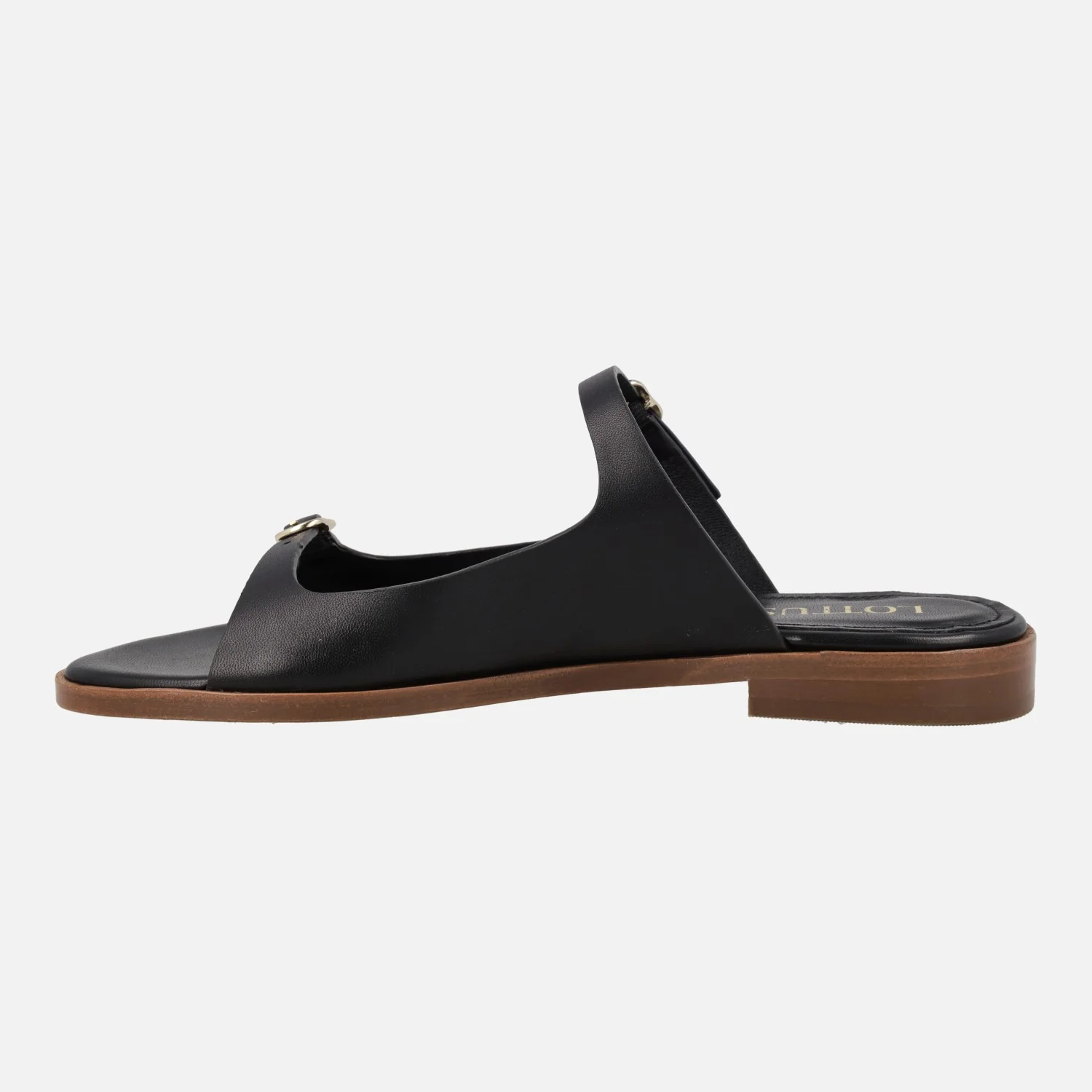 Preciosas y elegantes sandalias planas de la marca Lottusse, modelo SS01394 Nylo, color negro. Sandalias de piel con dos tiras ajustables con hebillas. Hebillas doradas. Forro y planta de piel. Suela de cuero, con una altura de aproximadamente 2 cms de tacón. Made in Spain.