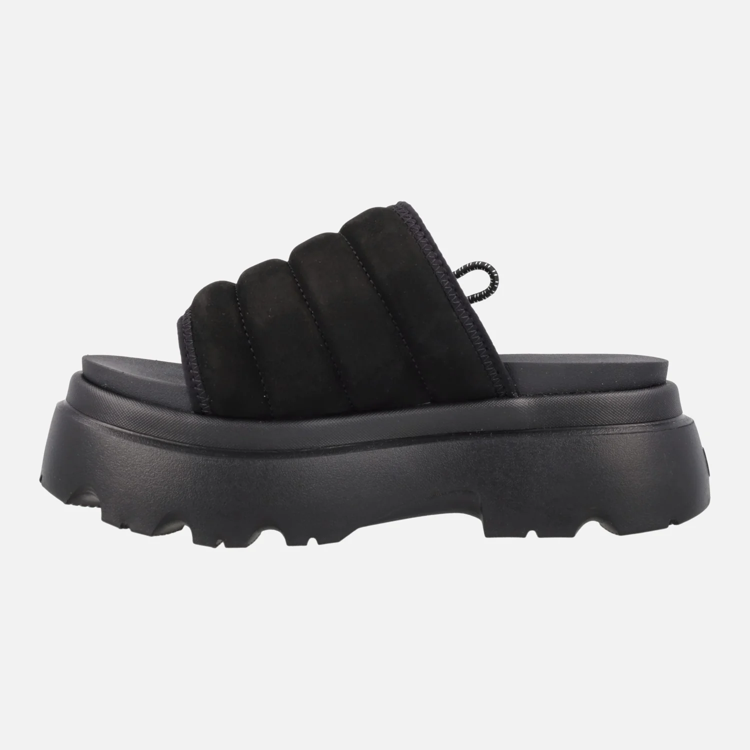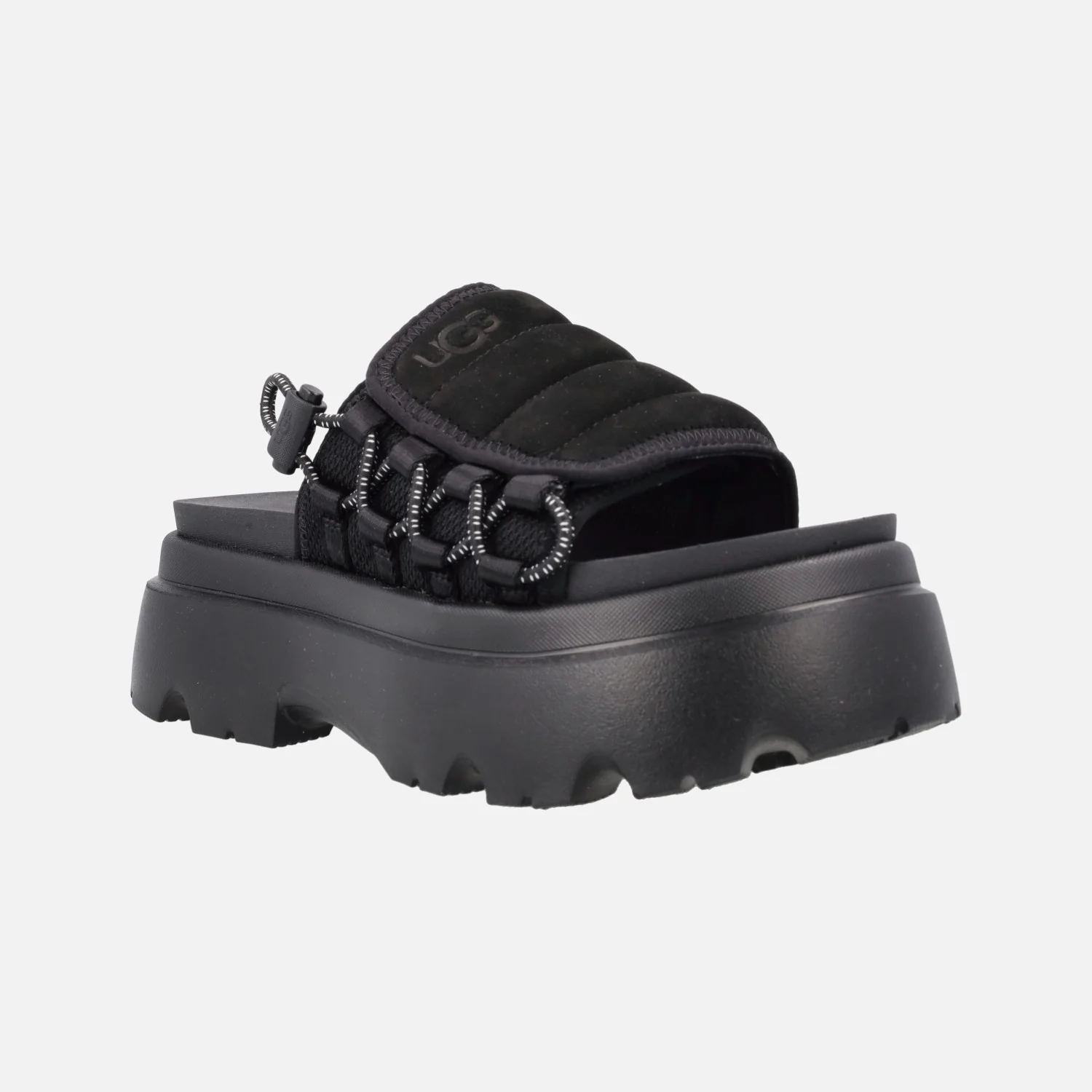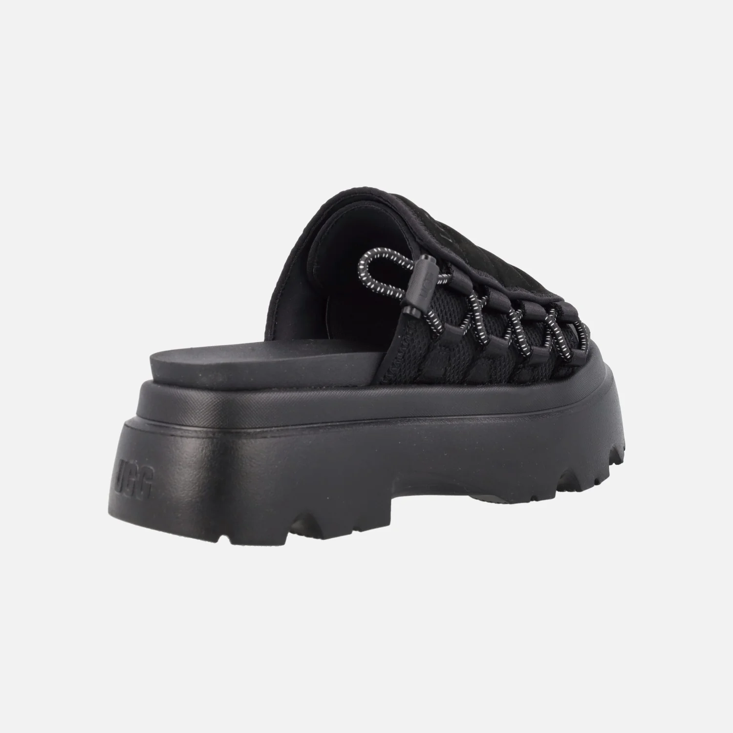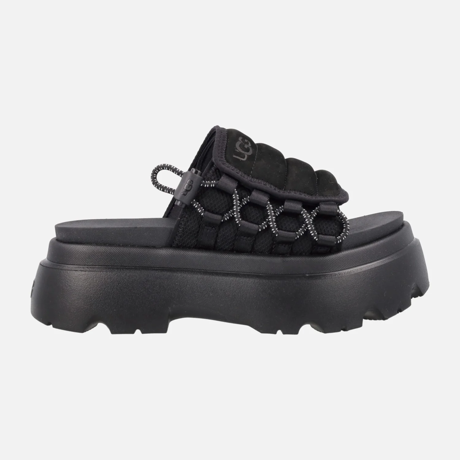 Sandalias estilo zuecos de la marca UGG modelo Callie Black 1152697. Sandalias elaboradas en piel nobuck negro y tejido malla, con detalle de cordón elástico ajustable en el lateral. Forro en tejido malla, planta de EVA. Piso muy ligero, en EVA Sugarsole (proviene de la caña de azúcar). Altura trasera 6 cms (5 cms en la parte delantera).