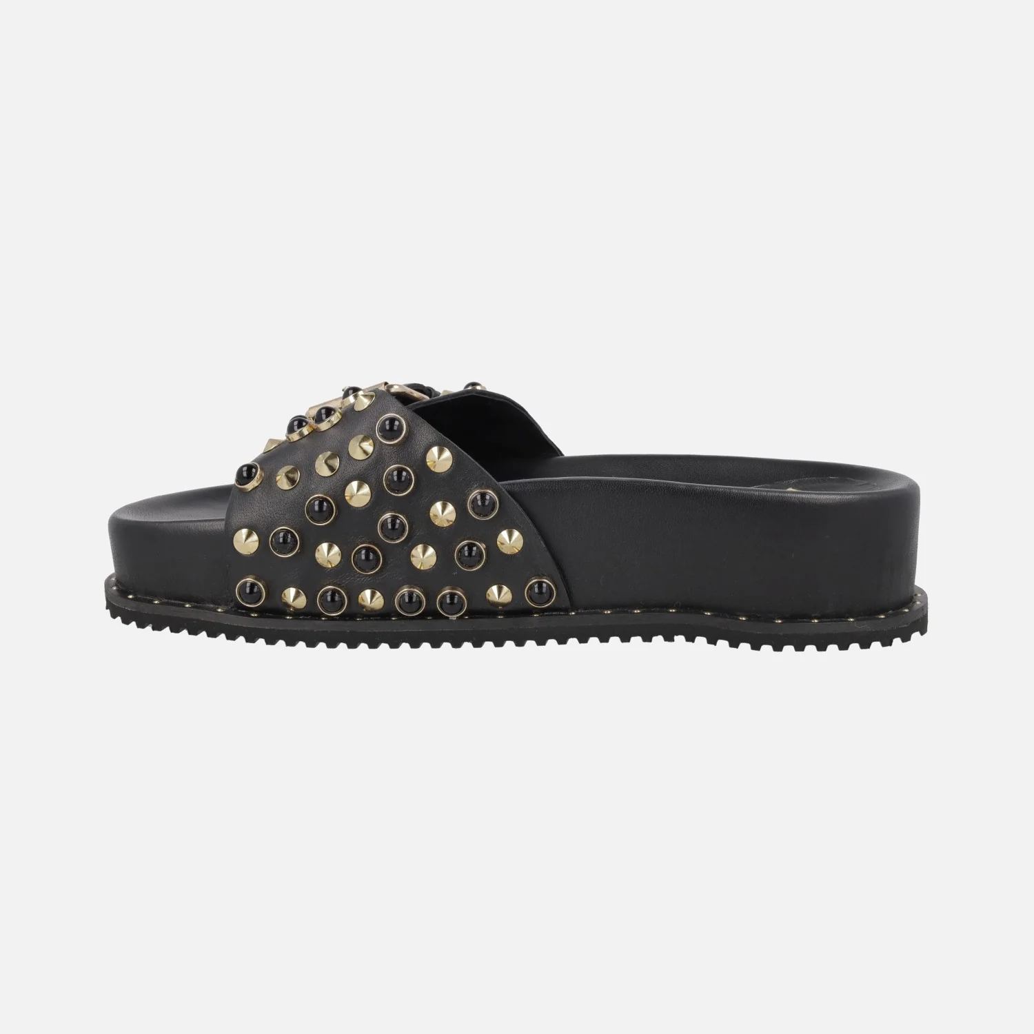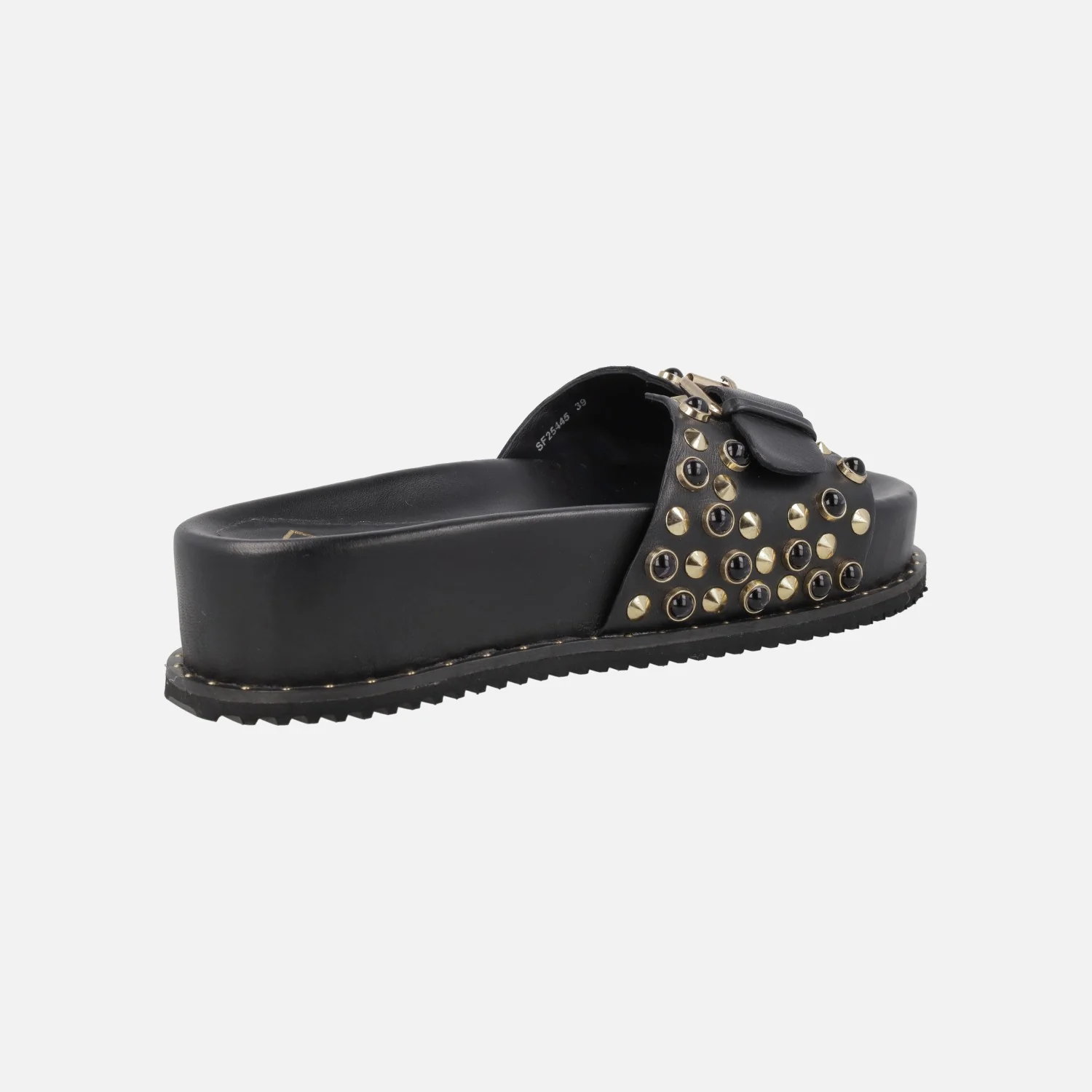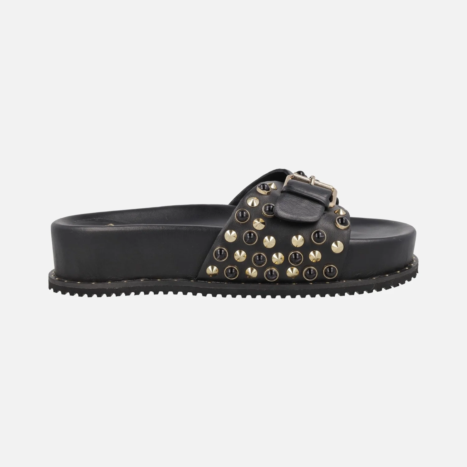 Sandalias pala con cierre de hebilla y remaches negros y dorados