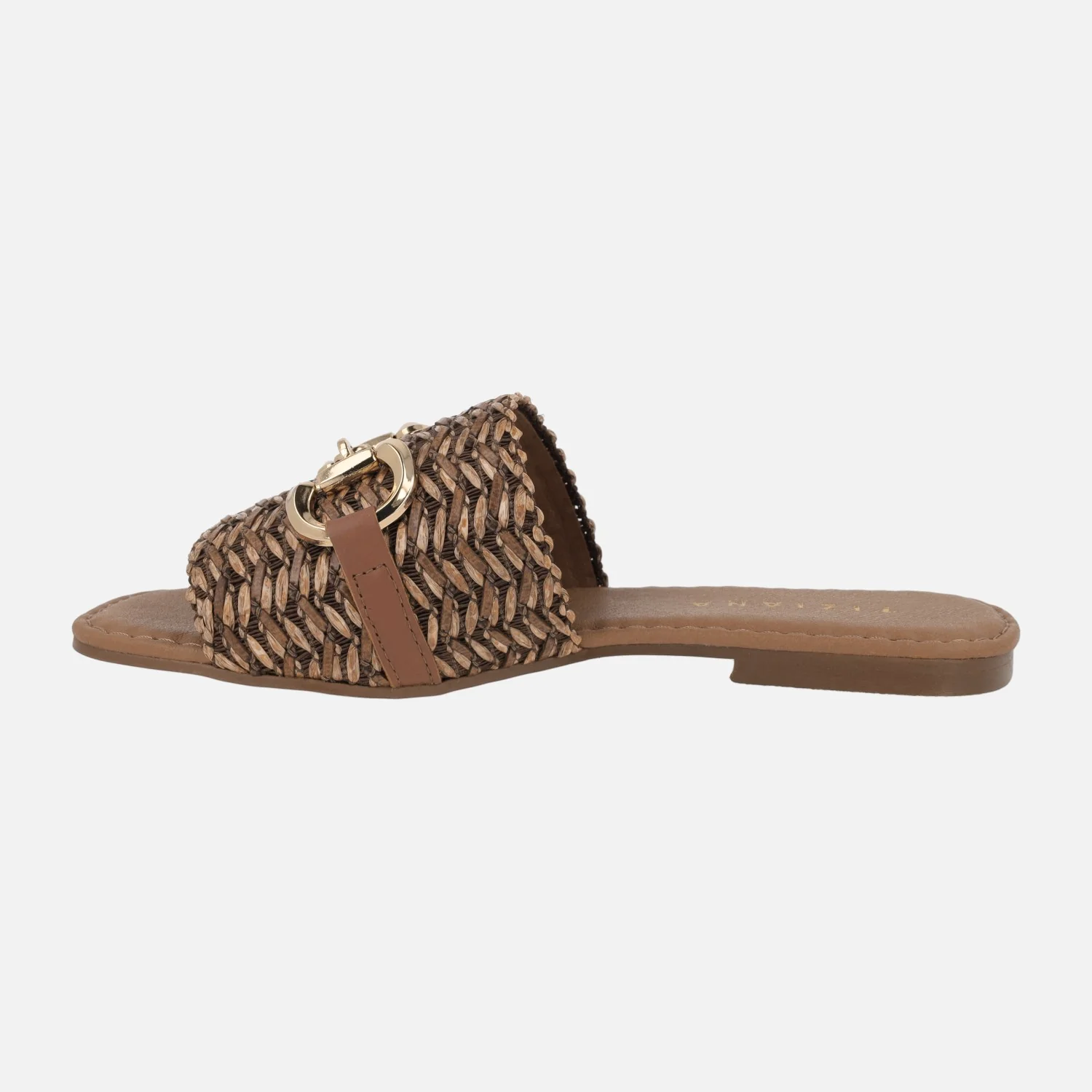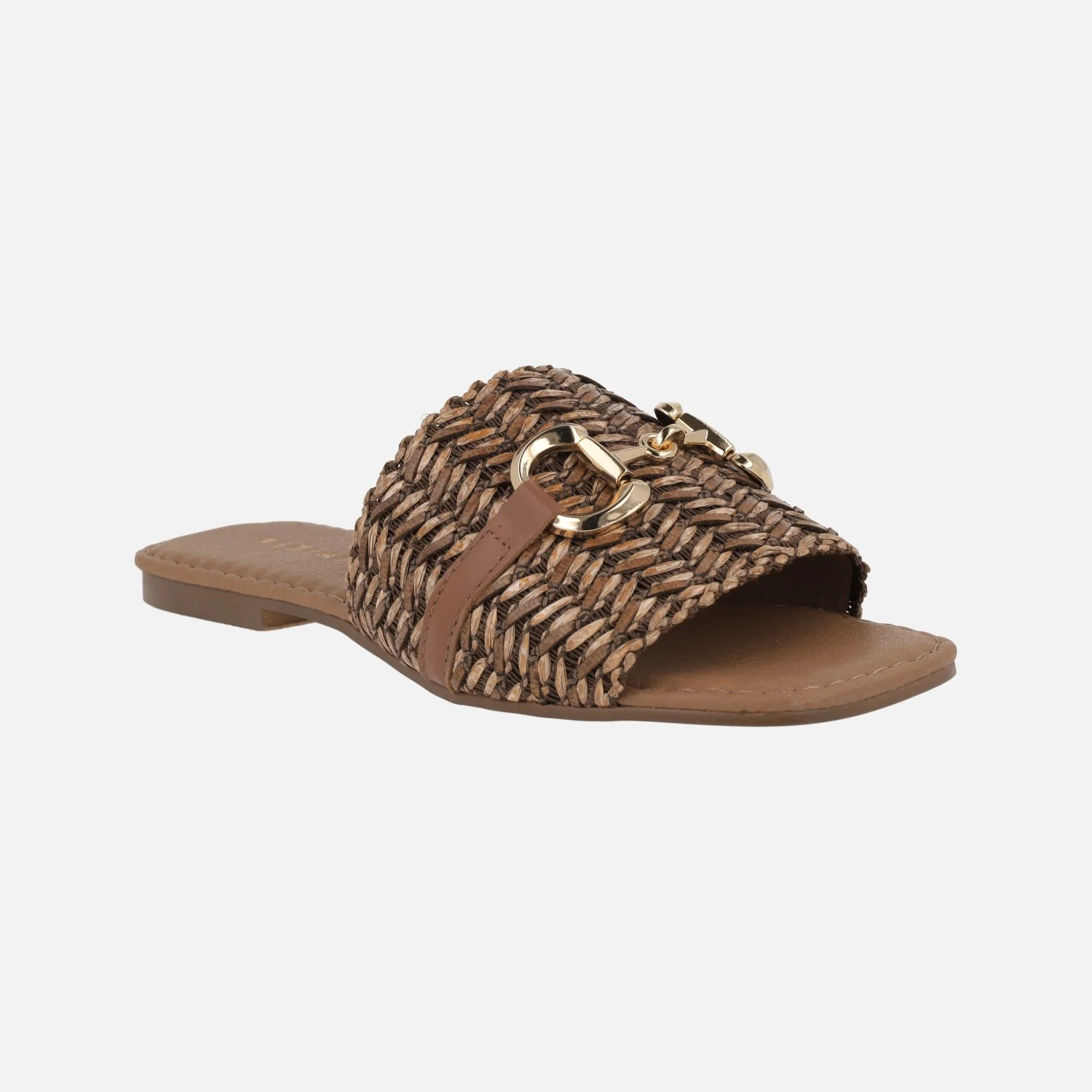 Sandalias palas en rafia trenzada con adorno metálico dorado