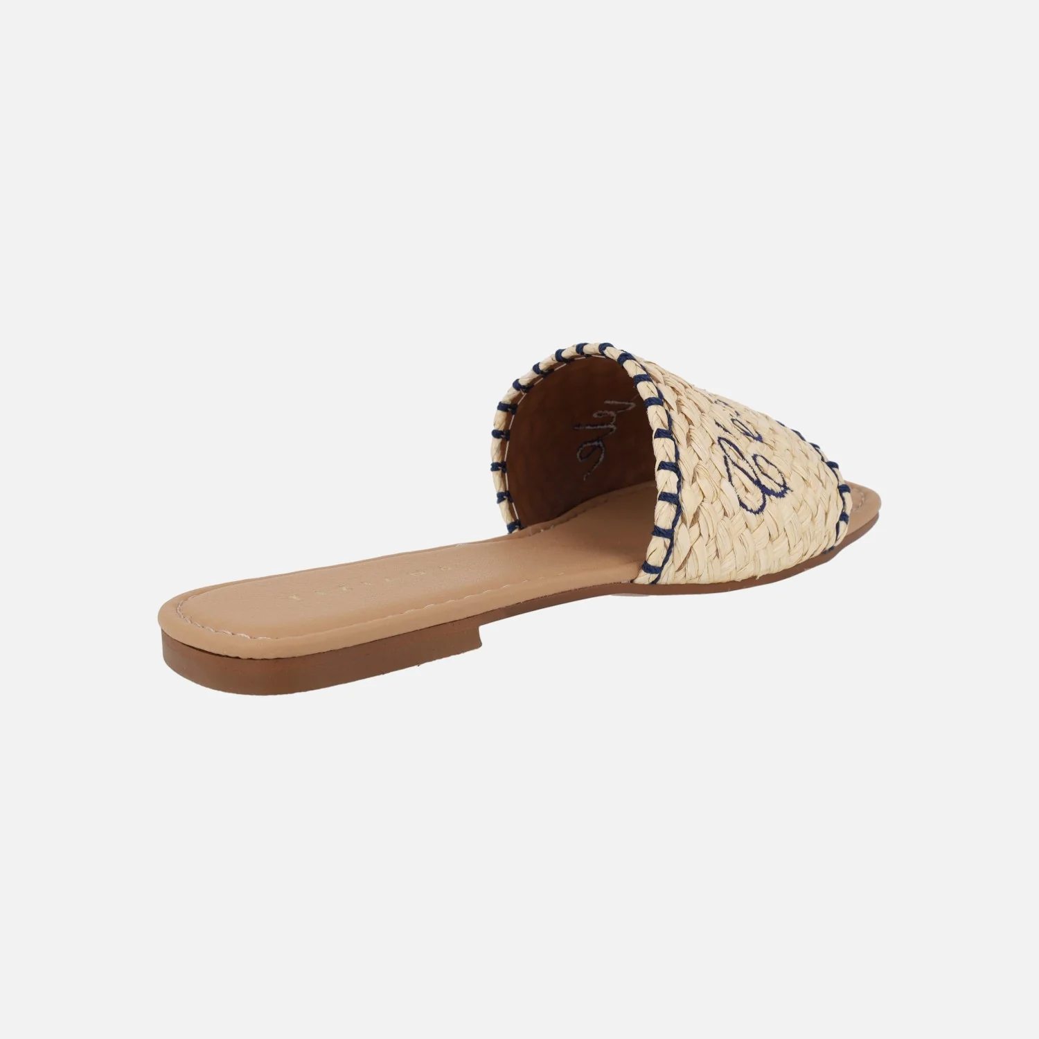 Sandalias planas para mujer de la marca española Tiziana, modelo 1027 Beige. Palas elaboradas en tejido rafia trenzado en color beige, con pespunteados y mensaje «C’est la vie» contrastado en azul. Interiores en materiales sintéticos. Piso plano, de apenas 1,5 cms de altura. Made in Spain.