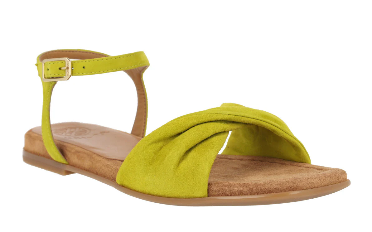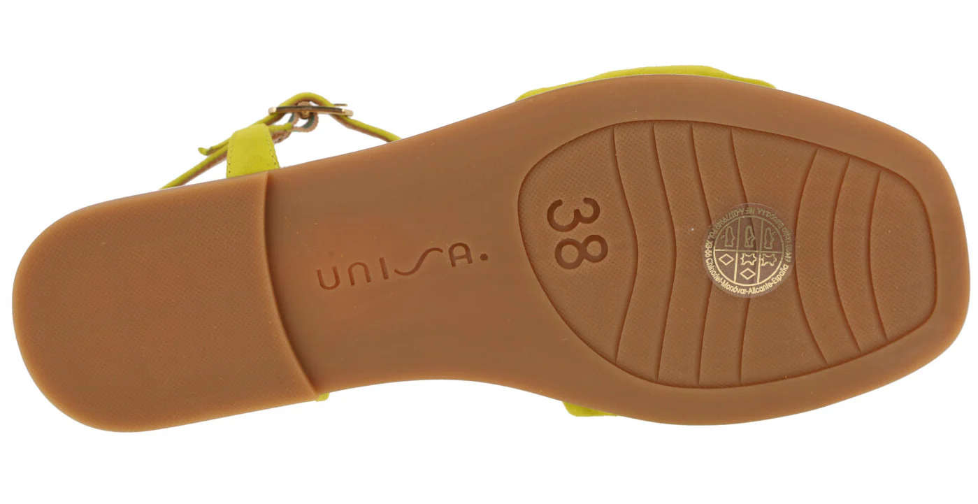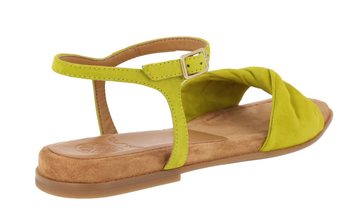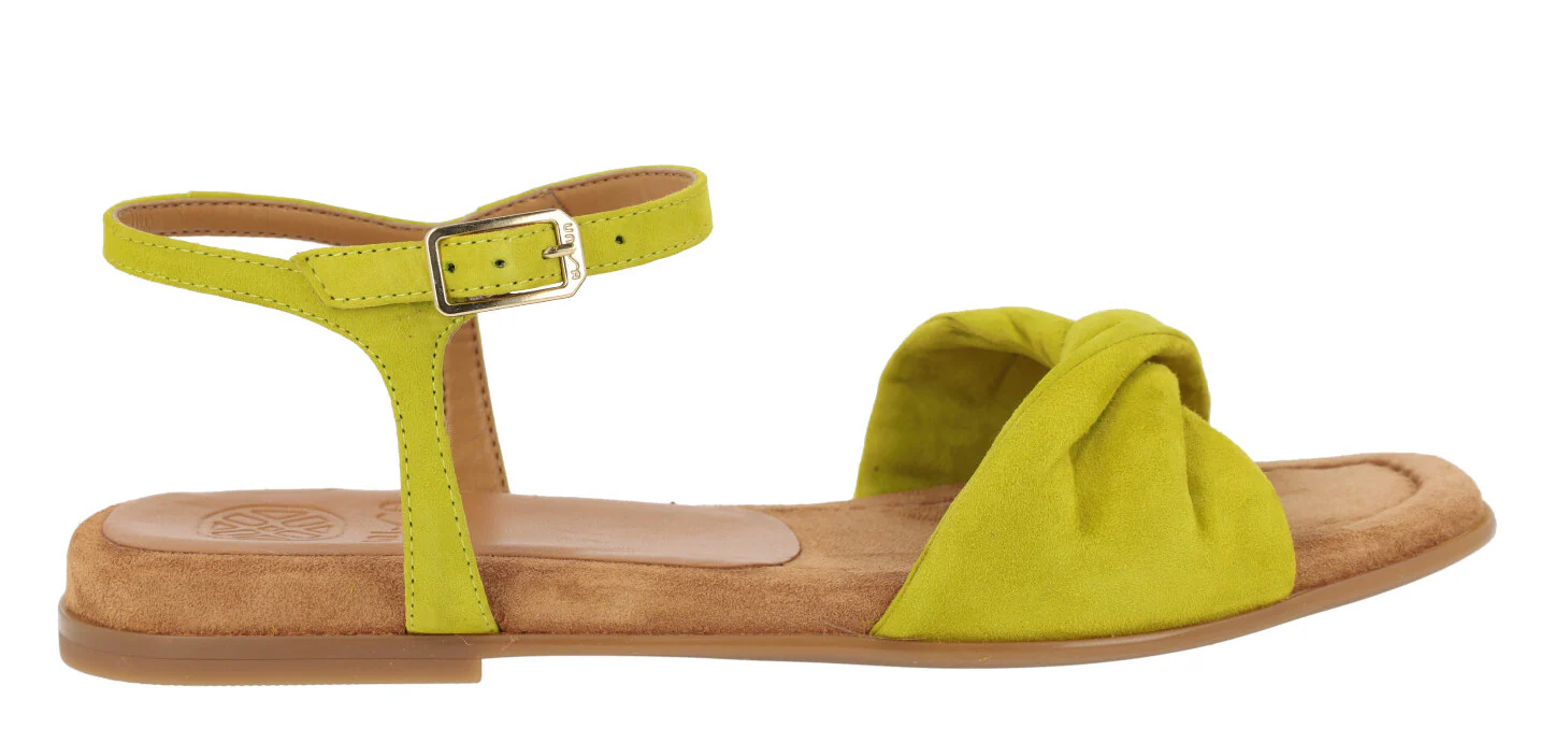 Preciosas sandalias de piel de la marca Unisa modelo Cerín, disponibles en color kiwi (verde lima) o skin (beige). Sandalias de ante lima o piel beige, con pala ancha fruncida y pulsera al tobillo con cierre de hebilla. Interior mixto que combina piel y sintéticos. Planas, con piso de goma y una altura en la parte trasera de 2 cms.