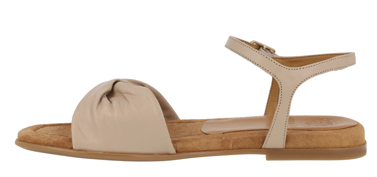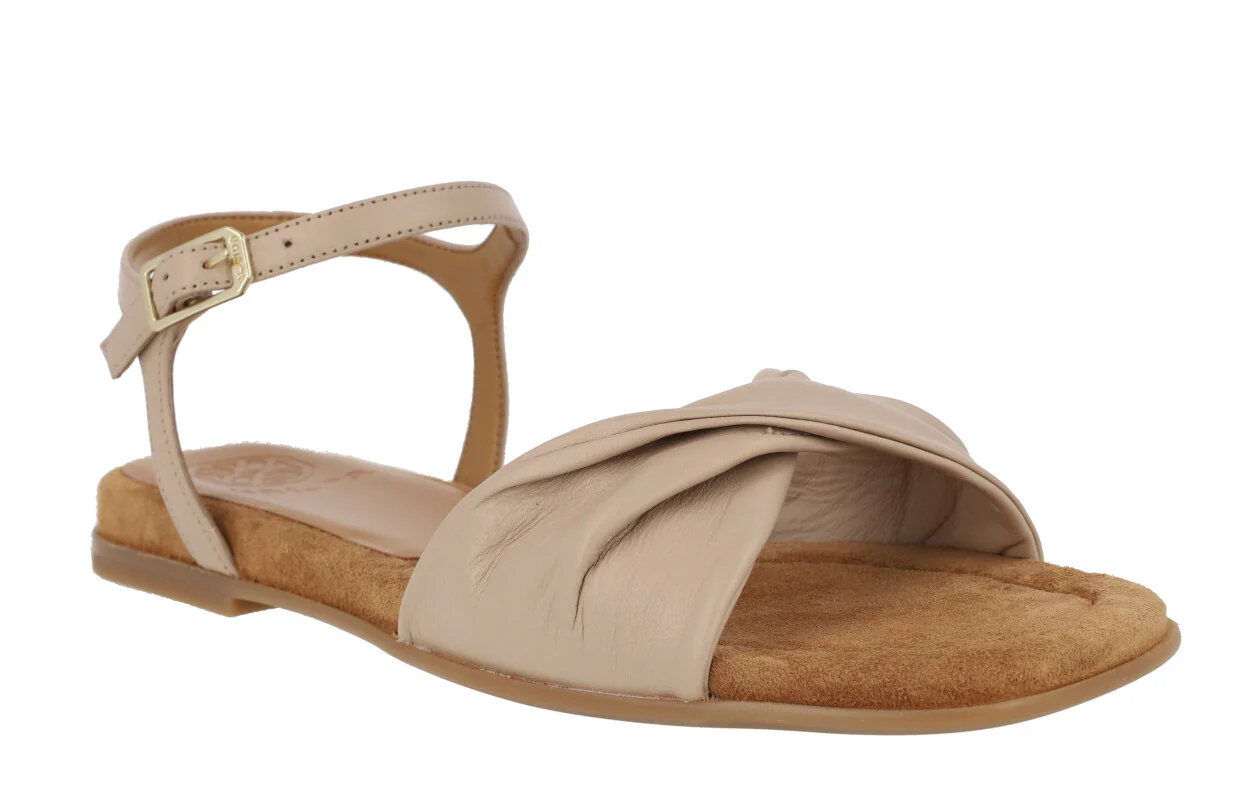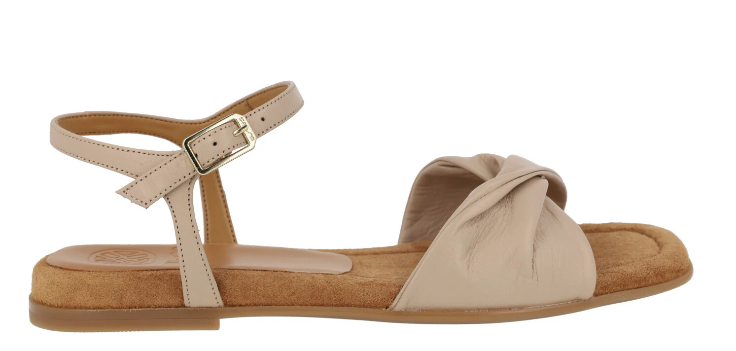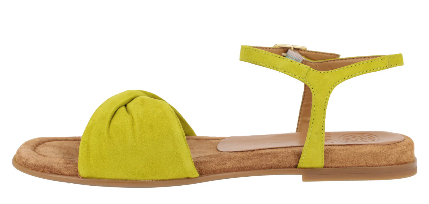 Preciosas sandalias de piel de la marca Unisa modelo Cerín, disponibles en color kiwi (verde lima) o skin (beige). Sandalias de ante lima o piel beige, con pala ancha fruncida y pulsera al tobillo con cierre de hebilla. Interior mixto que combina piel y sintéticos. Planas, con piso de goma y una altura en la parte trasera de 2 cms.