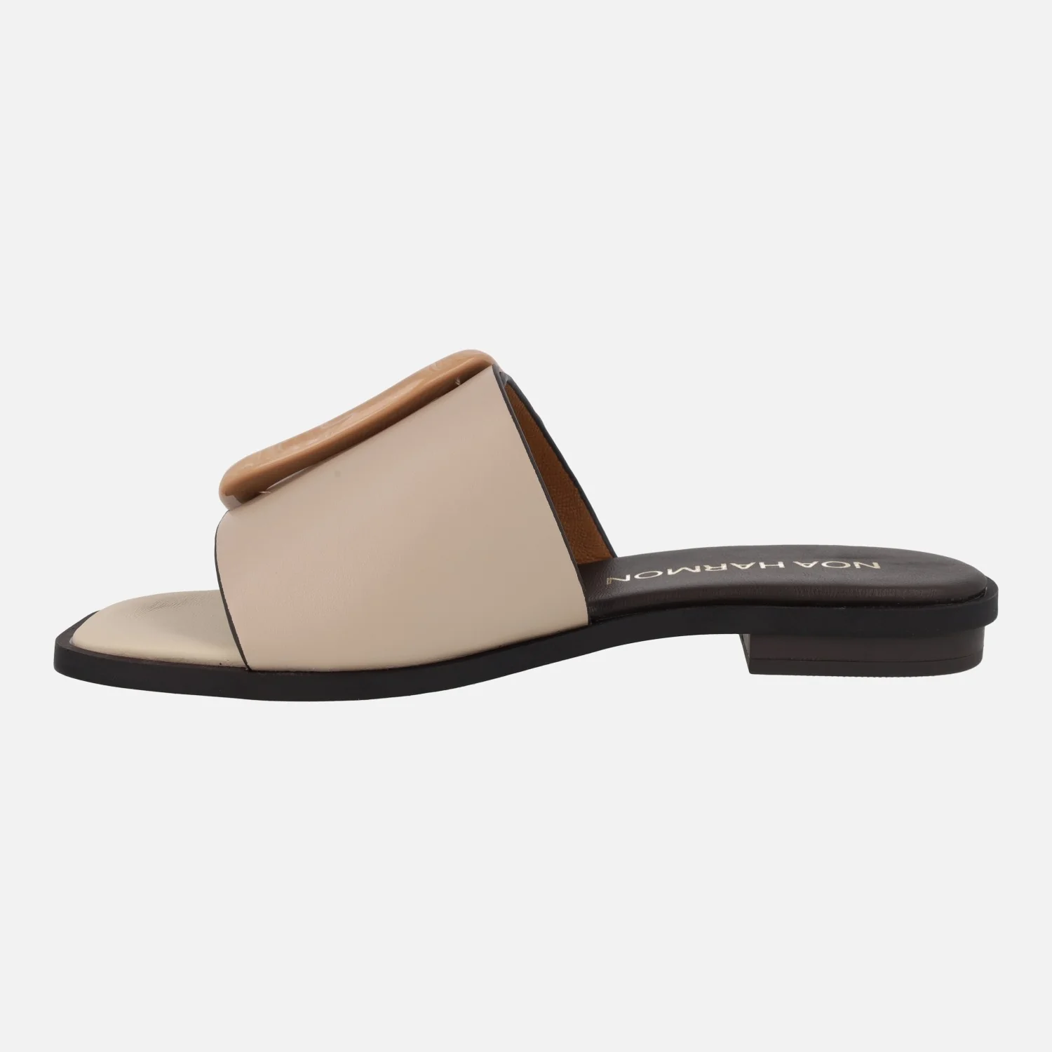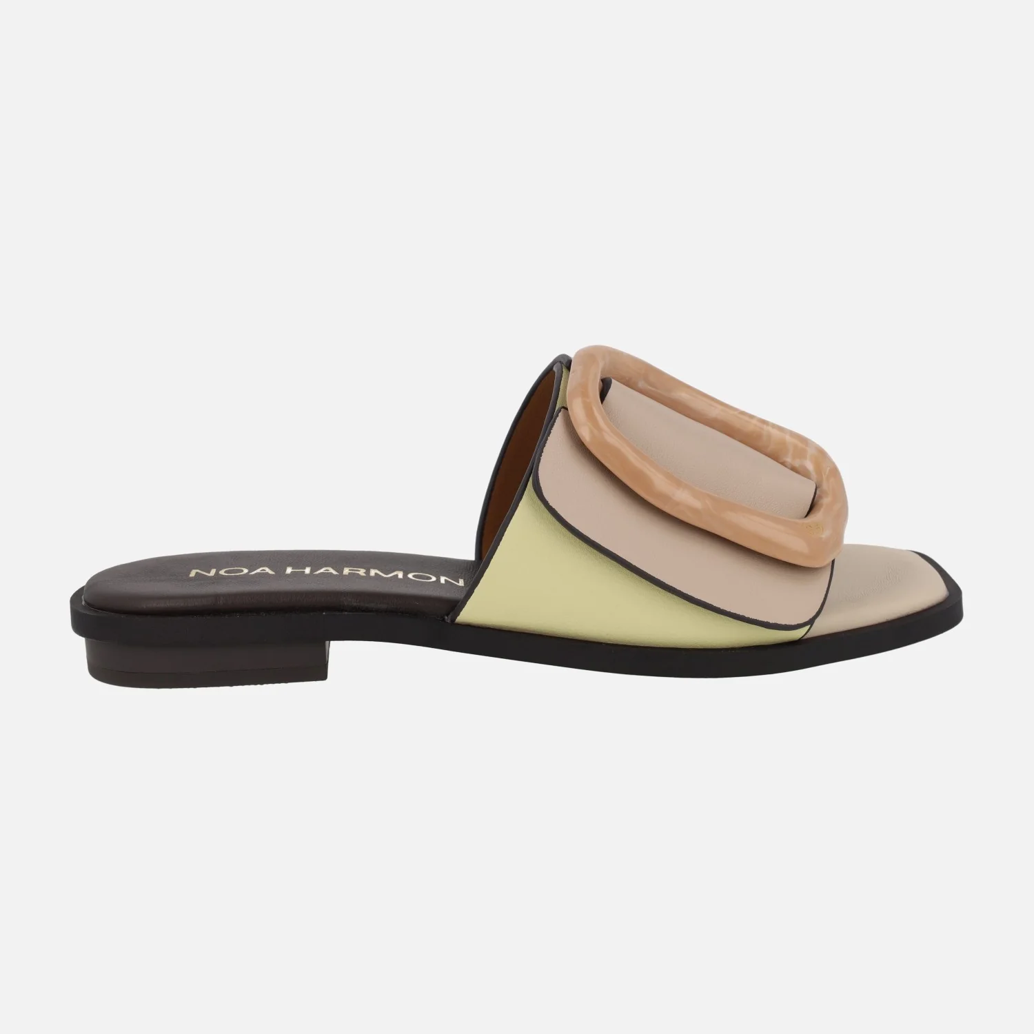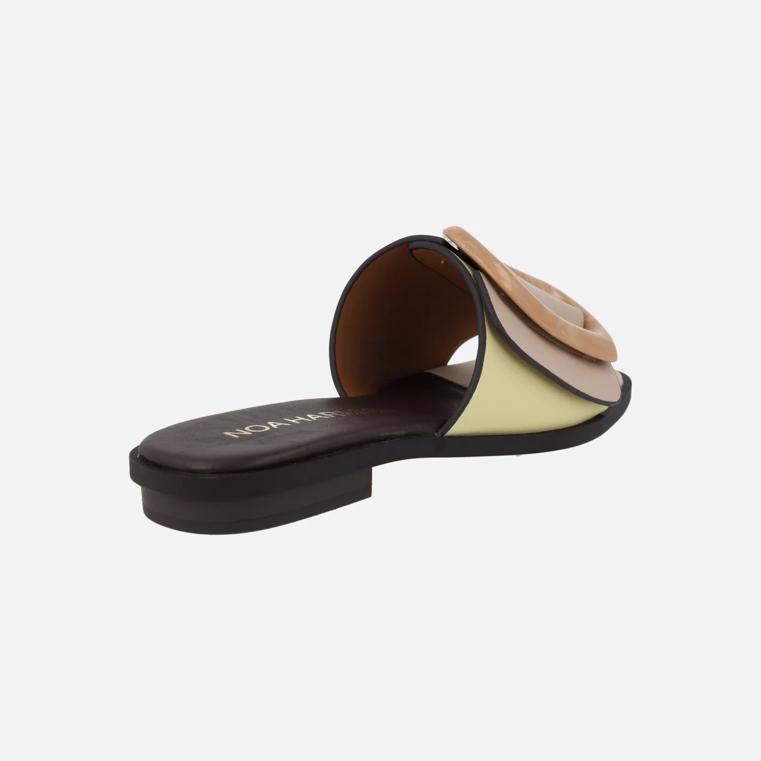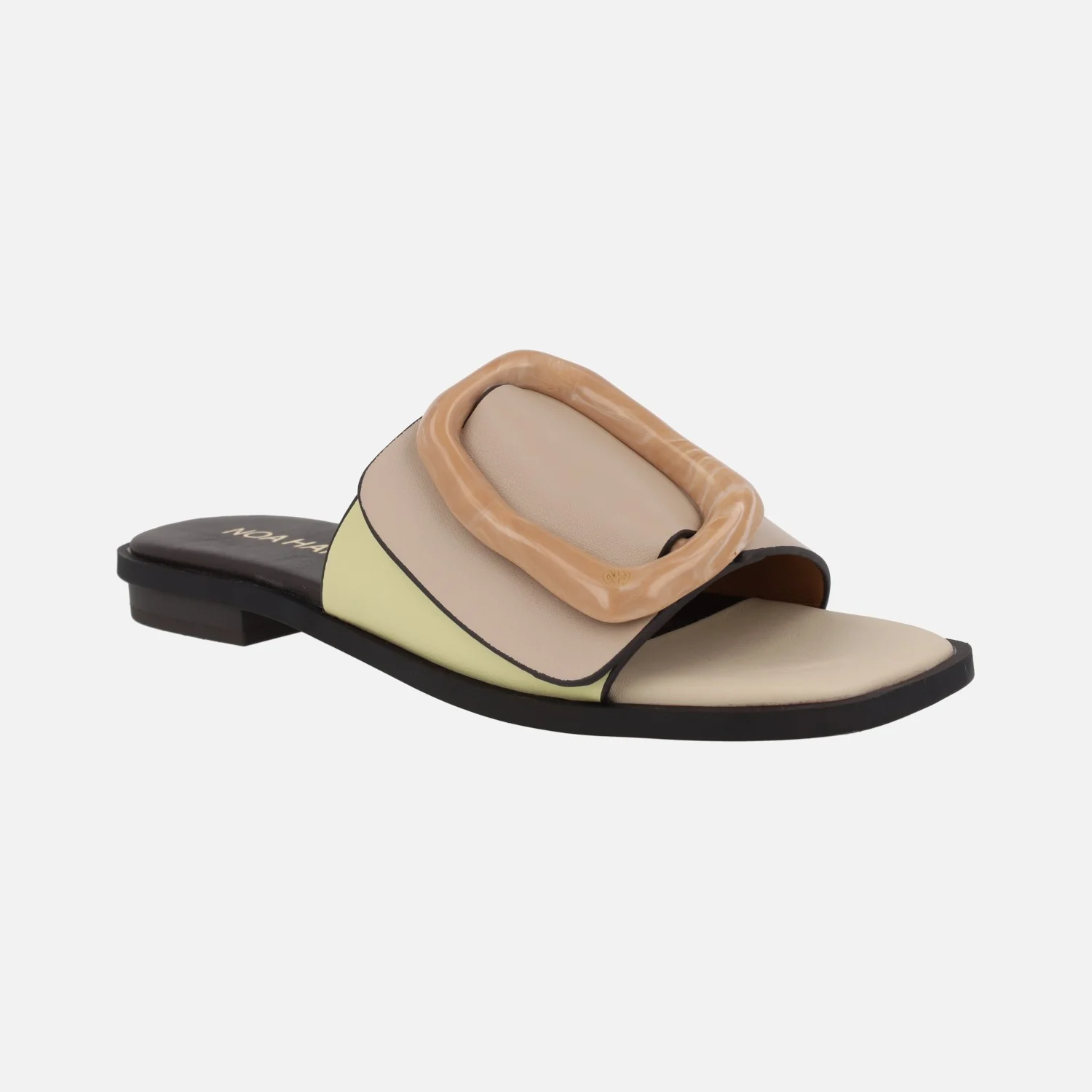 Sandalias estilo pala para mujer de la marca Noa Harmon, modelo 9679 en combinado beige/amarillo. Sandalias formadas por una pala ancha de piel sintética, que combina beige y amarillo vainilla, con una hebilla irregular en camel. Forro y planta de piel. Piso plano, de 2,5 cms de altura.