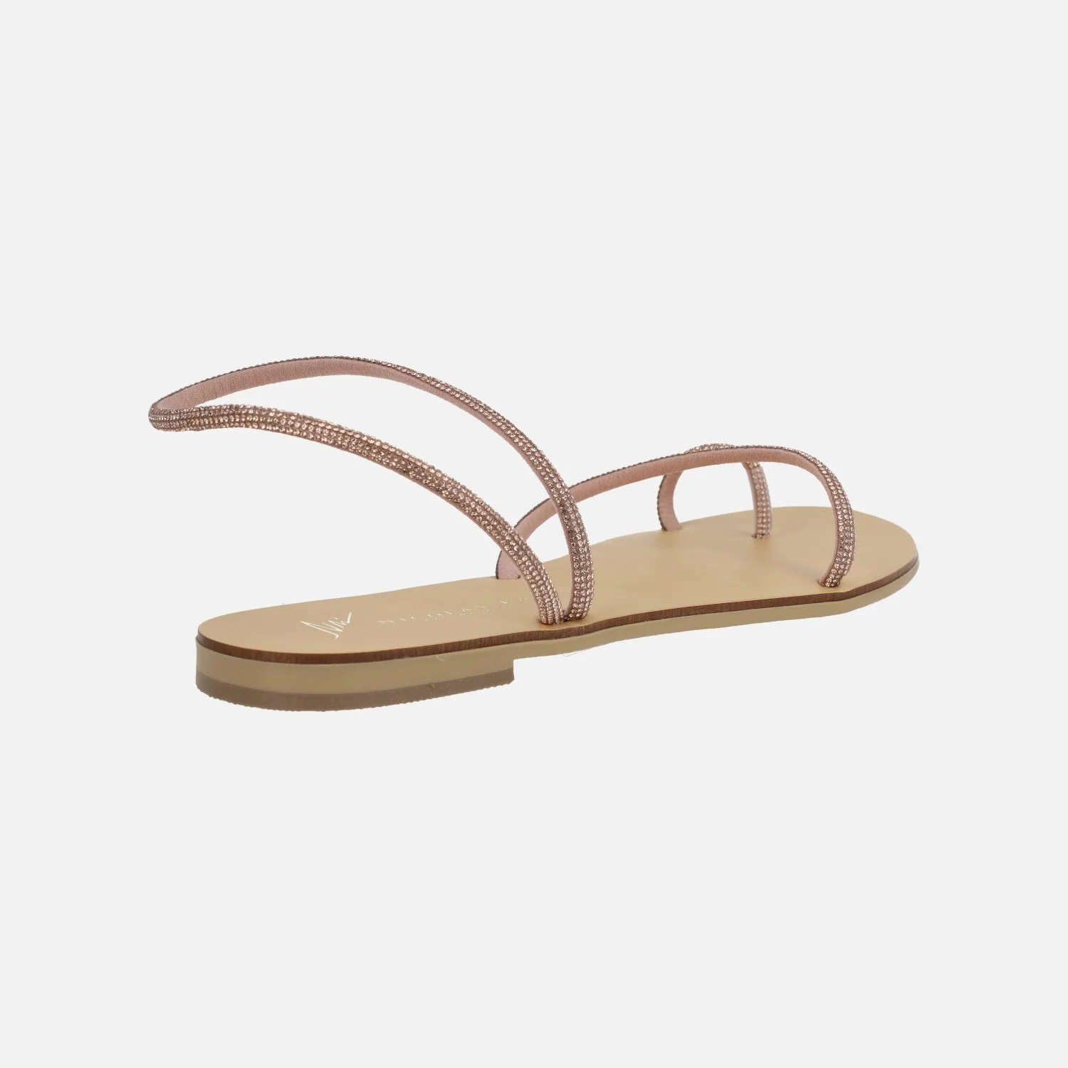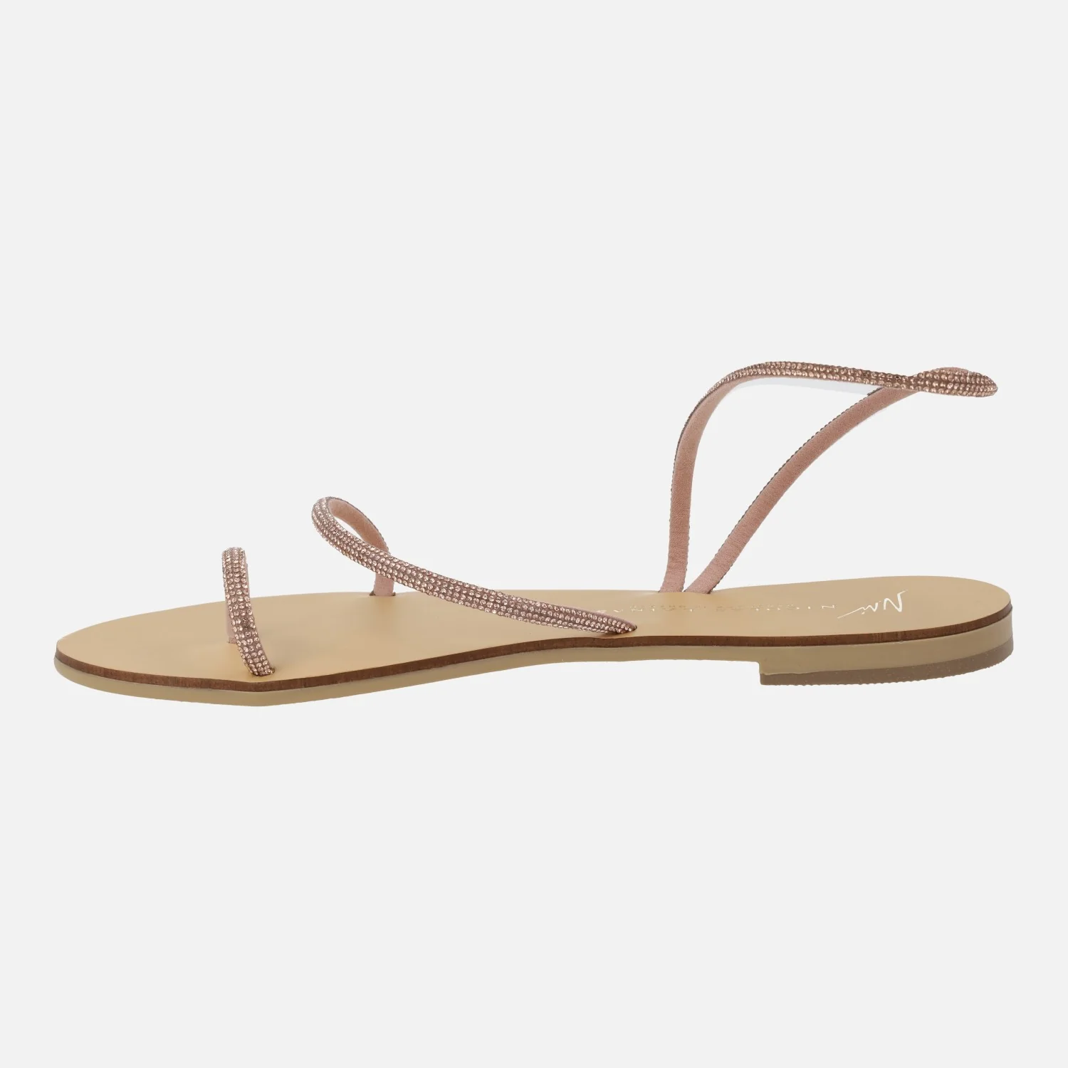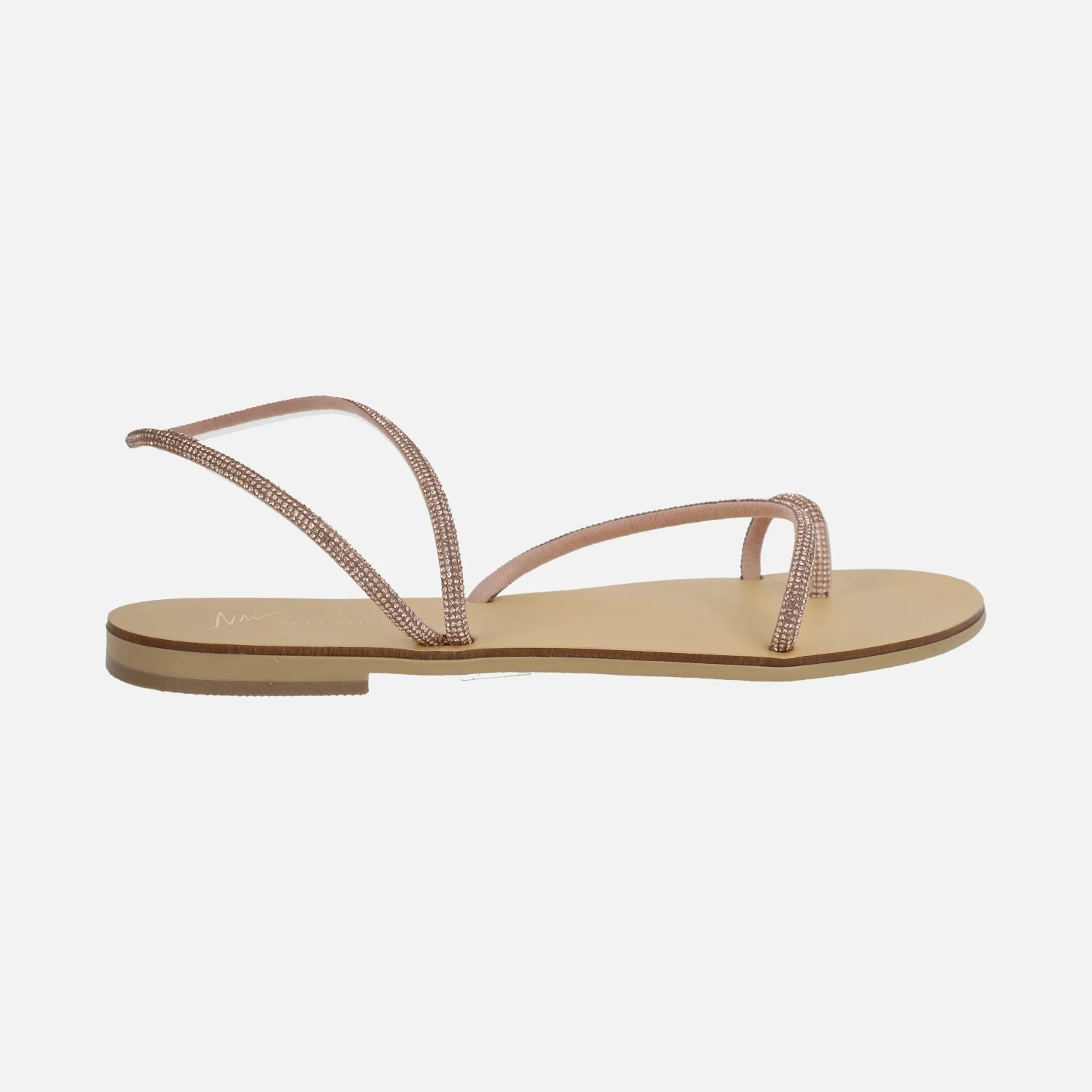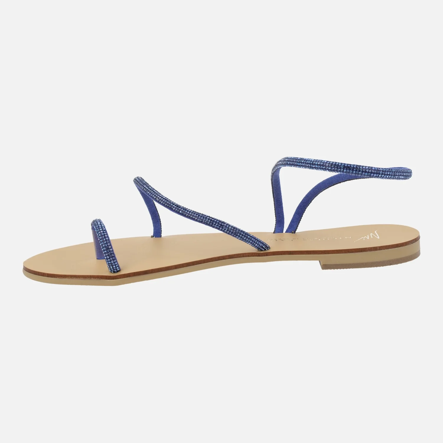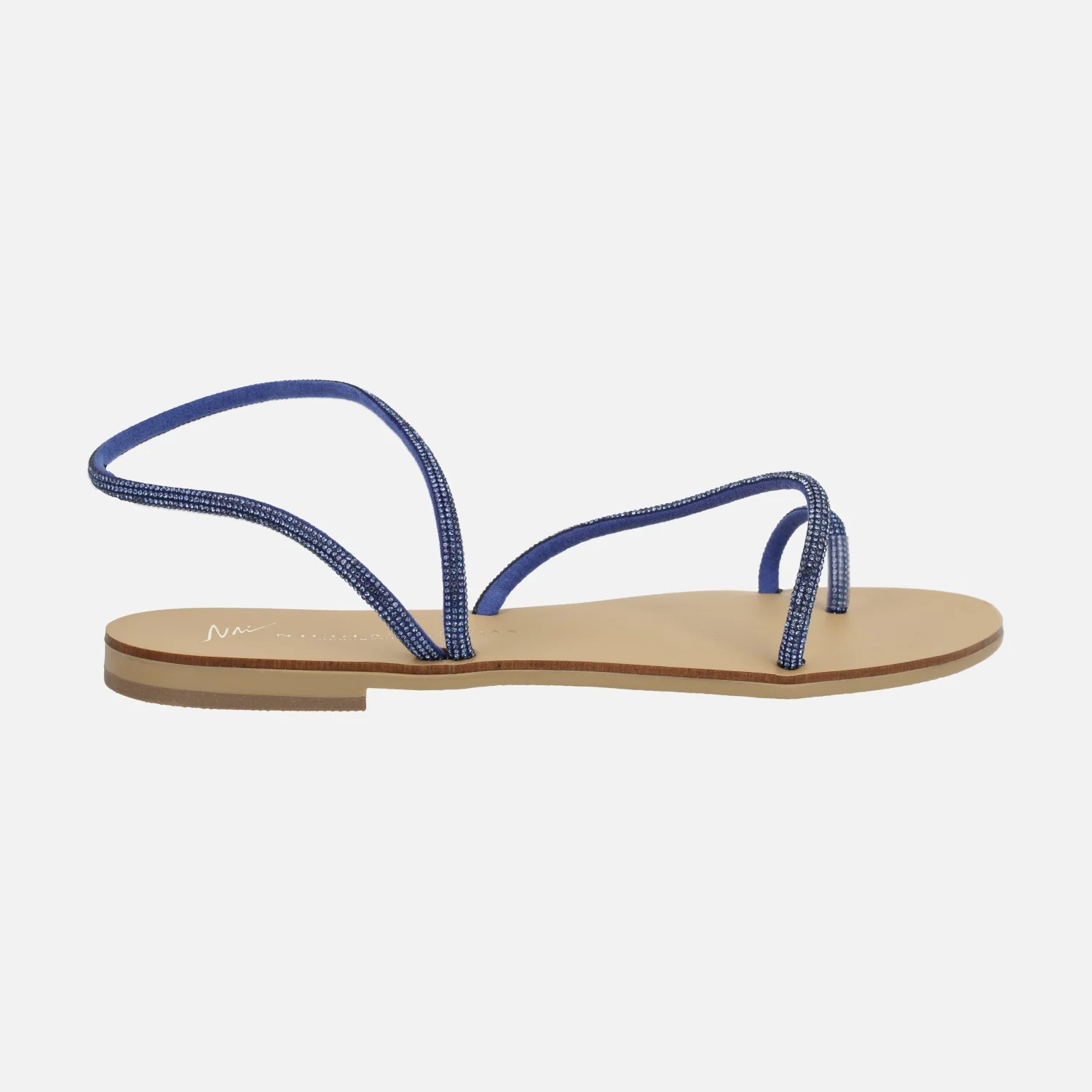 Preciosas sandalias planas modelo 63-TC de la marca Nicolás Lainas. Sandalias planas formadas por varias tiras con acabado de strass, disponibles en azul o cobre. Tiene tres tiras, una para el dedo, otra para el tobillo y otra al empeine. Interior mixto en piel y otros materiales. Piso plano, apenas 1 cm de altura.