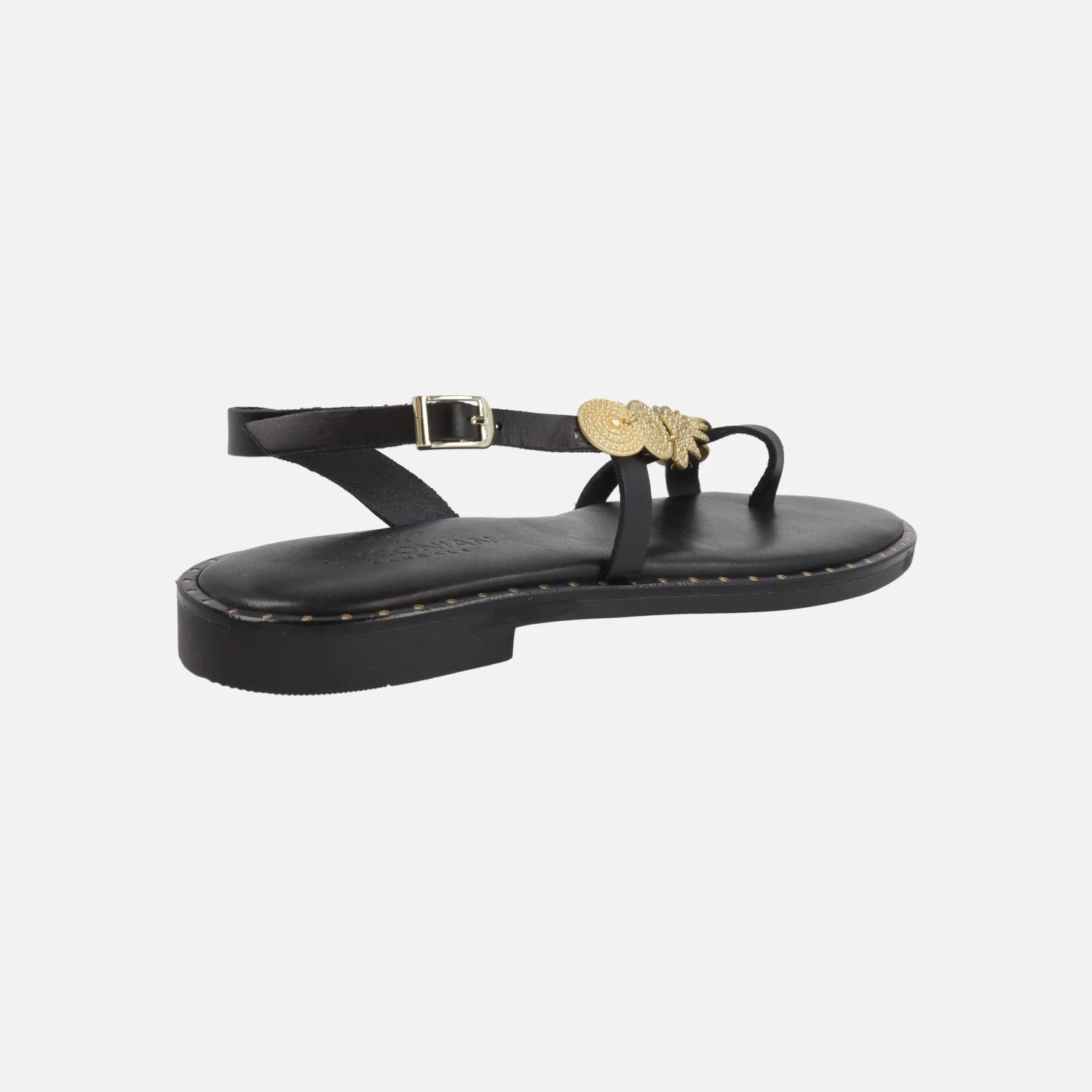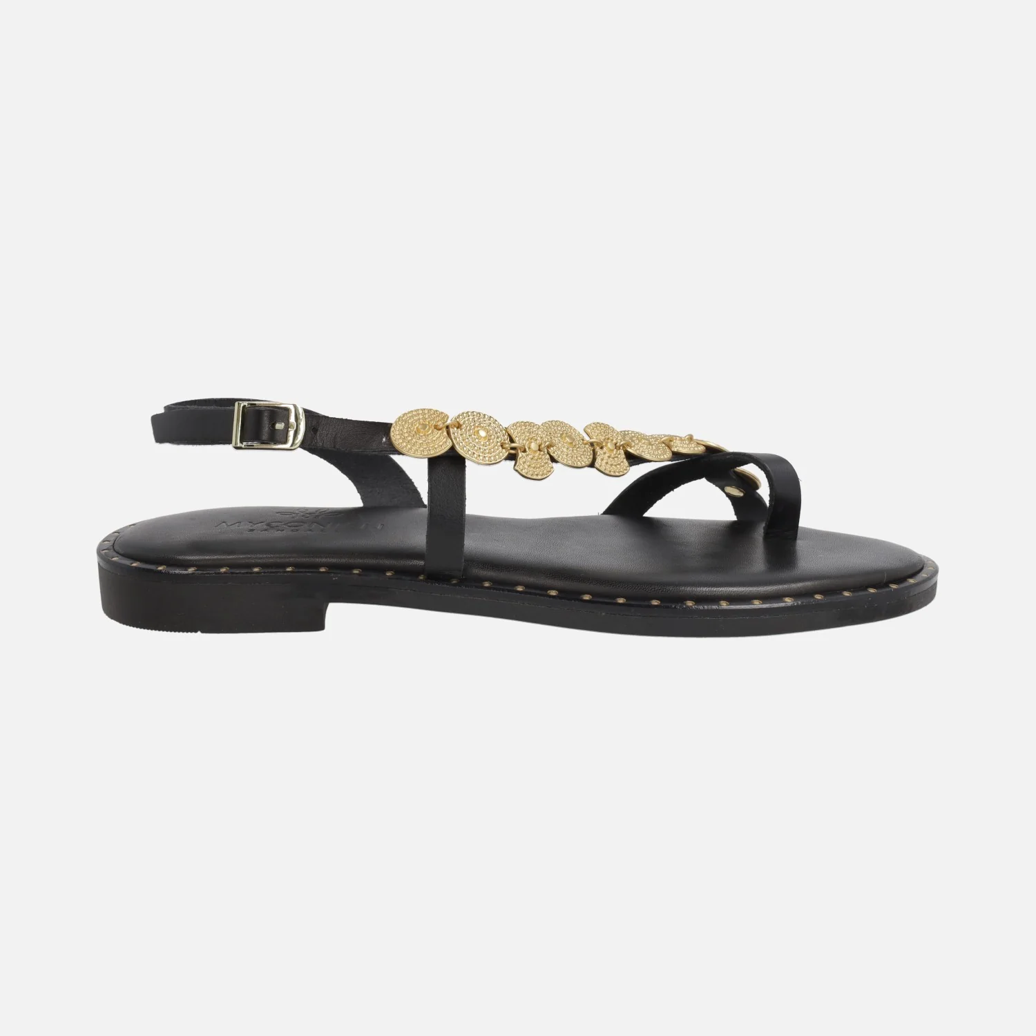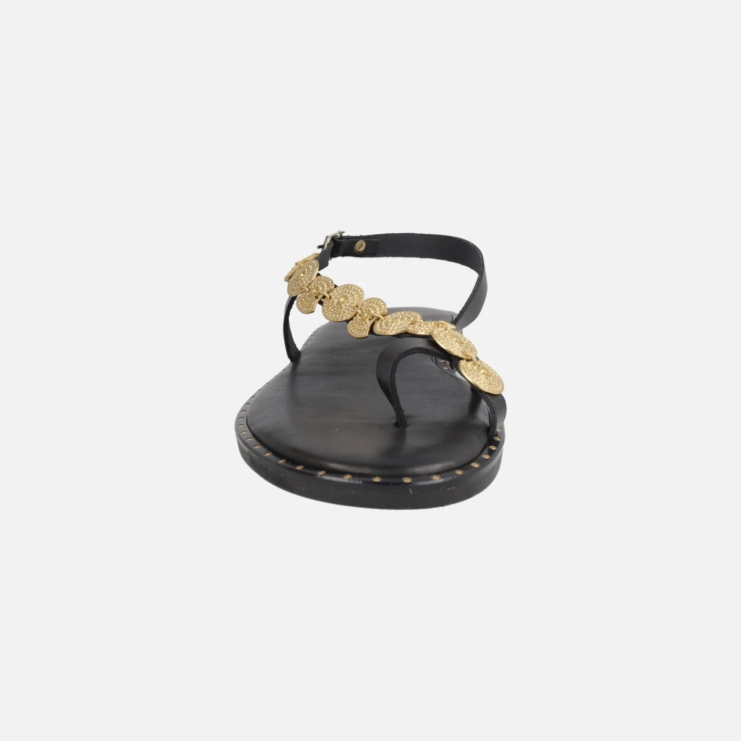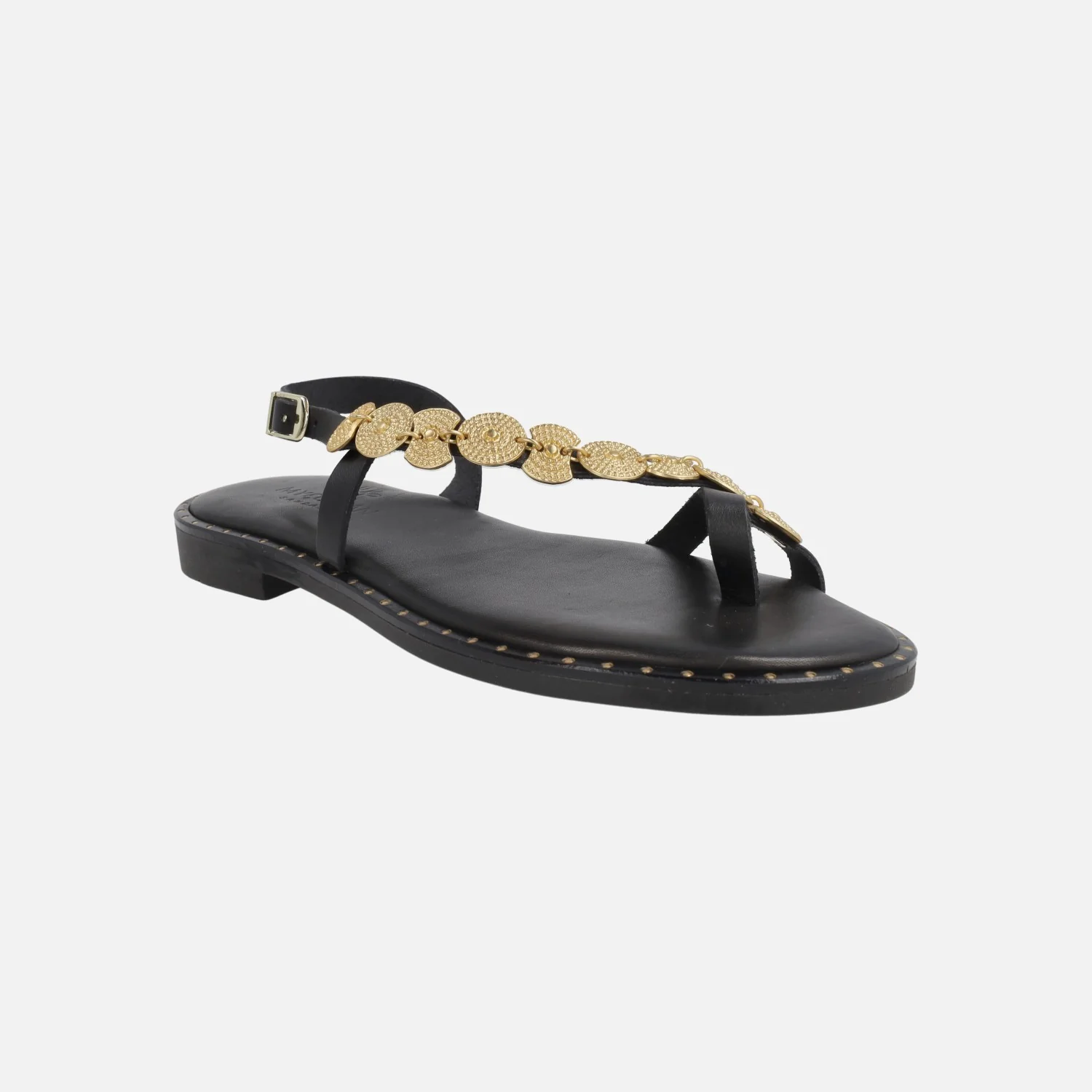 Sandalias planas de piel de la marca Myconian, modelo 221685, disponibles en negro y en marrón. Sandalias con pieza para dedo y cierre de hebilla al talón. Llevan adorno de tira con monedas doradas que sale de delante hacia atrás por el lateral exterior. Interior y plantillas de piel. Piso sintético con 2,5 cm de altura.