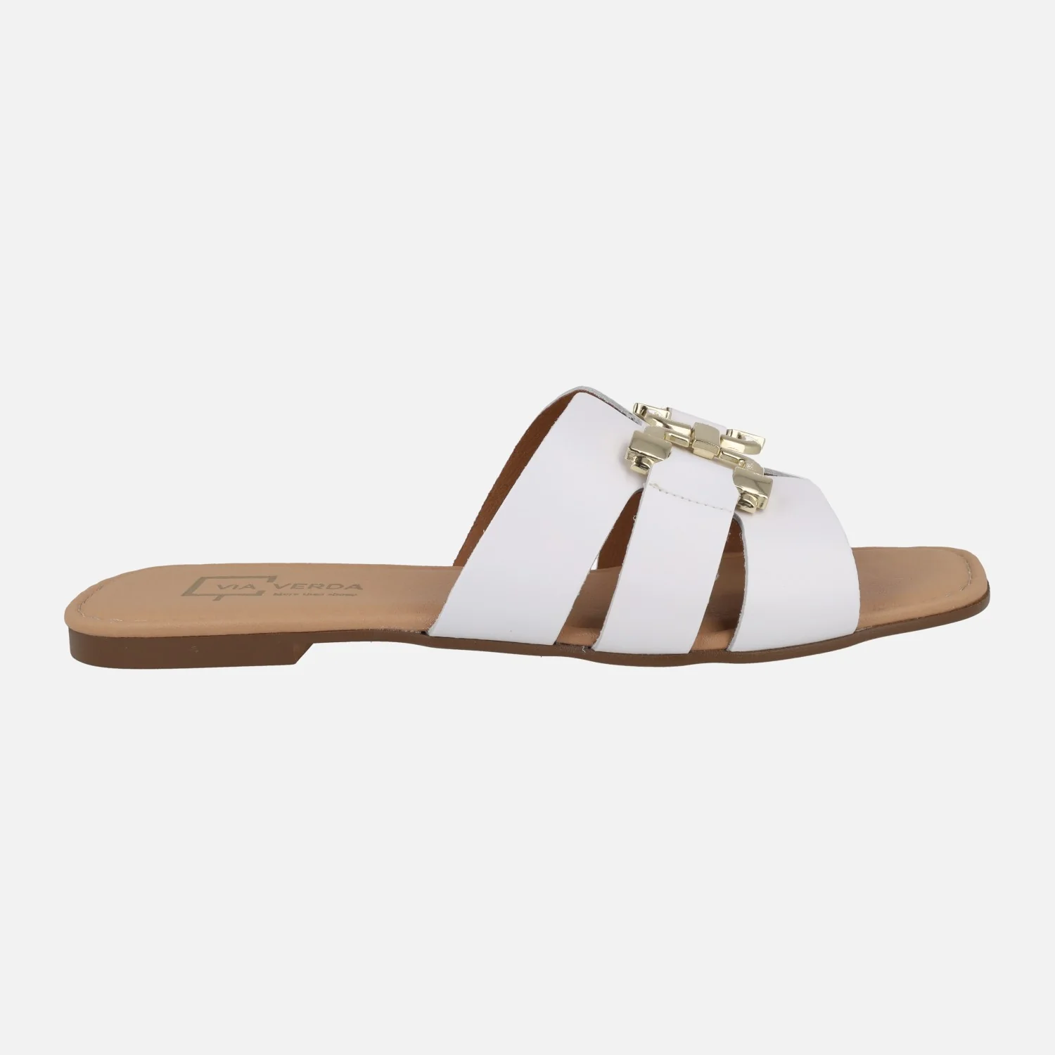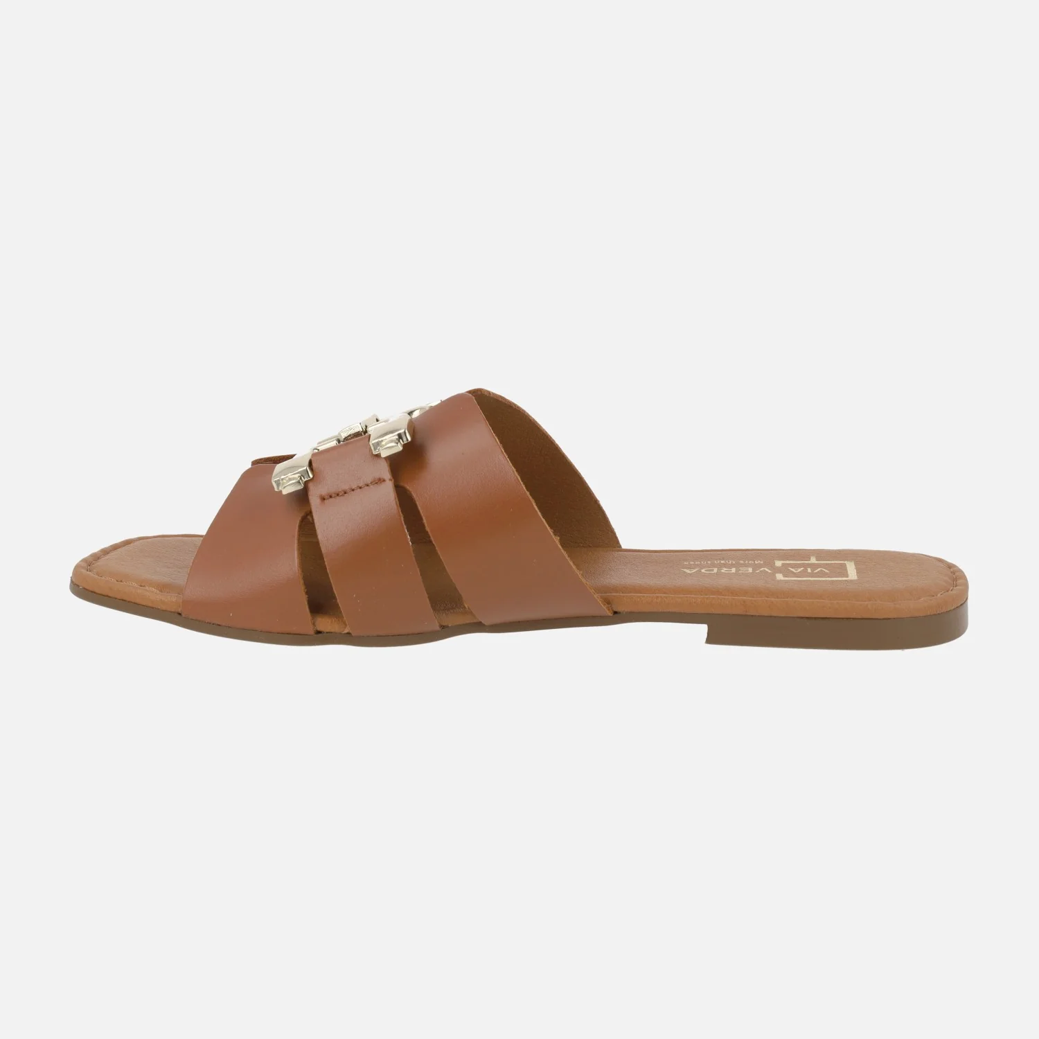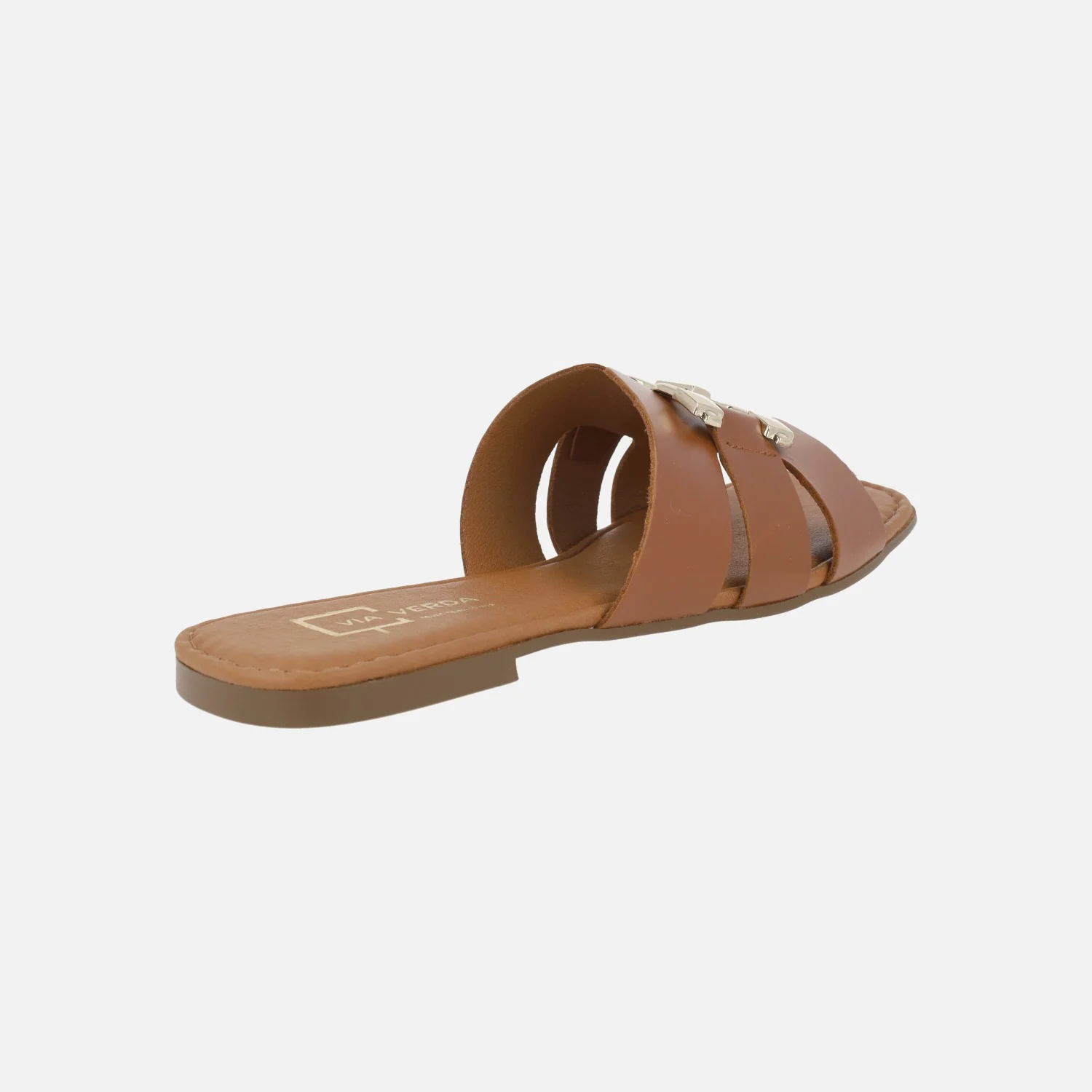 Sandalias planas de piel de la marca Via Verda, modelo 1024 Cuero. Sandalias planas de piel marrón cuero, con adorno metálico dorado en la parte superior. Interiores en combinado de piel y sintéticos. Piso plano de goma. Made in SPain.