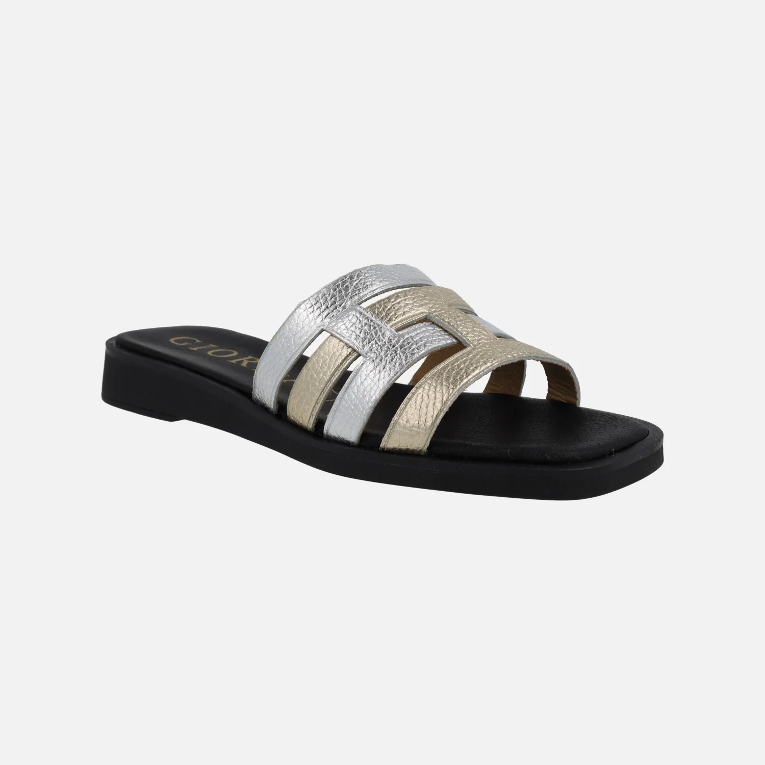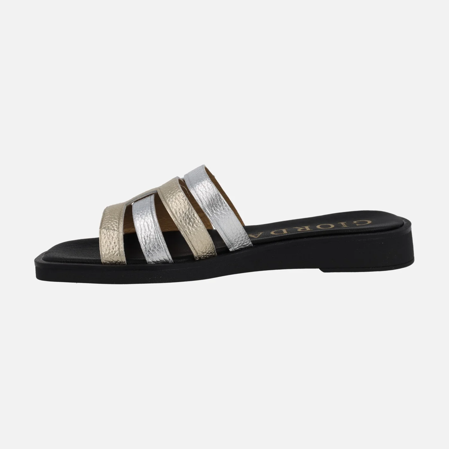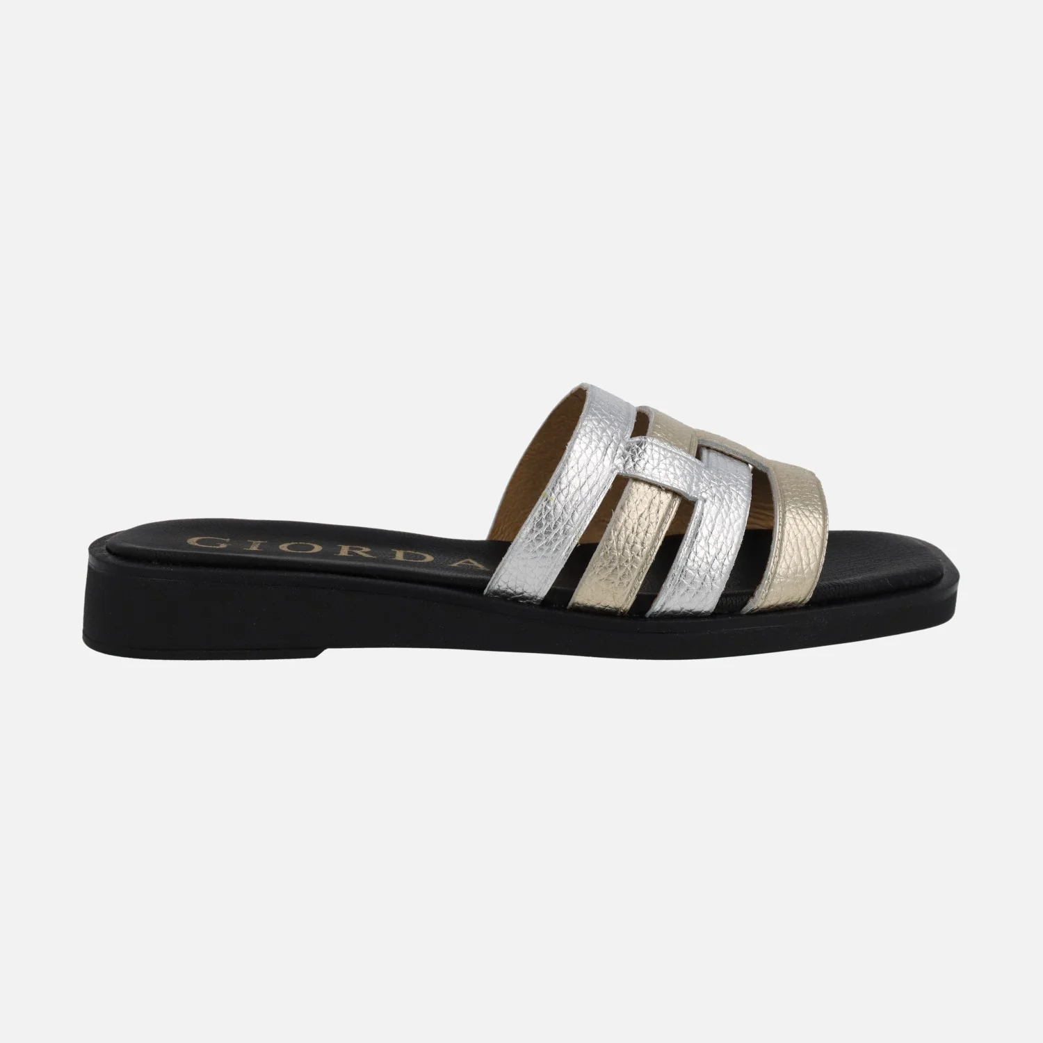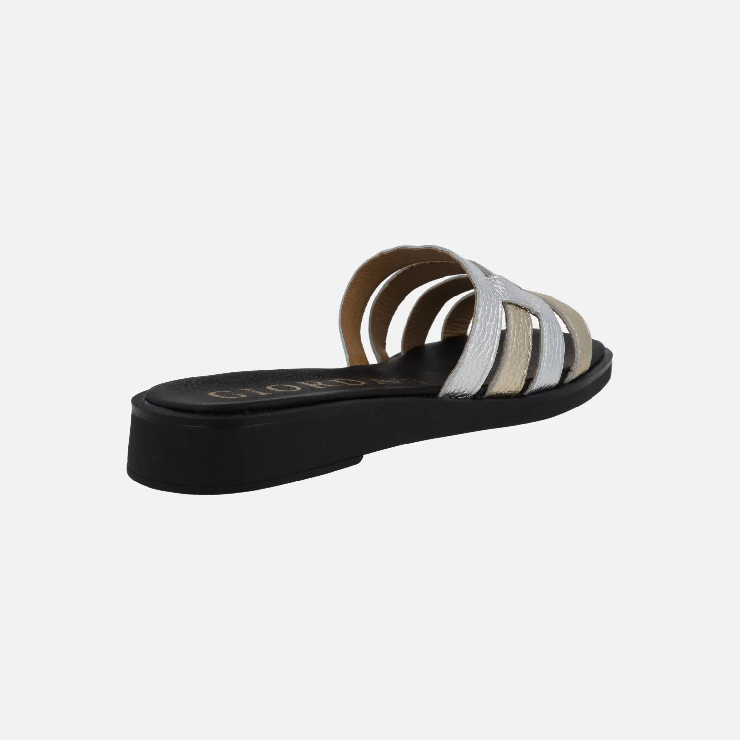 Elegantes sandalias de piel de la marca Giorda modelo SA16126 Plata-Platino. Sandalias de piel con tiras entrelazadas en metalizados plata – oro (platino). Forro y planta de piel. Piso sintético con 3 cms de altura trasera.