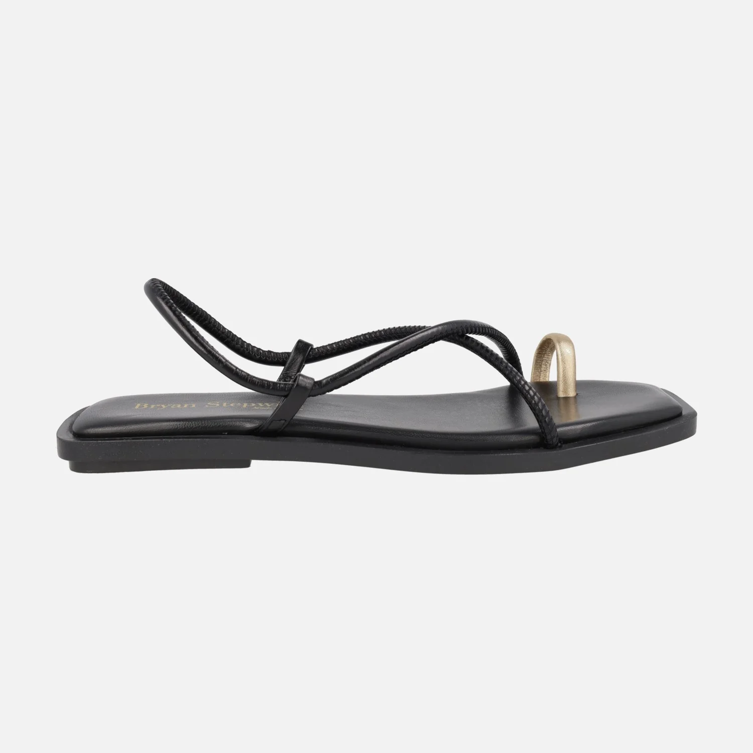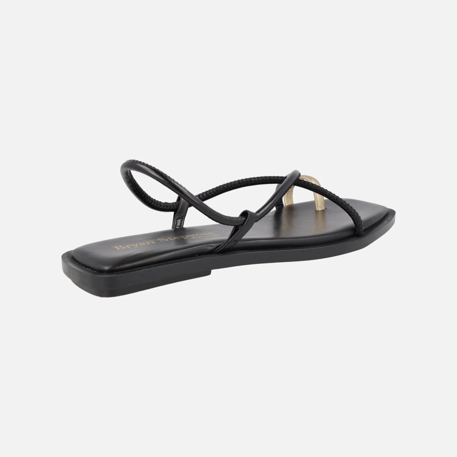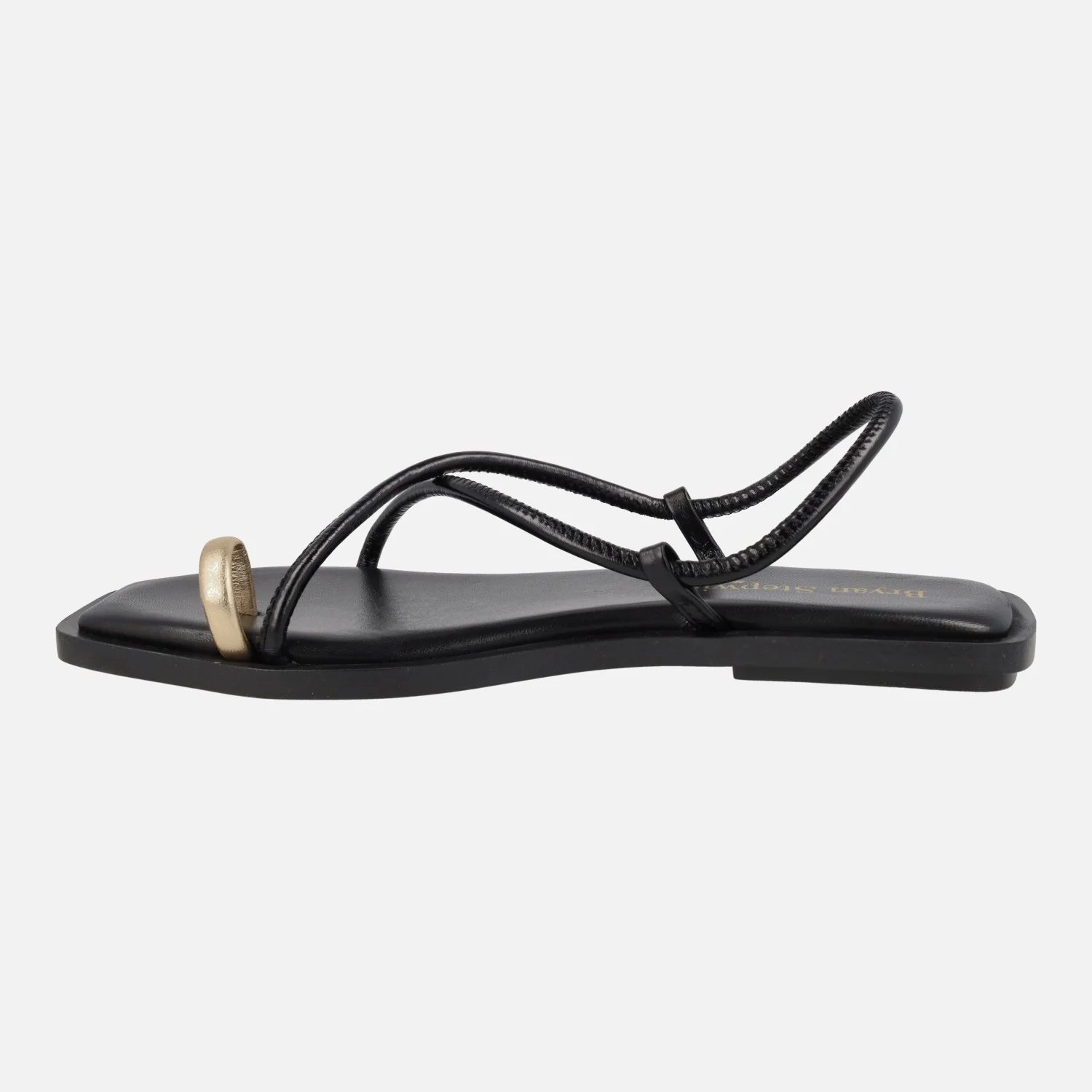 Sandalias planas de piel modelo Katia 7300 de la marca Bryan Stepwise. Sandalias de tiras en piel negra o marrón oscuro (caoba) con pieza dorada para dedo. Interiores forrados de piel. Piso sintético de 1,5 cm de altura.