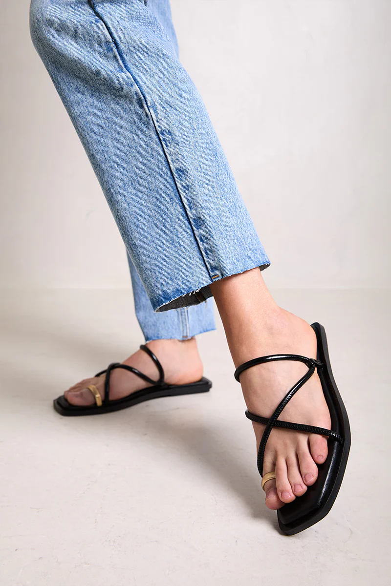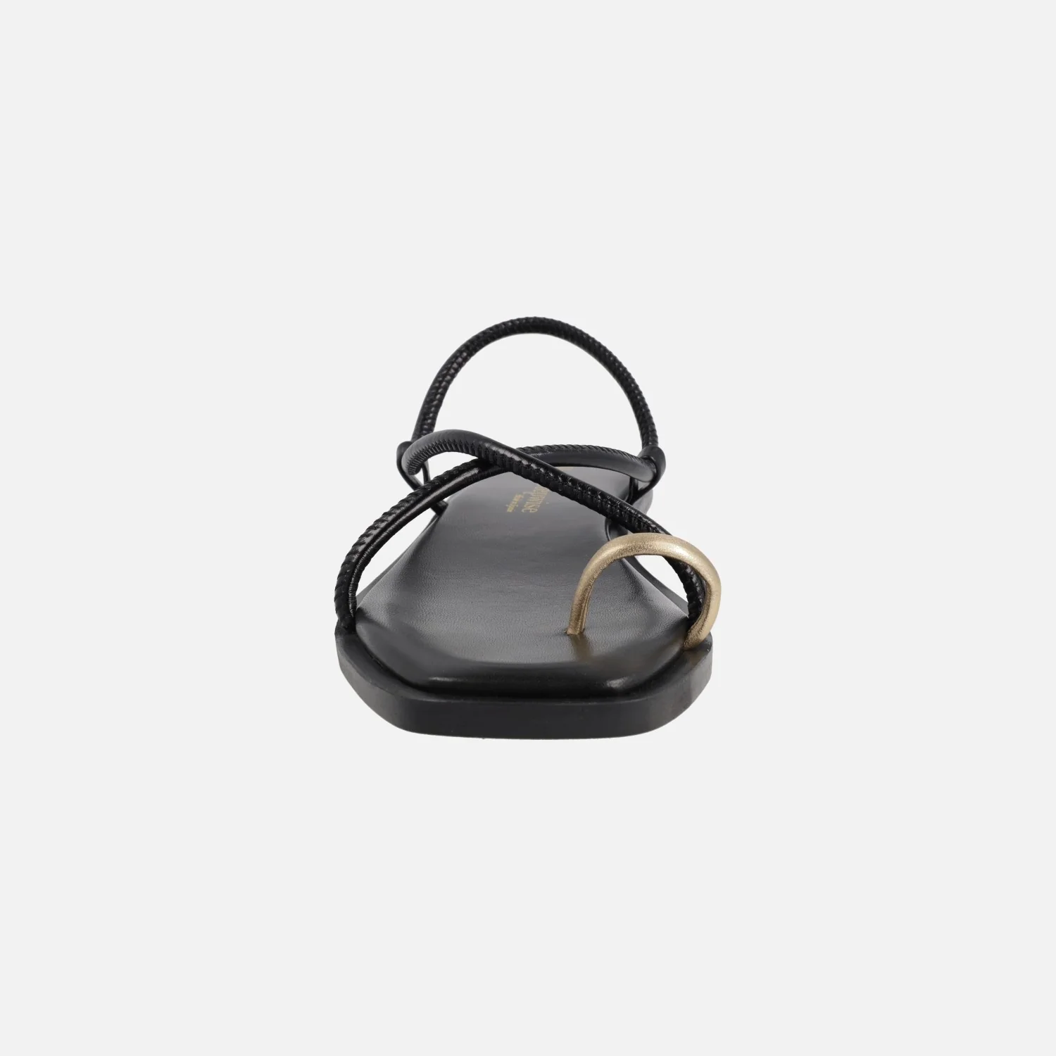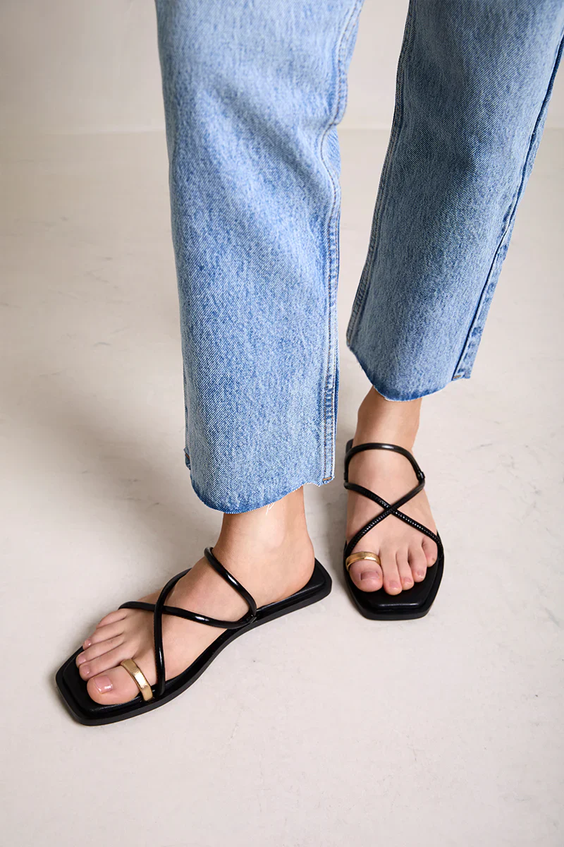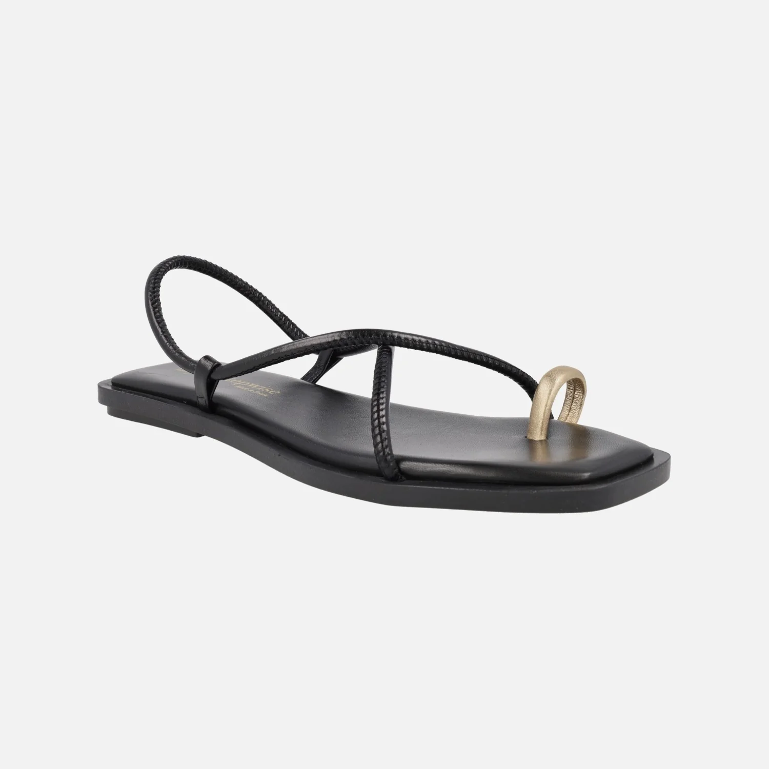 Sandalias planas de piel modelo Katia 7300 de la marca Bryan Stepwise. Sandalias de tiras en piel negra o marrón oscuro (caoba) con pieza dorada para dedo. Interiores forrados de piel. Piso sintético de 1,5 cm de altura.