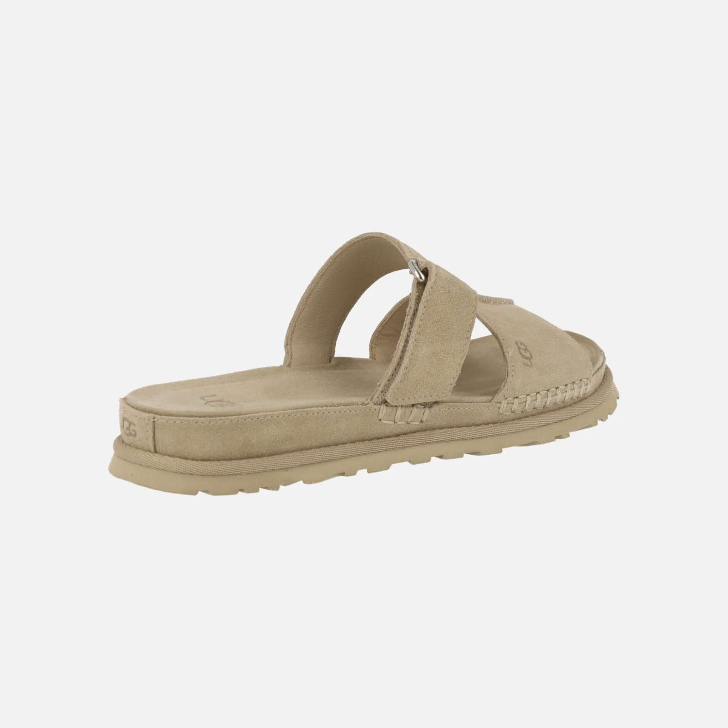 Sandalias planas destalonadas para mujer de la marca UGG modelo 1178590 Goldengaze Slide Mustard seed. Sandalias de ante color beige, con una tira ancha delantera y una más estrecha al empeine con cierre de velcro ajustable. Interior mixto en piel y tejido. Suela sintética que junto a la plataforma hacen un total de 3 cm de altura trasera (2,5 cm parte delantera).