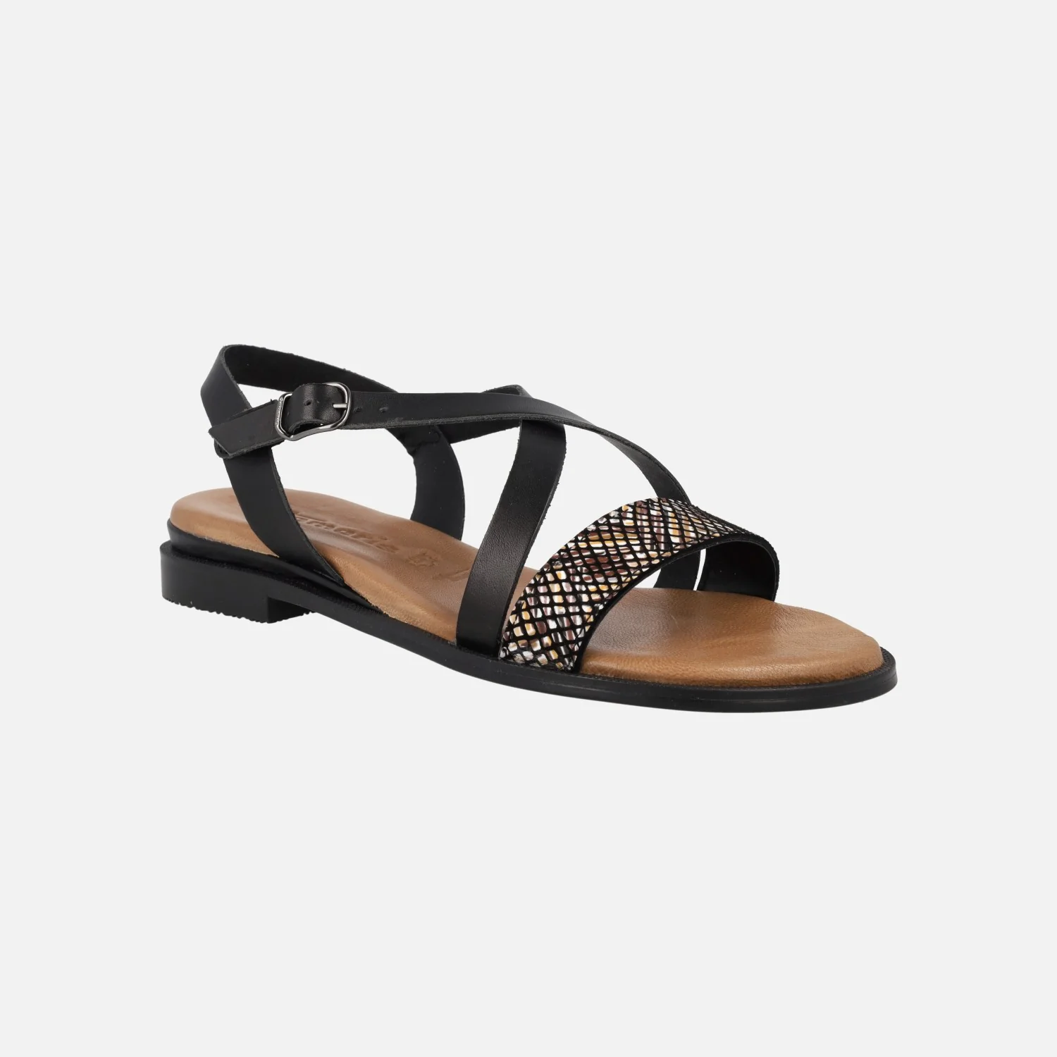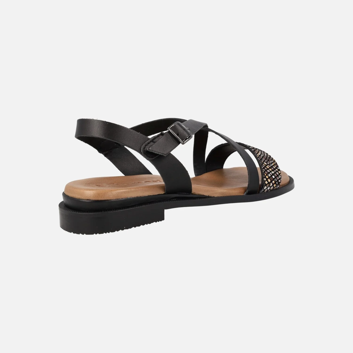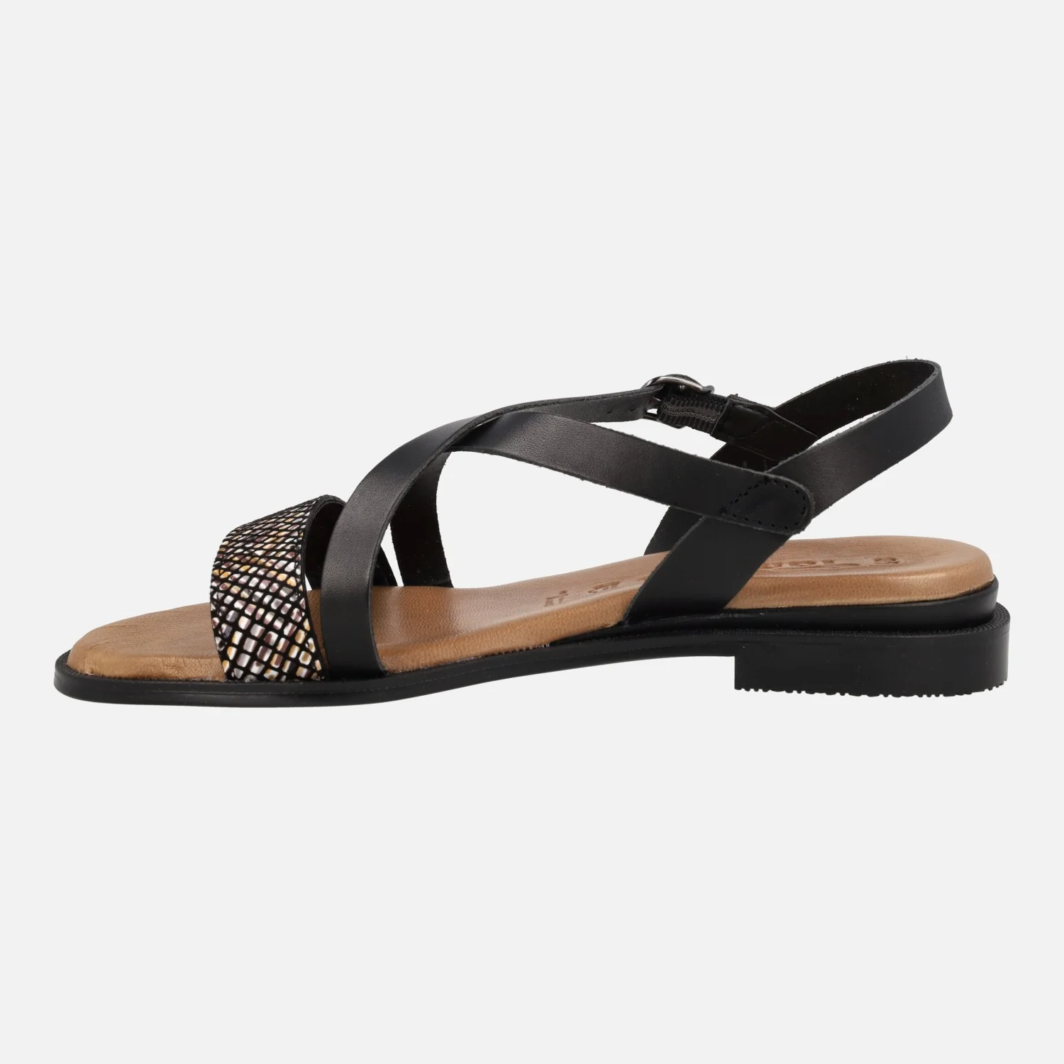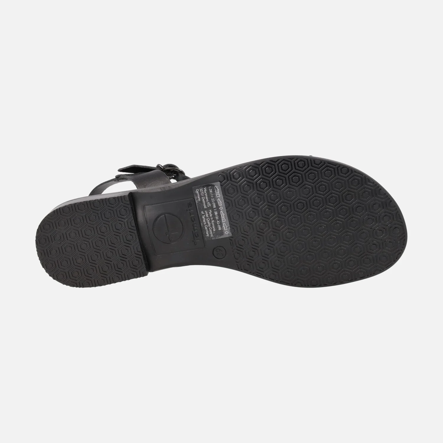 Sandalias planas para mujer de la marca Tamaris modelo 1-28111 Black comb. Sandalias de piel negras, con tira delantera en grabado combinado con distintos tonos (marrón, amarillo, crema). Tiras que cruzan en el empeine y acaban con un cierre de hebilla en el lateral exterior. Interior mixto en combinado de sintéticos con planta acolchada de piel. Piso de goma con 3 cms de altura de tacón.