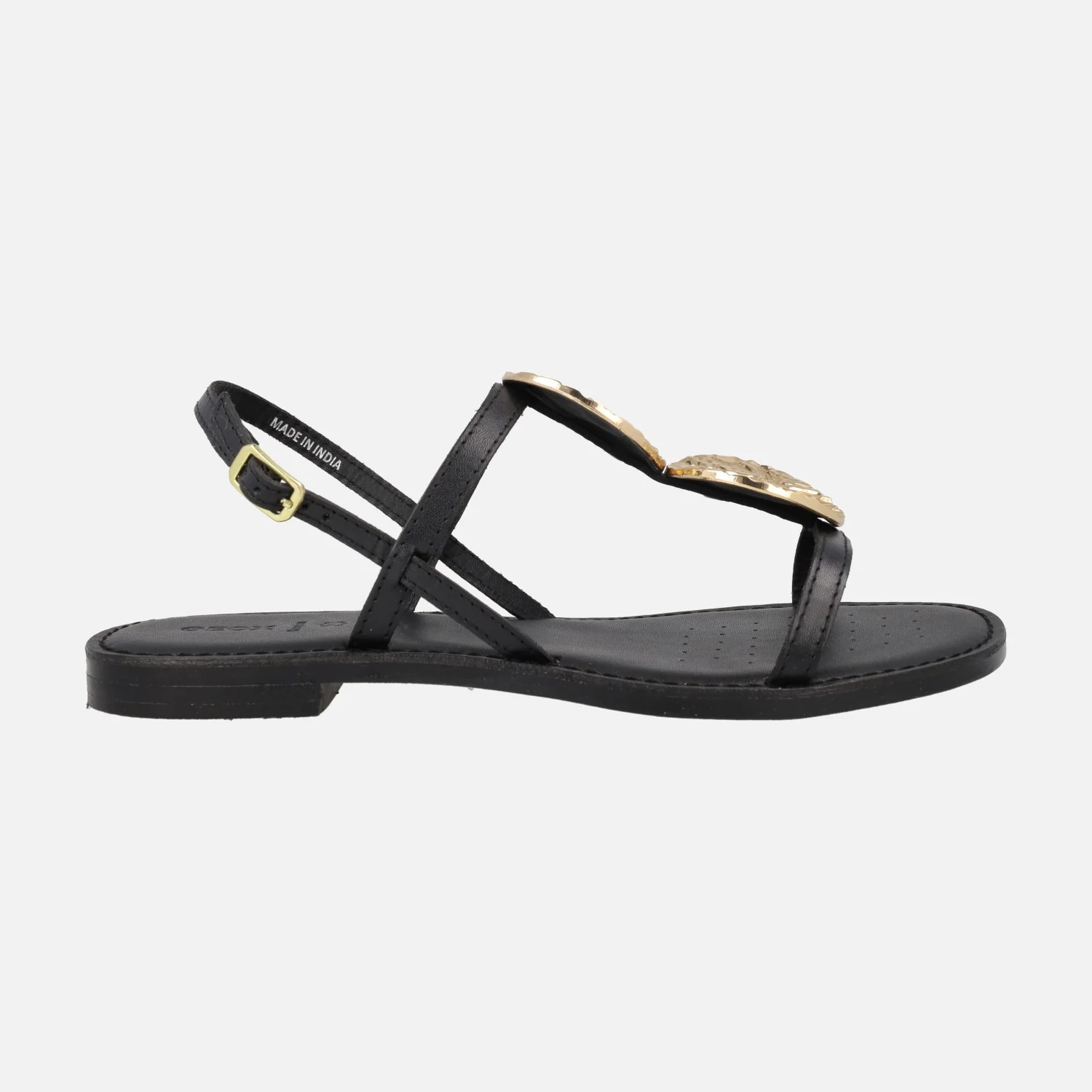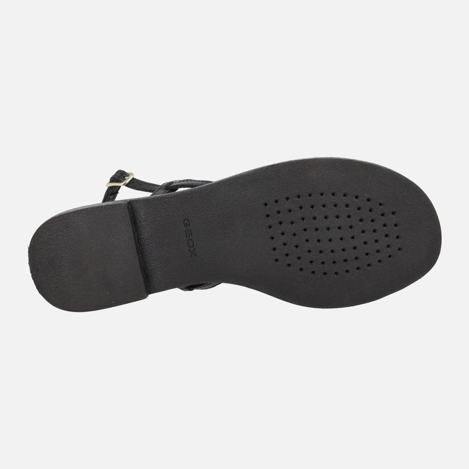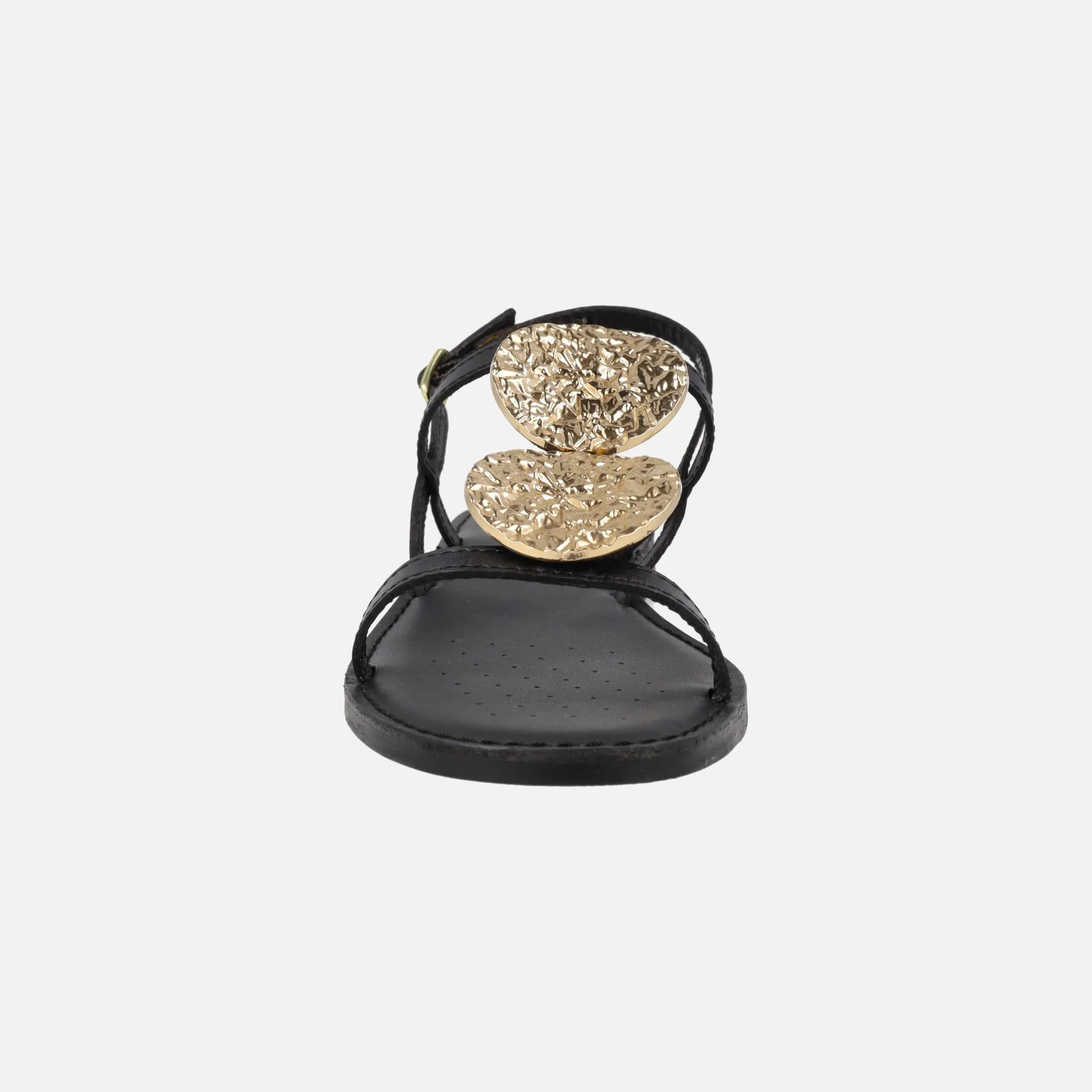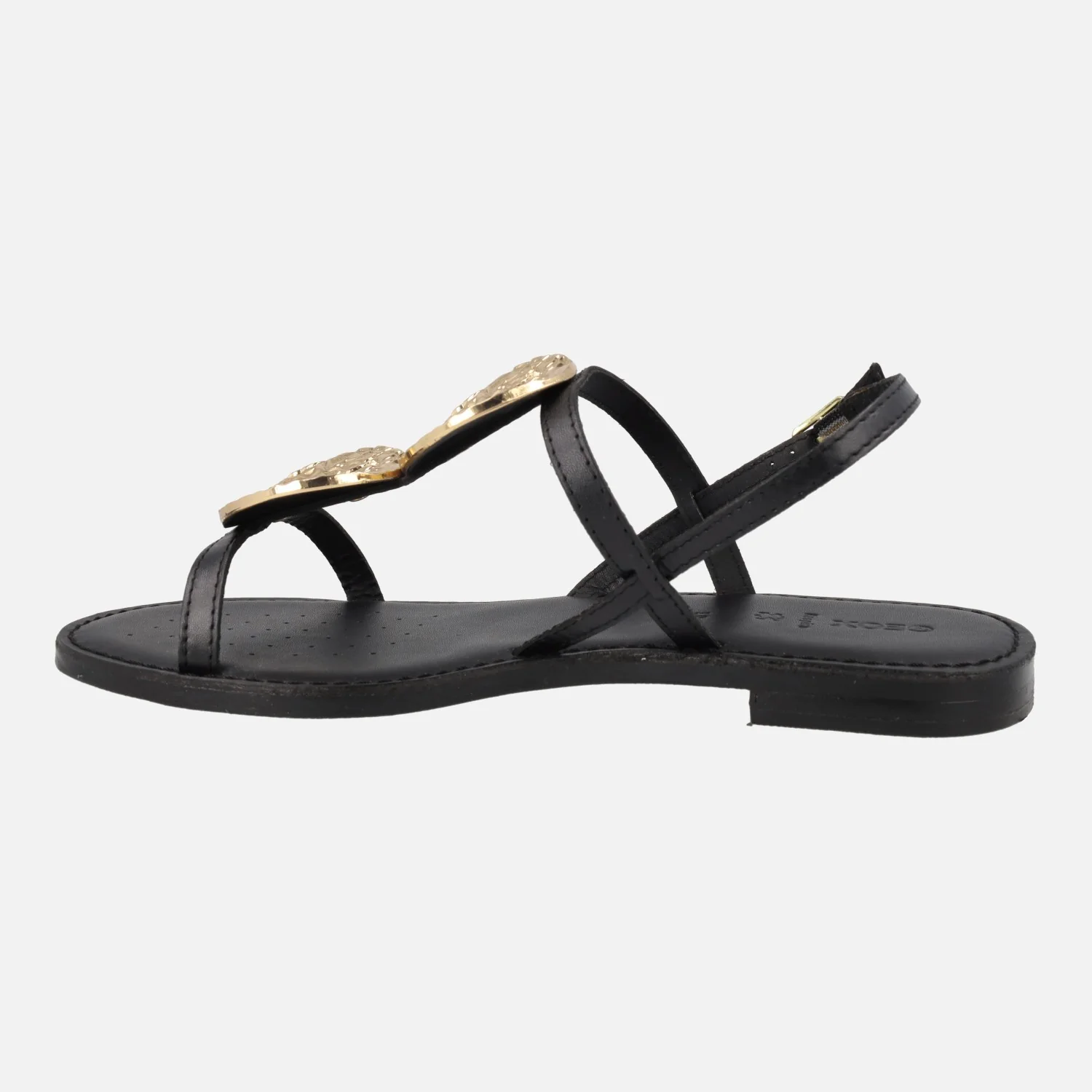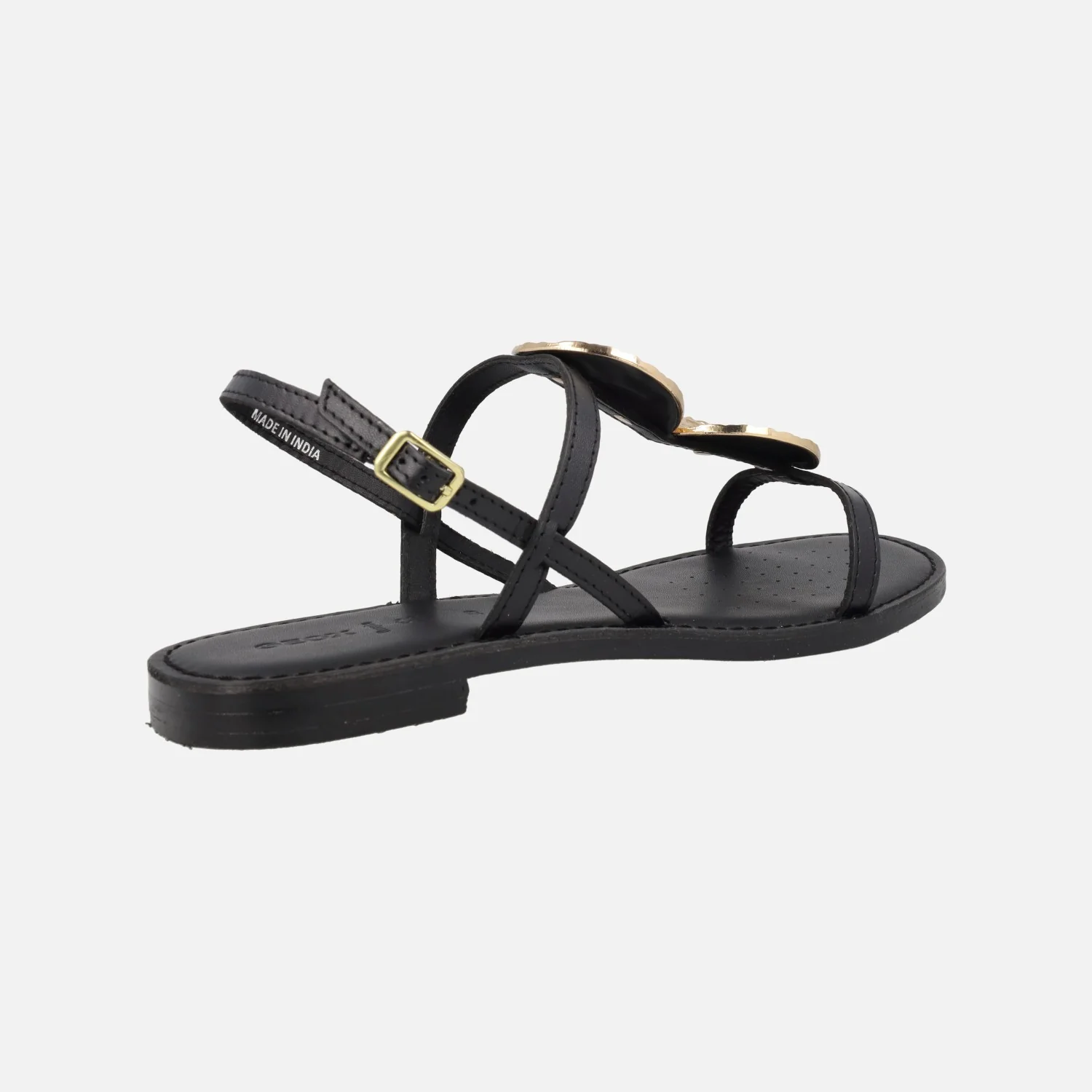 Sandalias planas de piel para mujer de la marca Geox, modelo D55YMF Black Maddalusia C F Bufalo. Sandalias negras de tiras finas con cierre de hebilla al talón. Adorno de dos esferas doradas en la parte superior. Interiores forrados de pie. Piso sintético, de apenas 1,5 cms de altura.