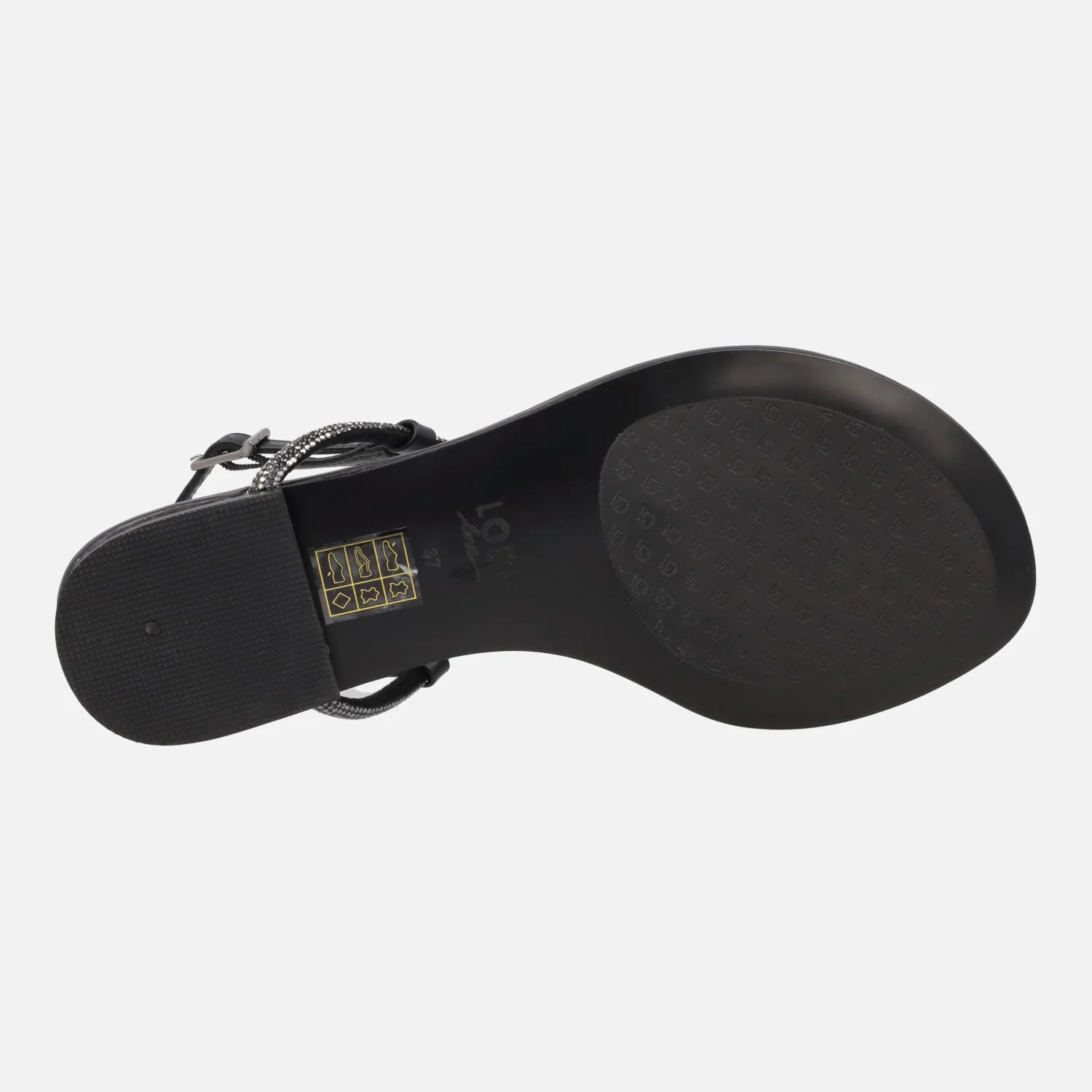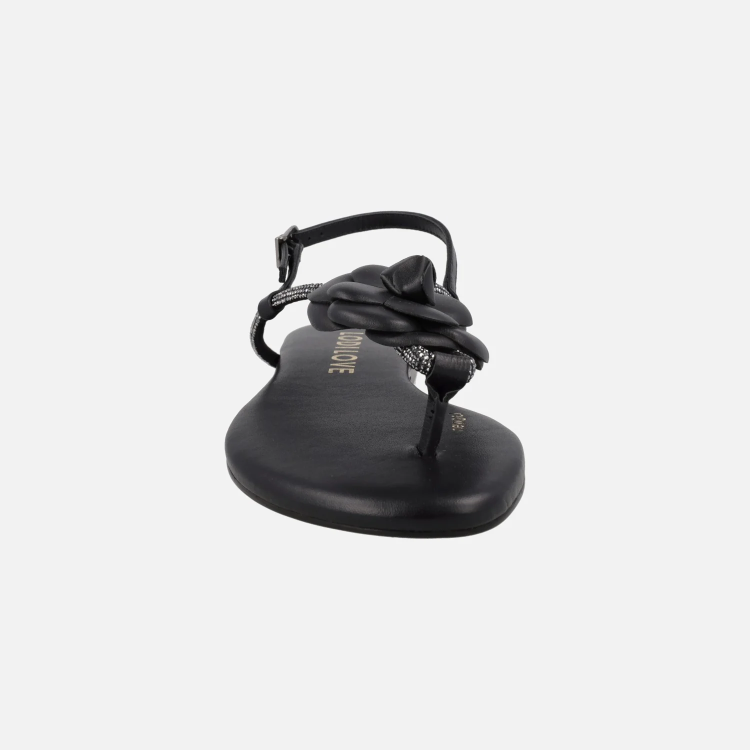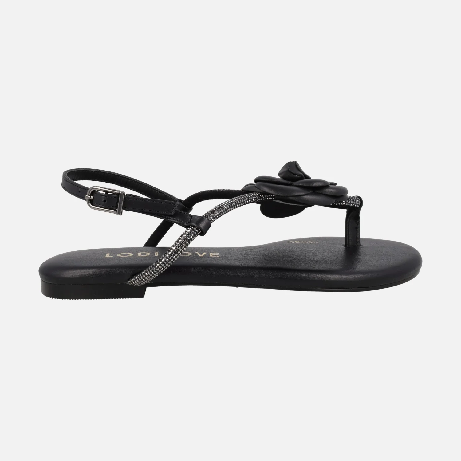Sandalias negras de piel para mujer de la línea Lodilove de Lodi, modelo BR5500 Negro. Sandalias planas, con pieza para dedo y adorno de flor. Pulsera al talón con cierre de hebilla. Detalles de strass. Plantillas de piel acolchadas, muy confortables. Piso sintético. Planas, apenas 1,5 cms de altura.