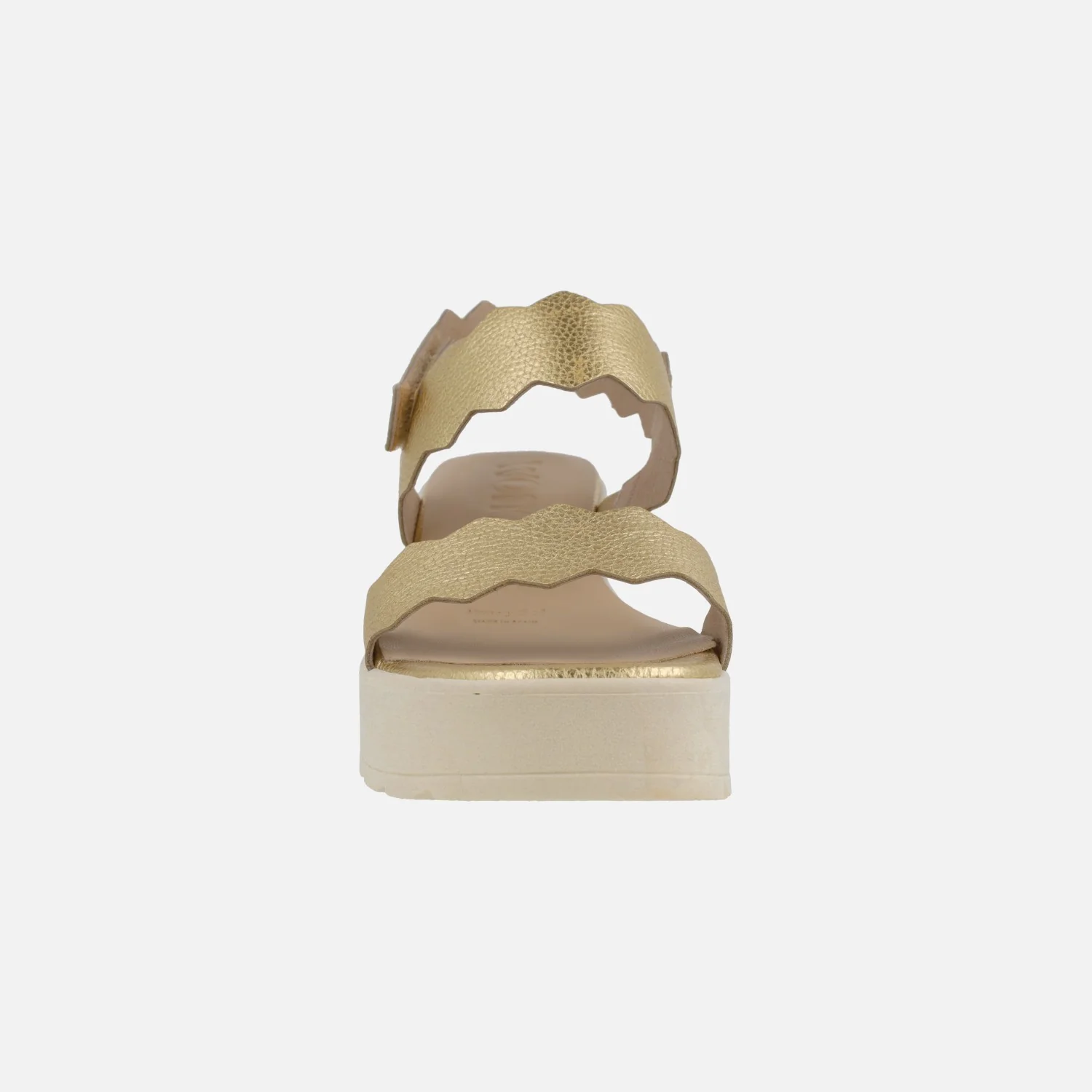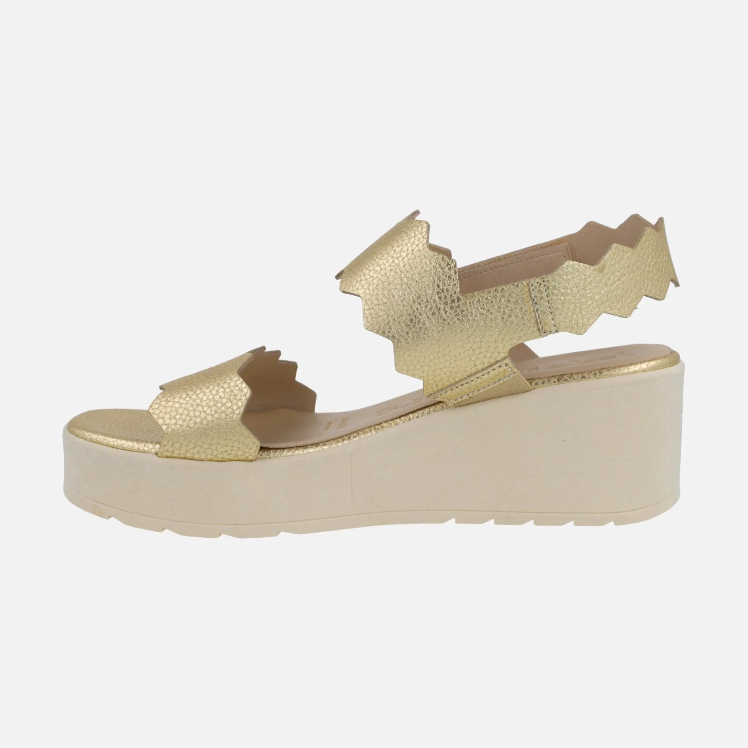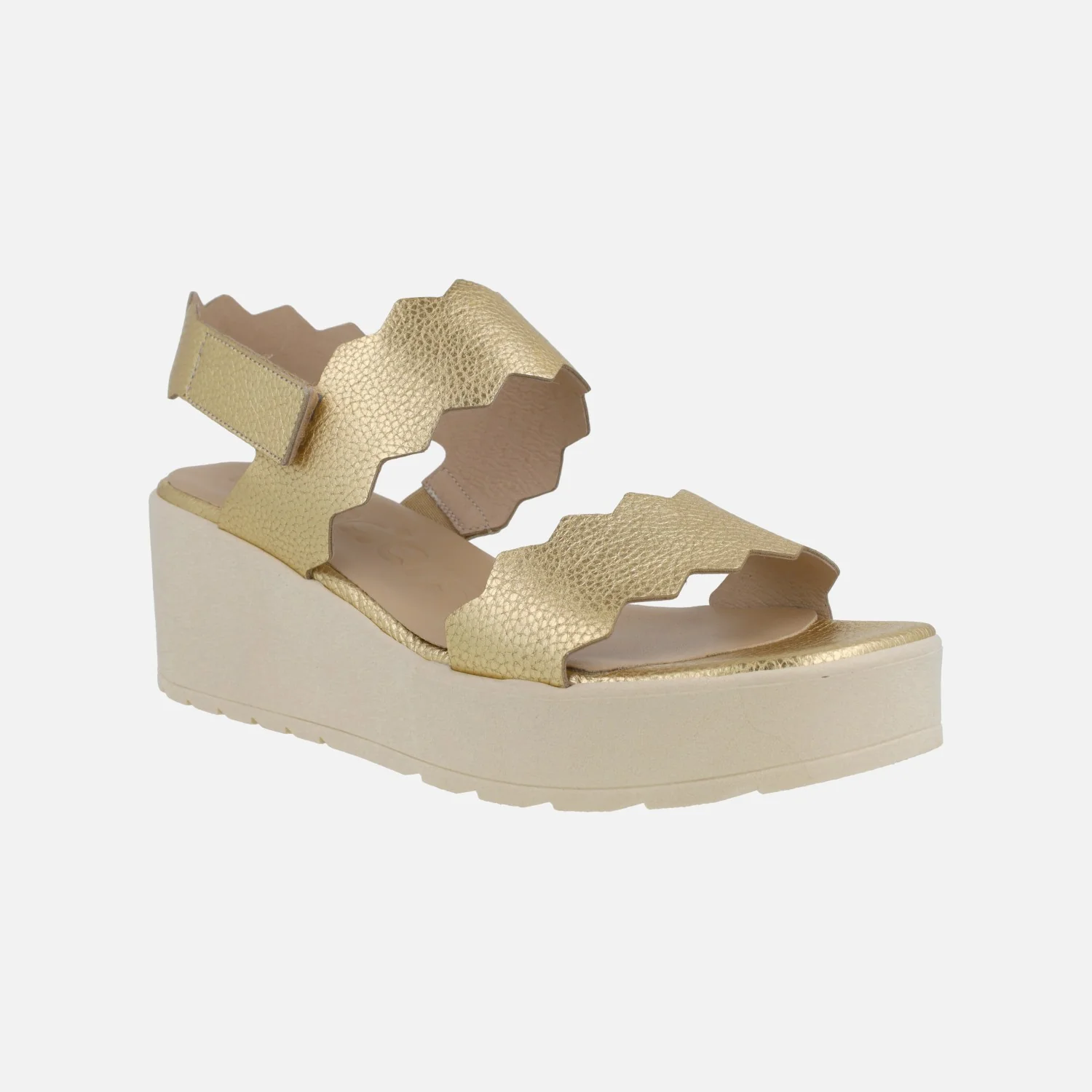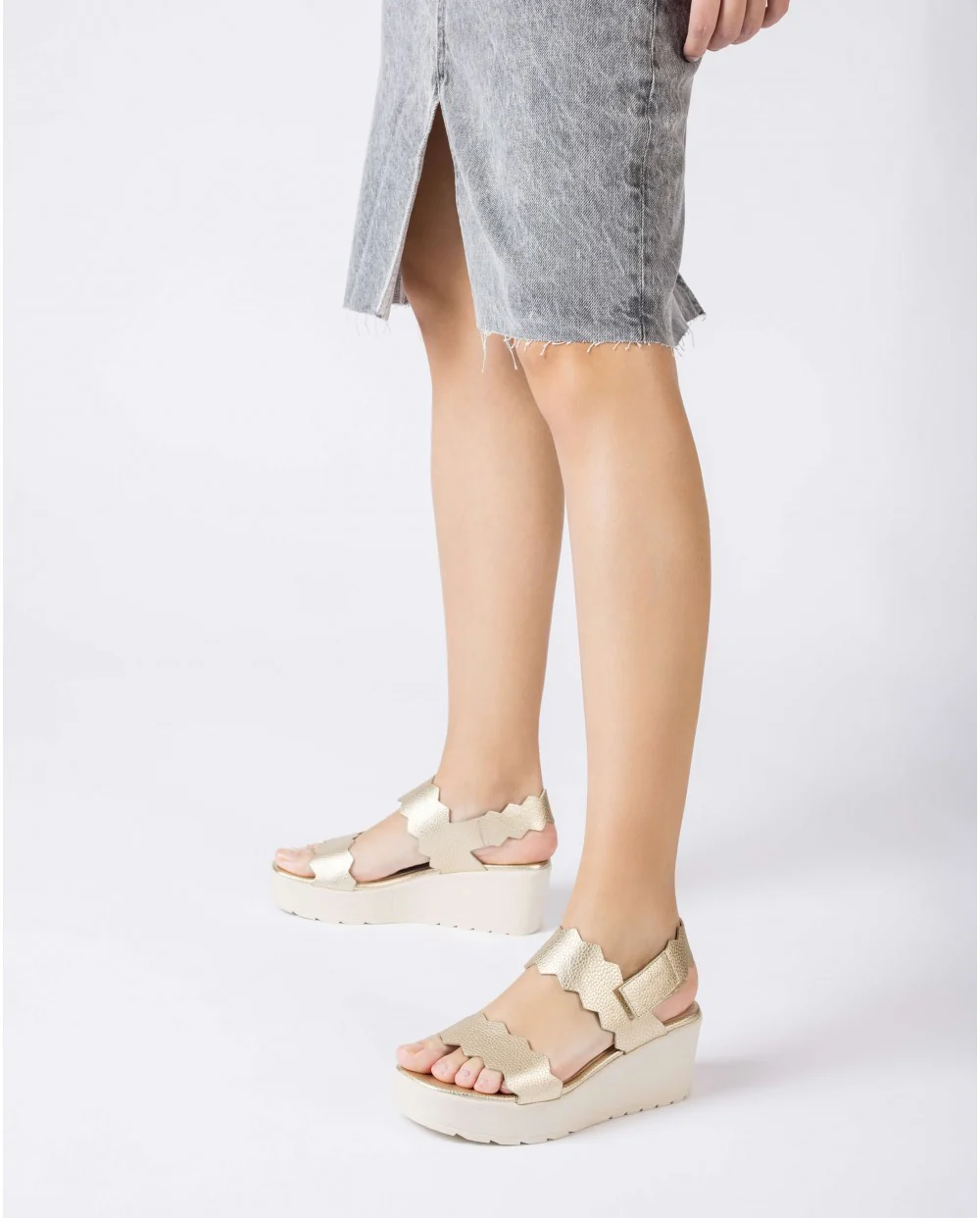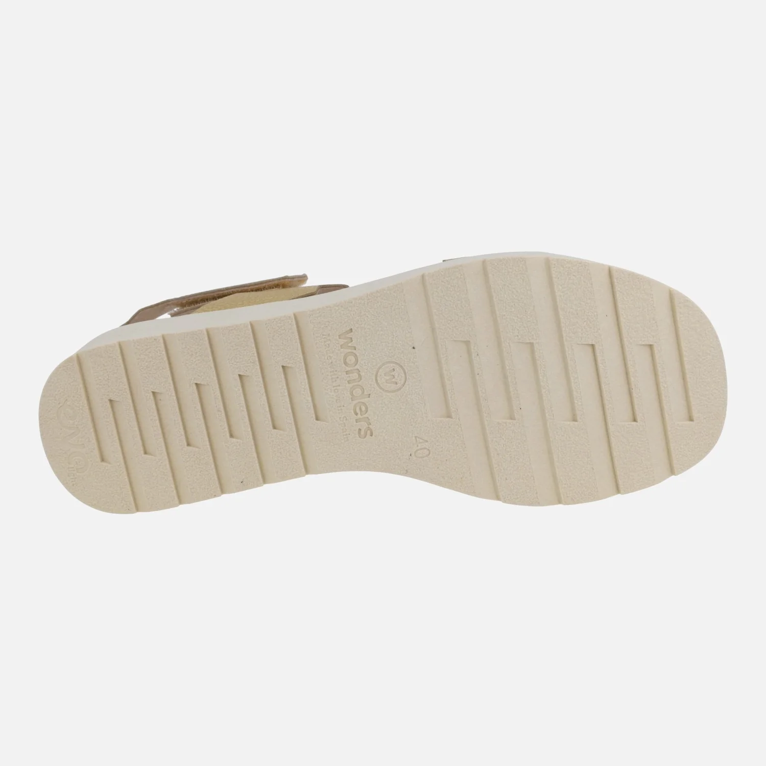 Sandalias de cuña Wonders modelo Purpura B-9501, disponibles en Wild negro y en Max Platino. Sandalias de piel formadas por dos tiras delanteras y una tira al talón, esta última con cierre de velcro. Interiores en piel y microfibra. Cuña de EVA muy ligera, con 6 cms de altura trasera (3 cms plataforma delantera).