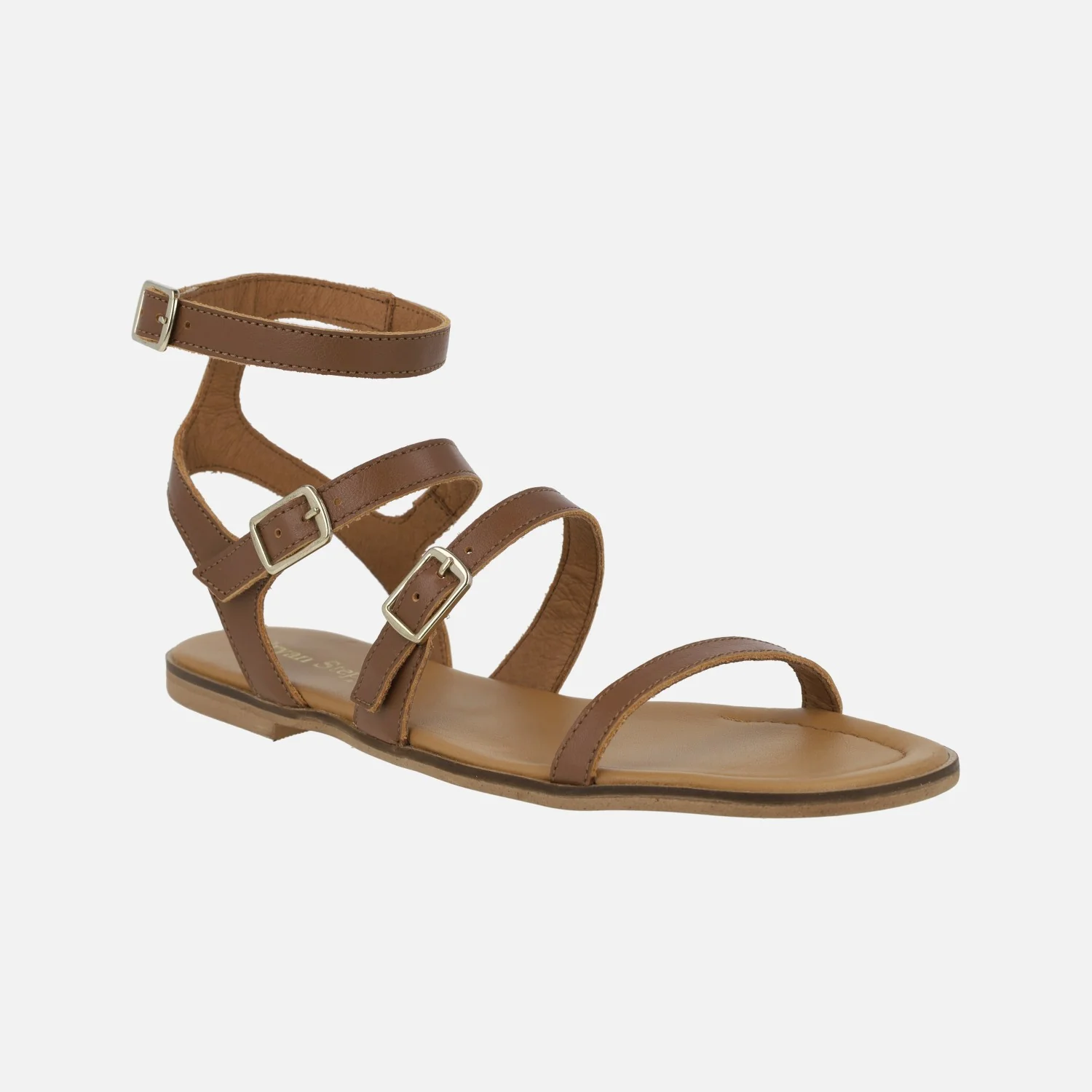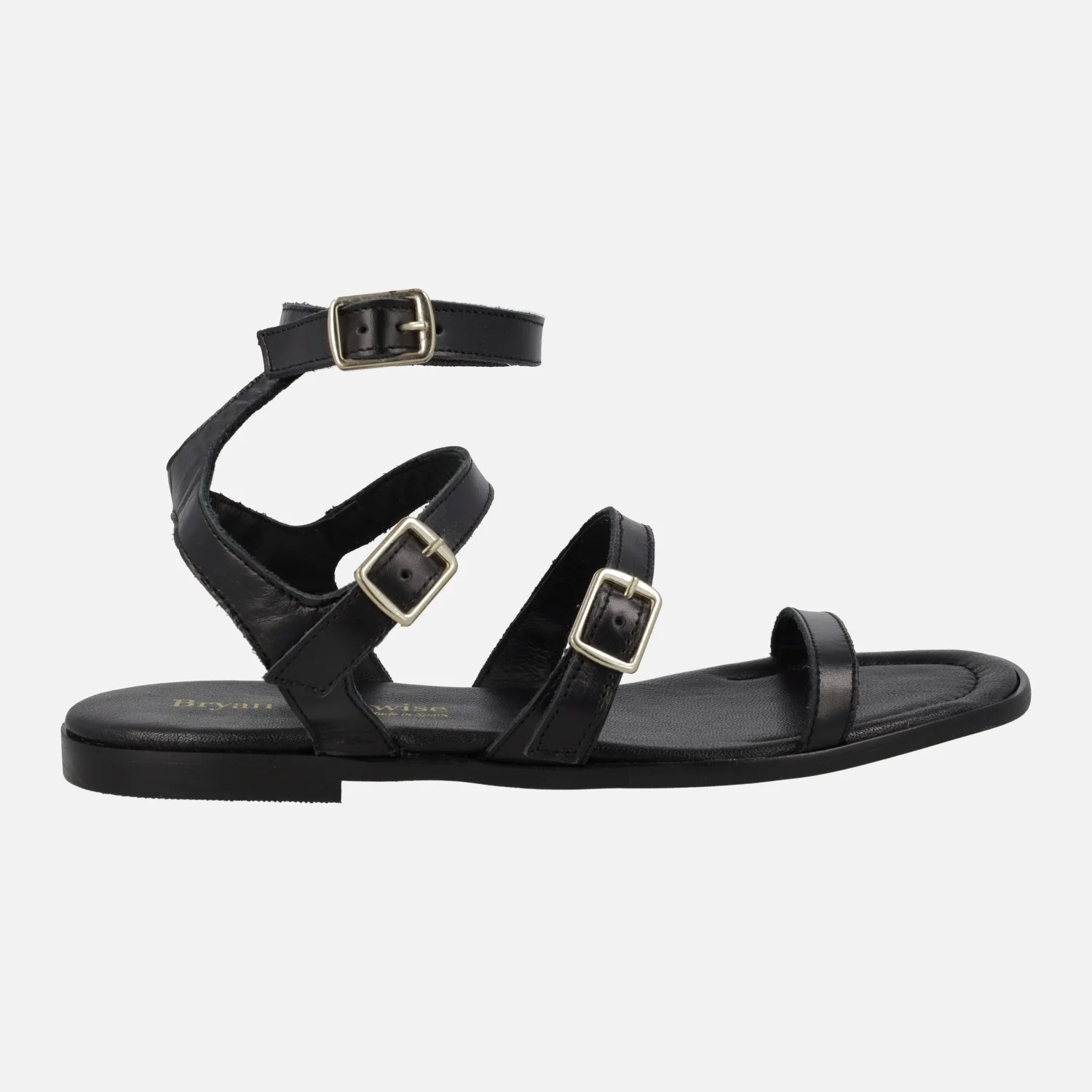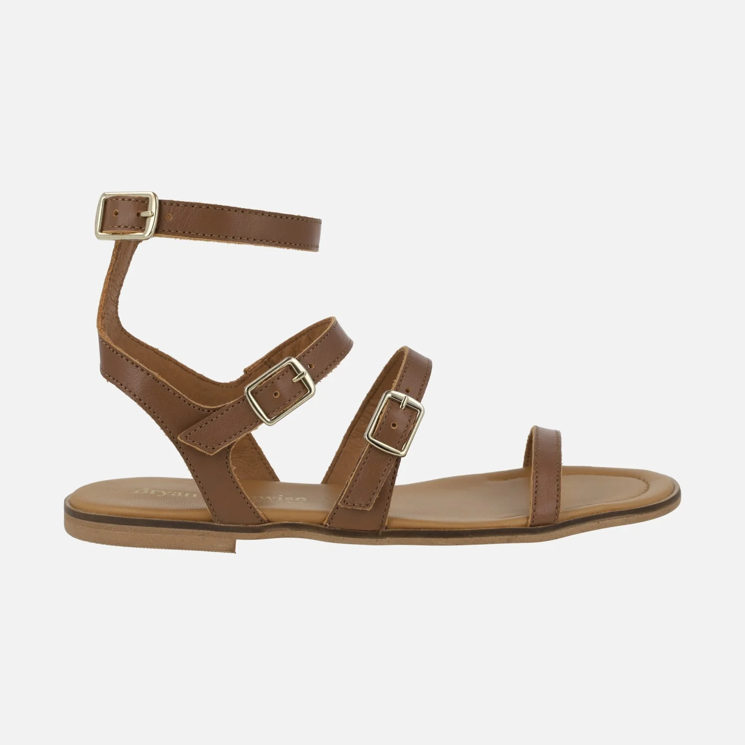 Sandalias romanas para mujer de la marca española Bryan Stepwise modelo Creta 1540, disponibles en piel cuero o negras. Sandalias planas, con cuatro tiras de las cuales tres llevan hebillas ajustables. La pulsera superior cierra al tobillo. Elaboradas en piel, con planta acolchada de piel. Piso plano. Made in Spain.
