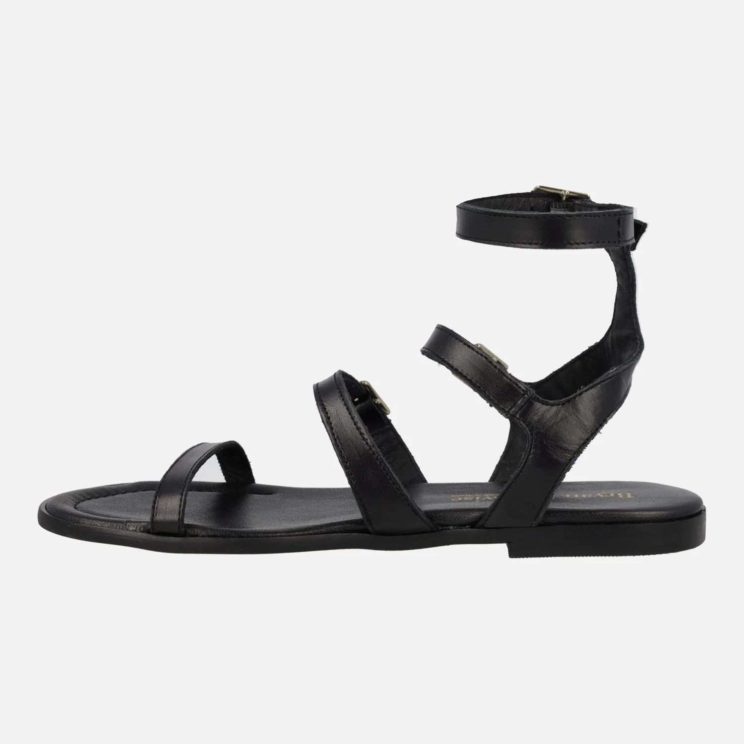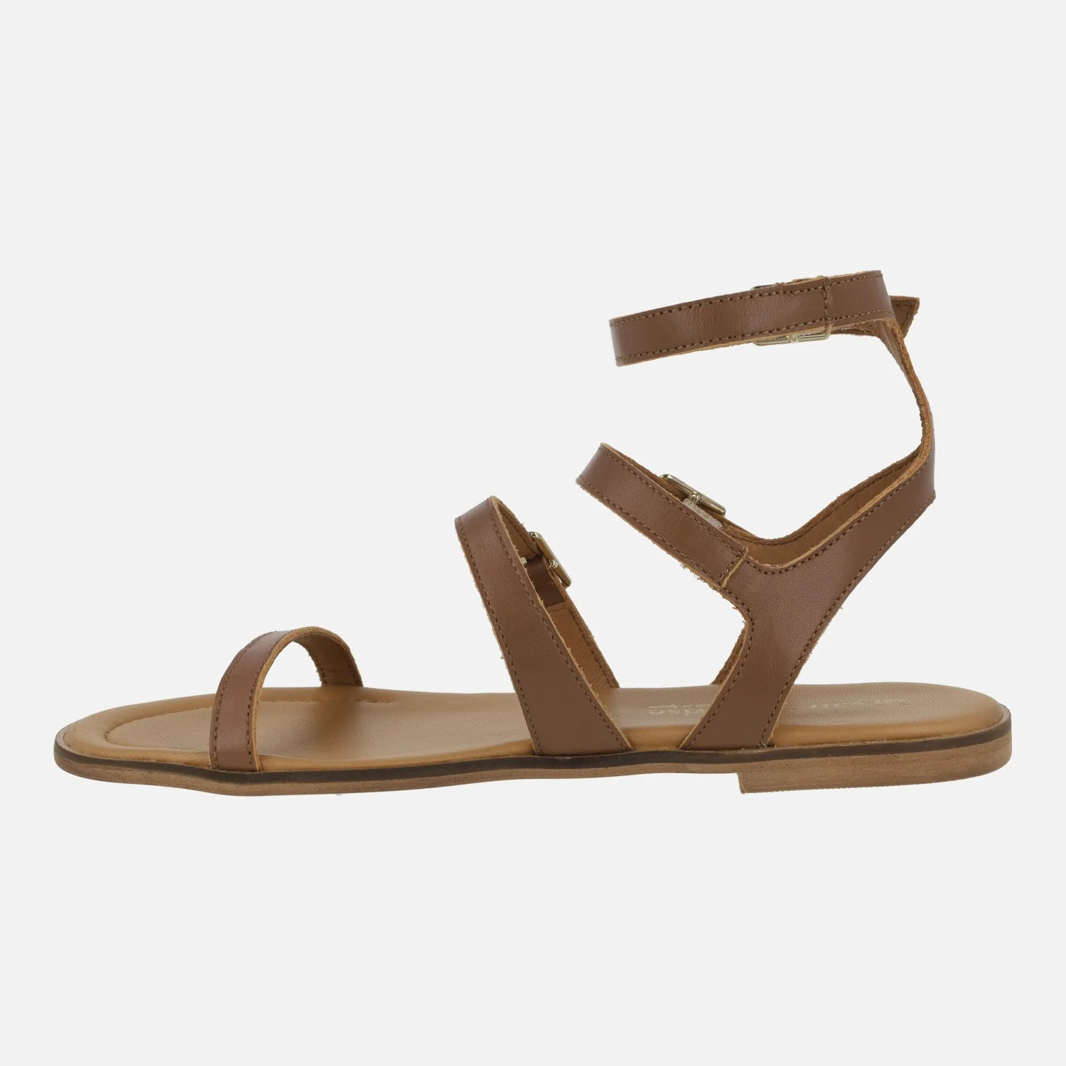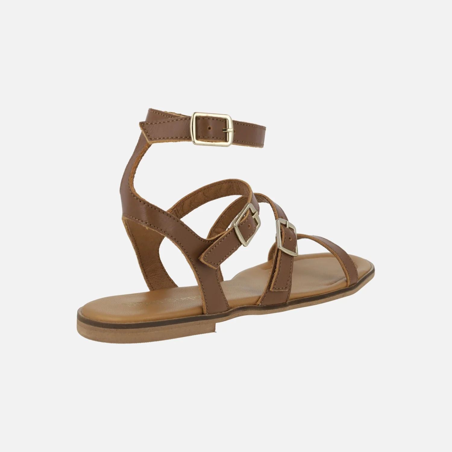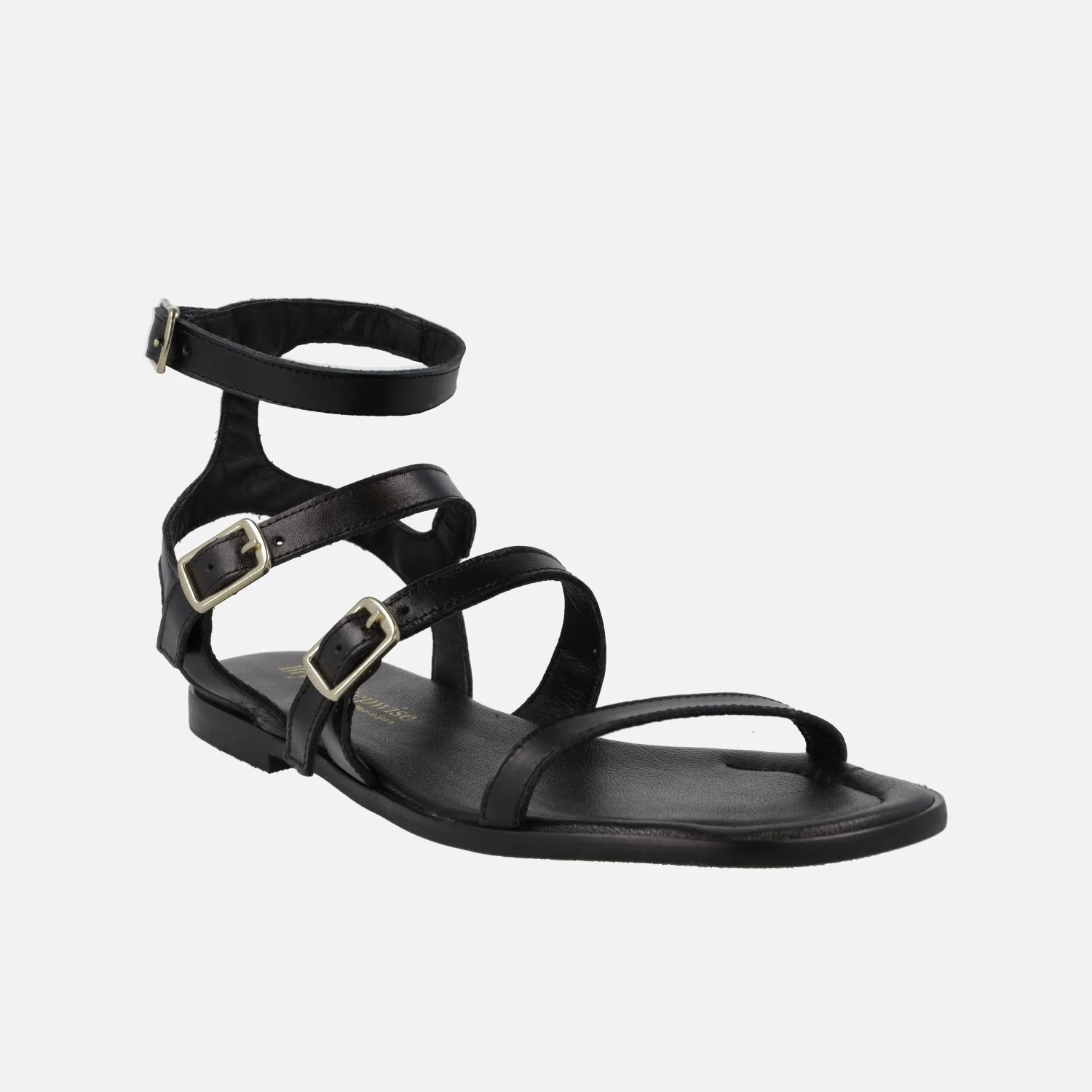 Sandalias romanas para mujer de la marca española Bryan Stepwise modelo Creta 1540, disponibles en piel cuero o negras. Sandalias planas, con cuatro tiras de las cuales tres llevan hebillas ajustables. La pulsera superior cierra al tobillo. Elaboradas en piel, con planta acolchada de piel. Piso plano. Made in Spain.