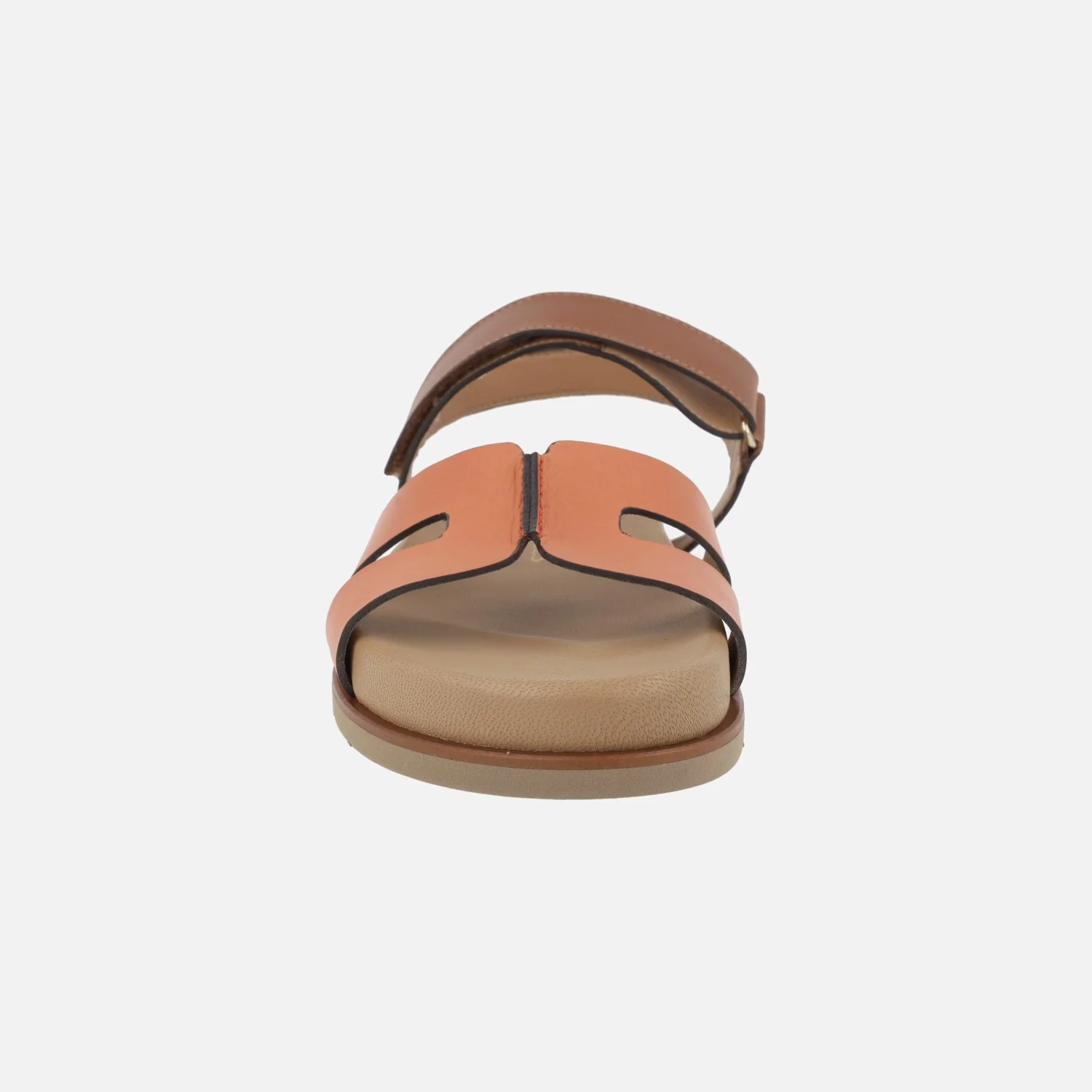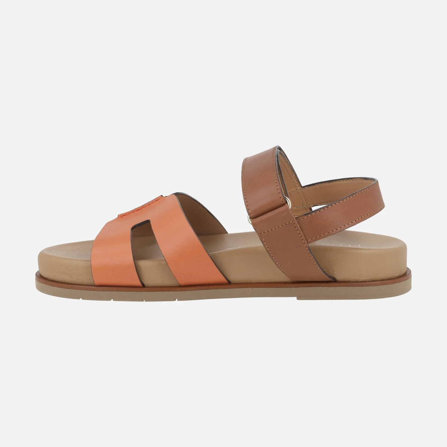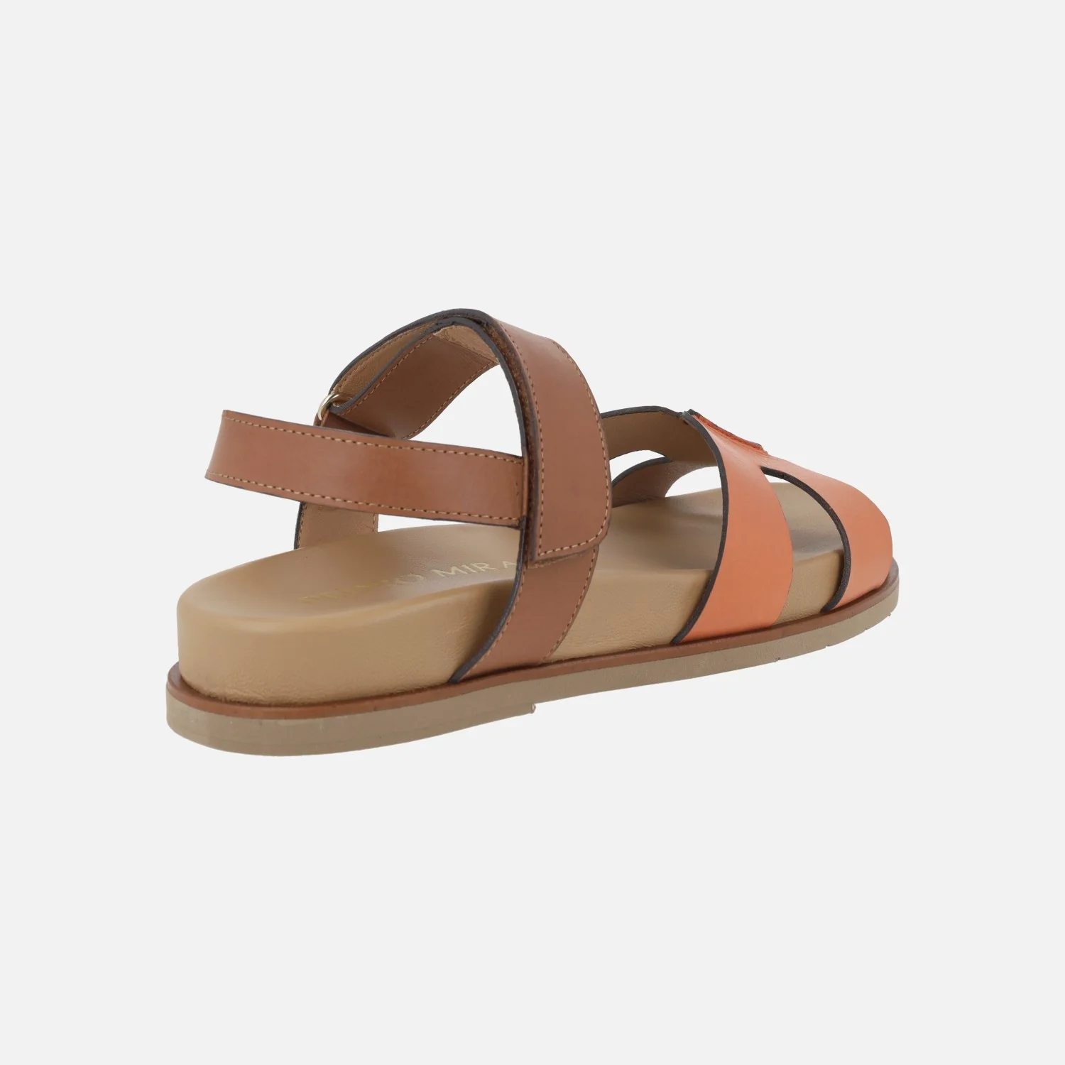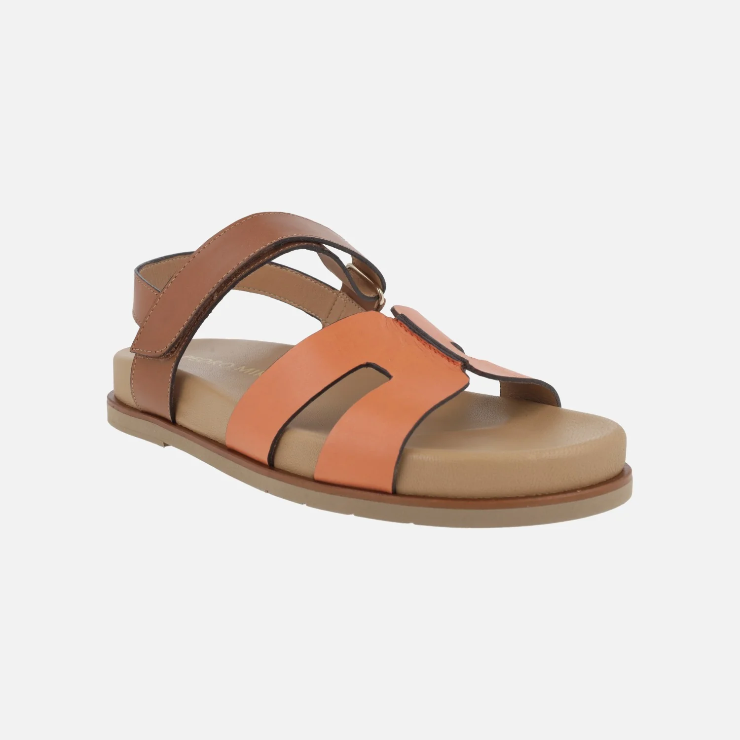 Sandalias planas de piel de la marca Pedro Miralles modelo Saro 17015 Alfa Orange. Sandalias elaboradas en piel, con pala en naranja y parte trasera en marrón. Cierre de velcro. Forro y planta en piel y otros materiales. Suela de caucho. Pequeña plataforma de 3 cms de altura trasera (2 cms parte delantera). Made in Spain.