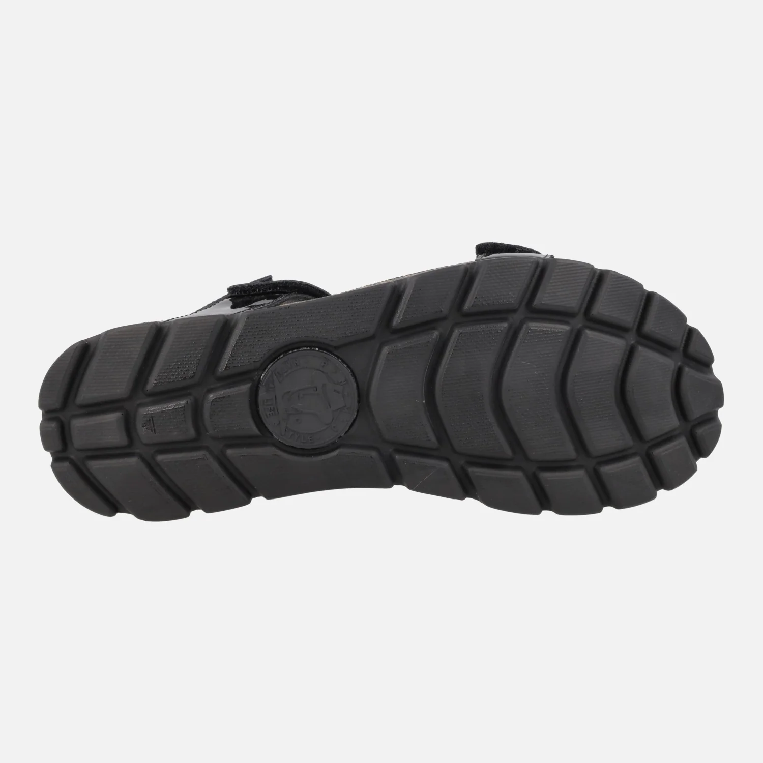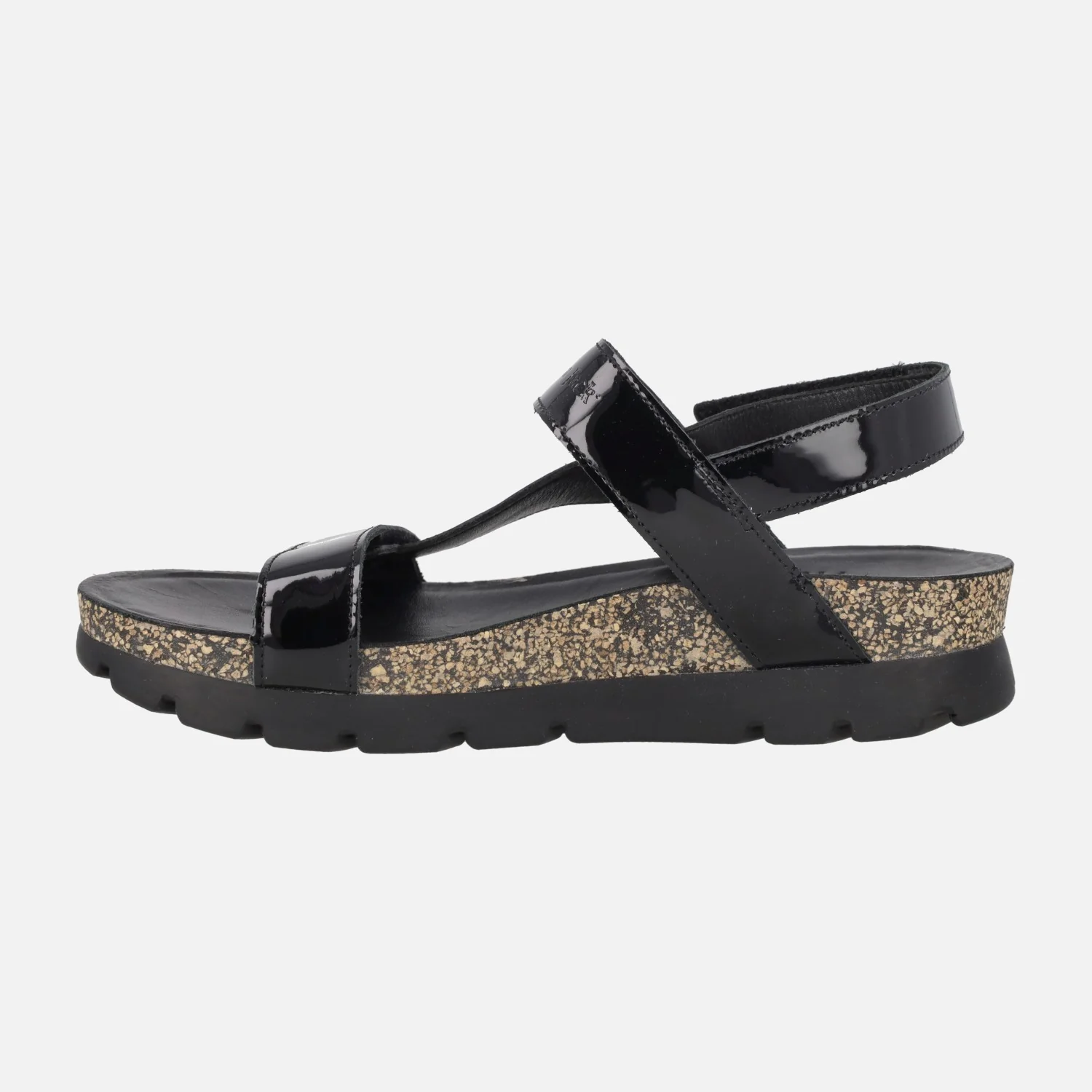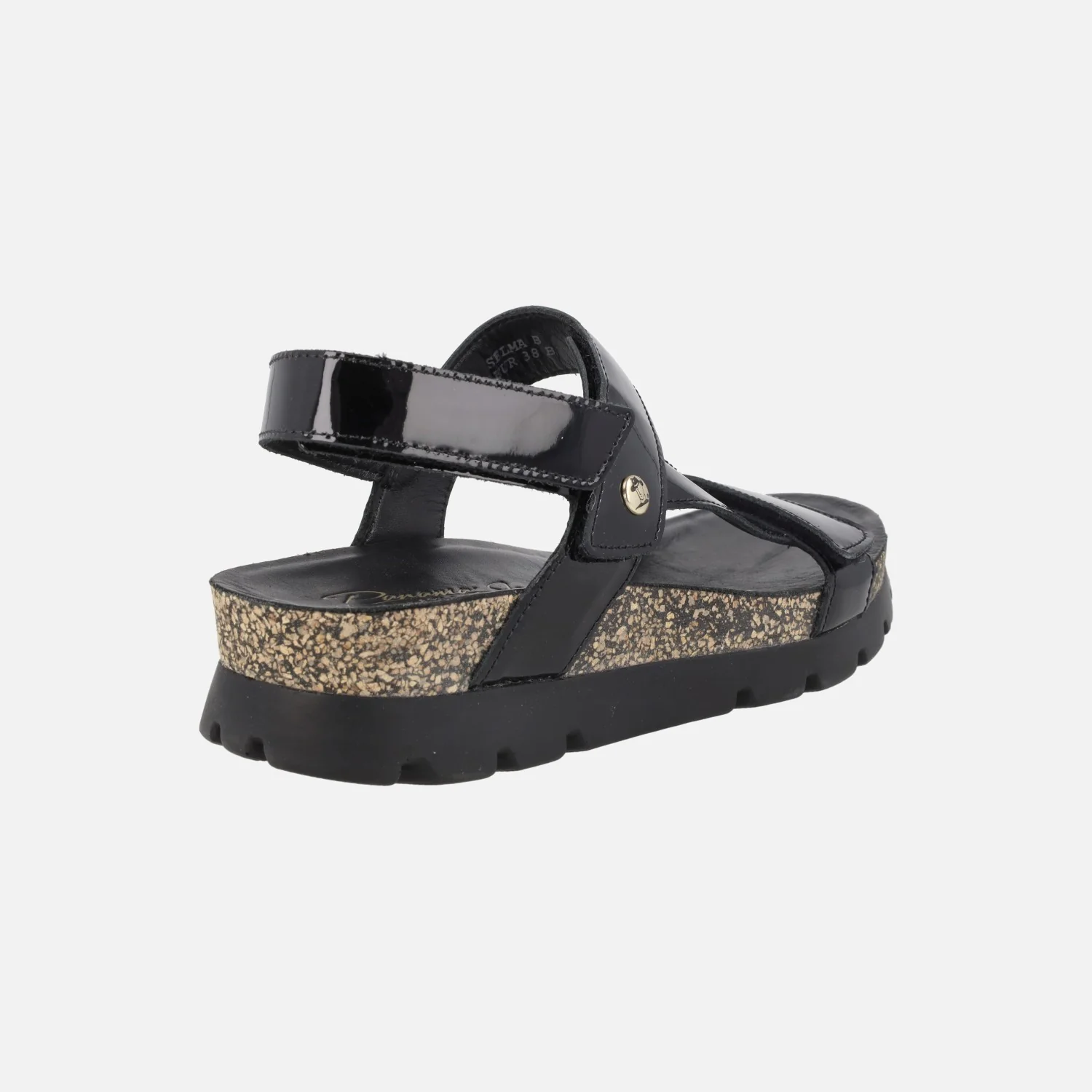 Sandalias para mujer de la marca Panama jack modelo Selma. Sandalias con cierre de velcros en tres tiras, elaboradas en piel charol color negro con interiores y planta de piel. Entresuela de corcho, piso de EVA. Altura de 4,5 cms en la parte trasera (3 cms en la parte delantera). Made in Spain. Disponibles en B26 Charol negro.
