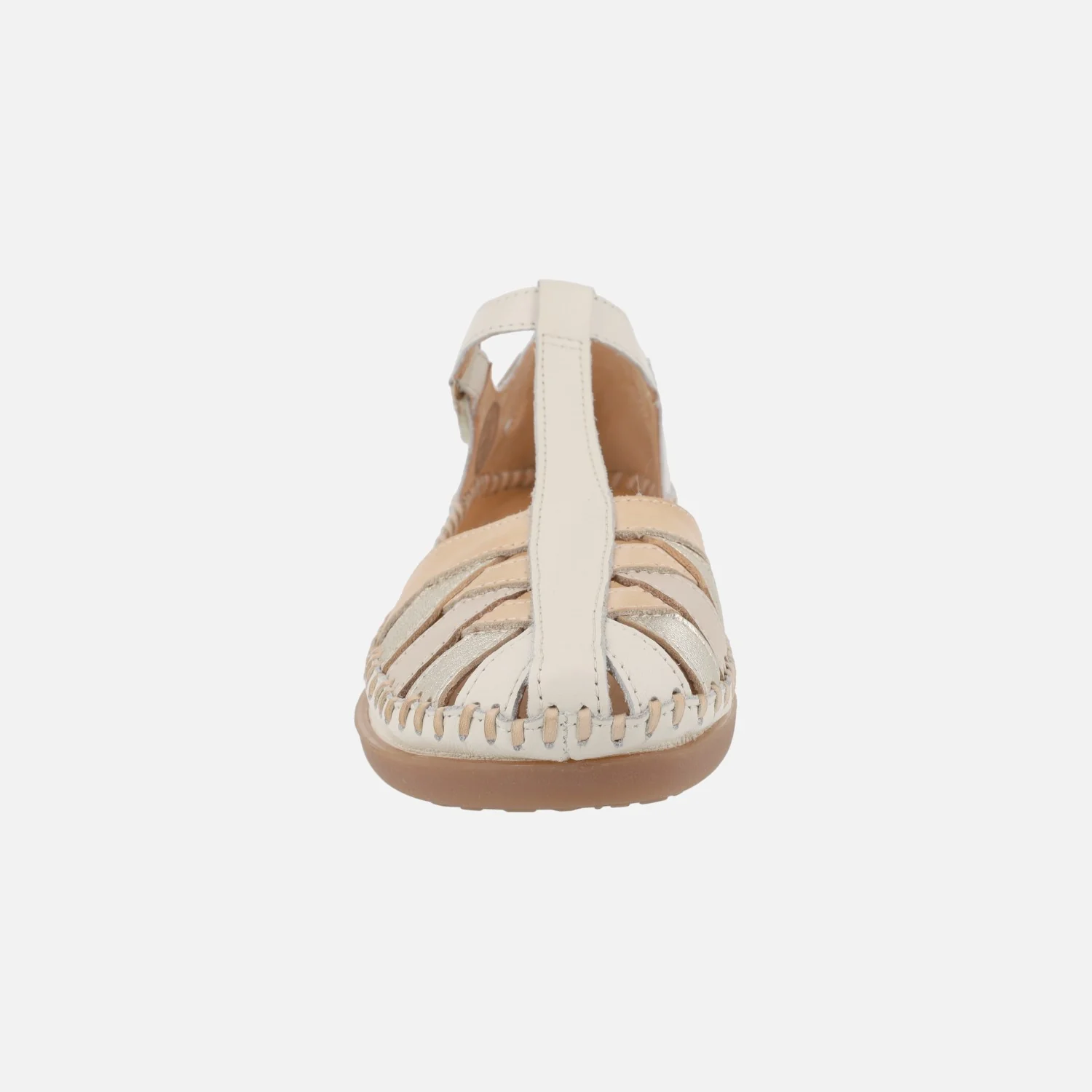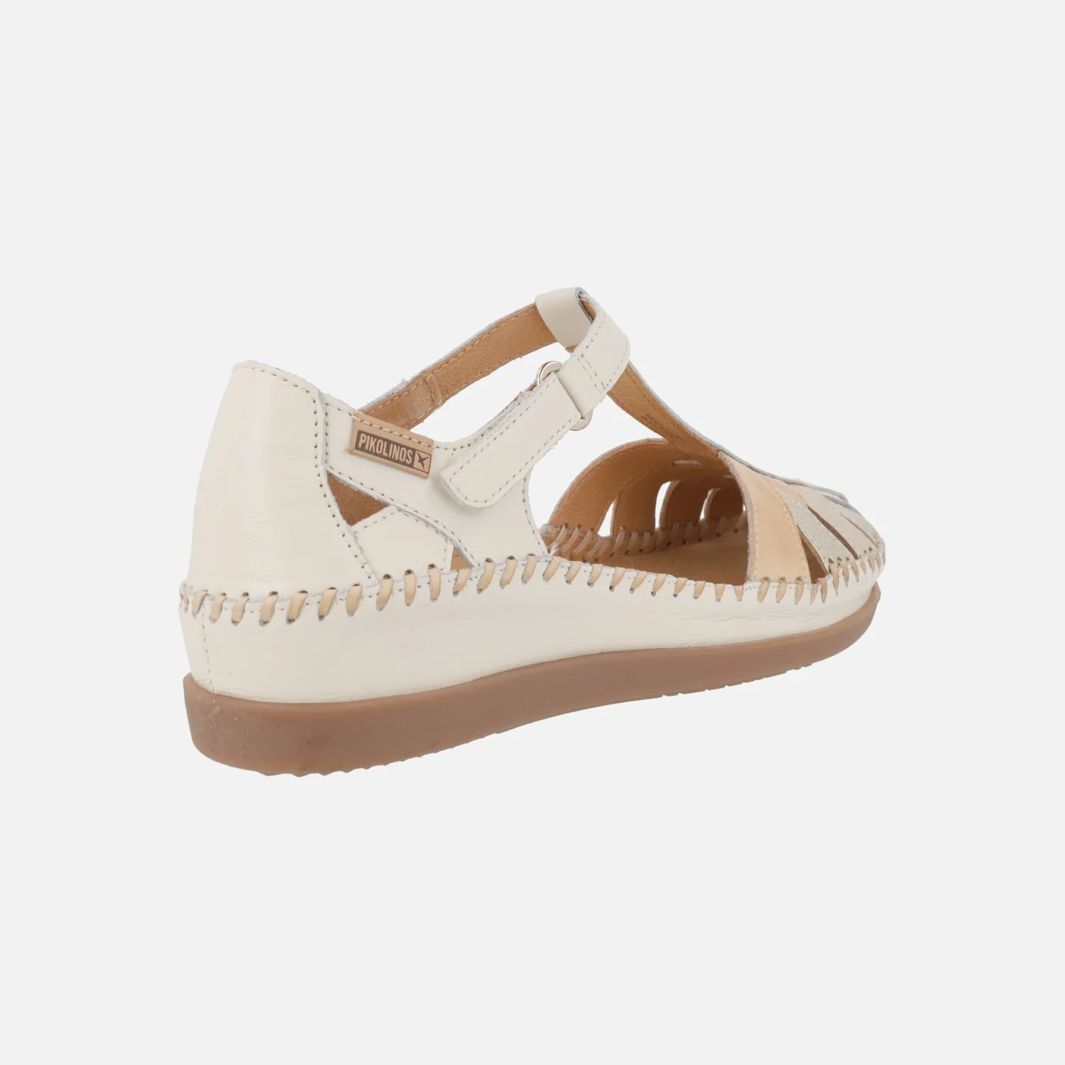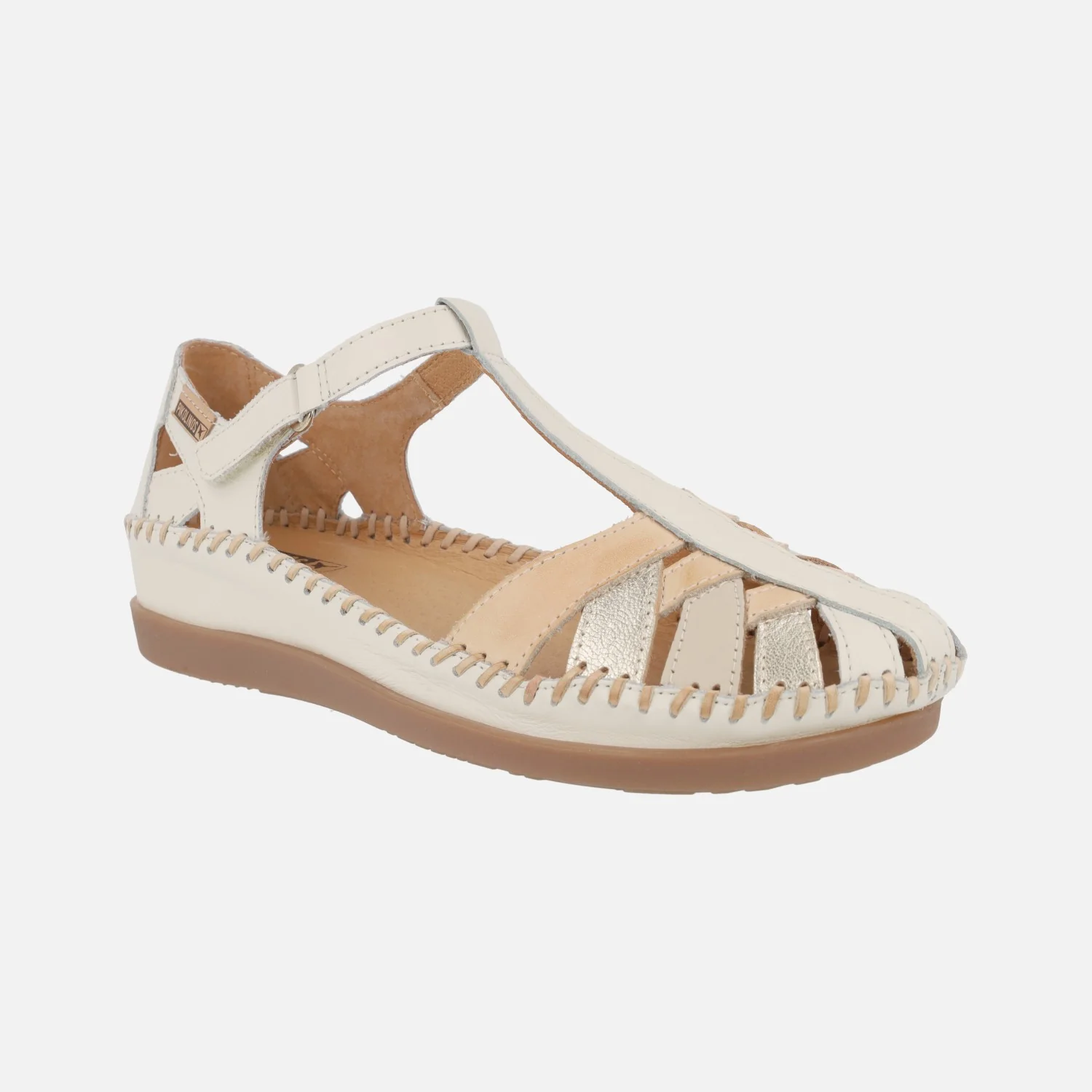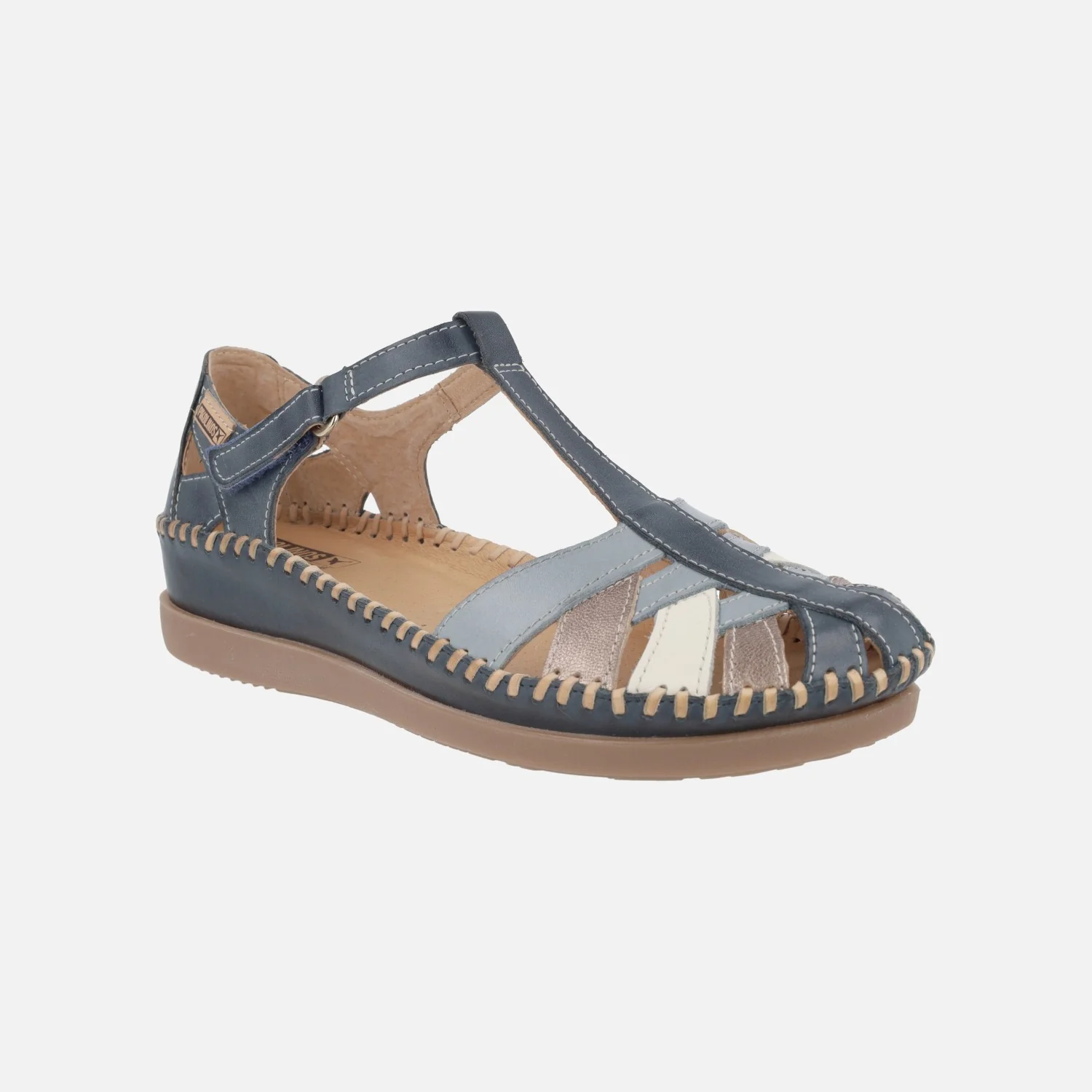 Sandalias semiabiertas para mujer de la marca Pikolinos, modelo Cadaques W8K-0705C1 disponibles en combinado nata (distintos tonos de beige y oro claro), brandy (marrón y dorado) y ocean (azul, beige y bronce). Sandalias estilo cangrejeras, cerradas en la parte delantera y por atrás, abiertas por los laterales, con cierre de velcro. Interiores forrados de piel. Piso sintético, con una altura total de 4,5 cms en la parte trasera (2,5 cms parte delantera).