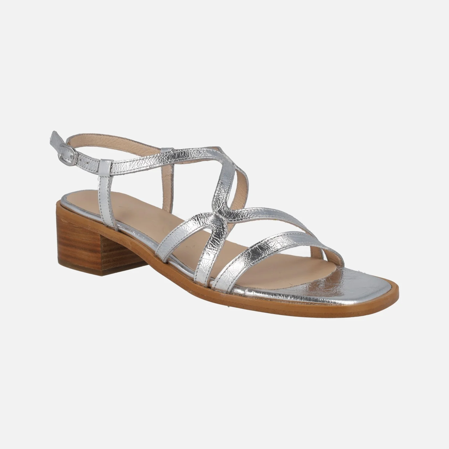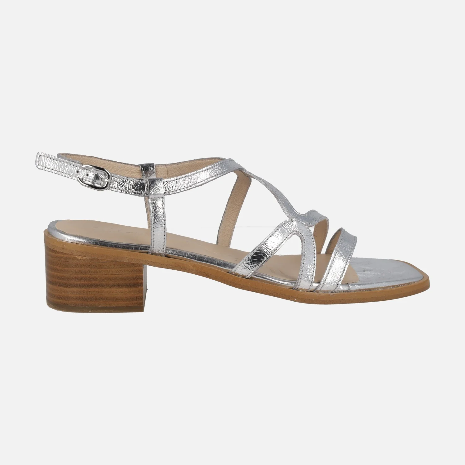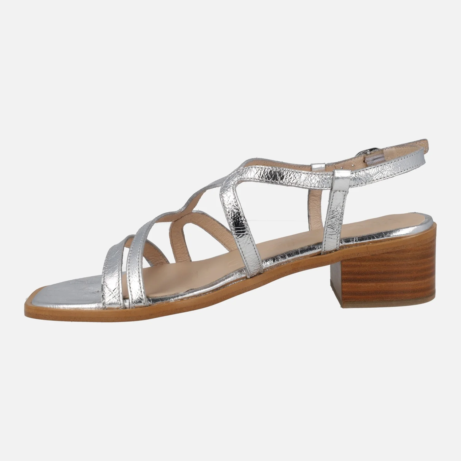 Sandalias de tacón bajo Wonders Lily D-1110 Plata. Sandalias elaboradas en piel metalizada plateada, con cierre de hebilla al talón. Forro y planta de piel. Tacones anchos de 5 cms de altura. Made in Spain.