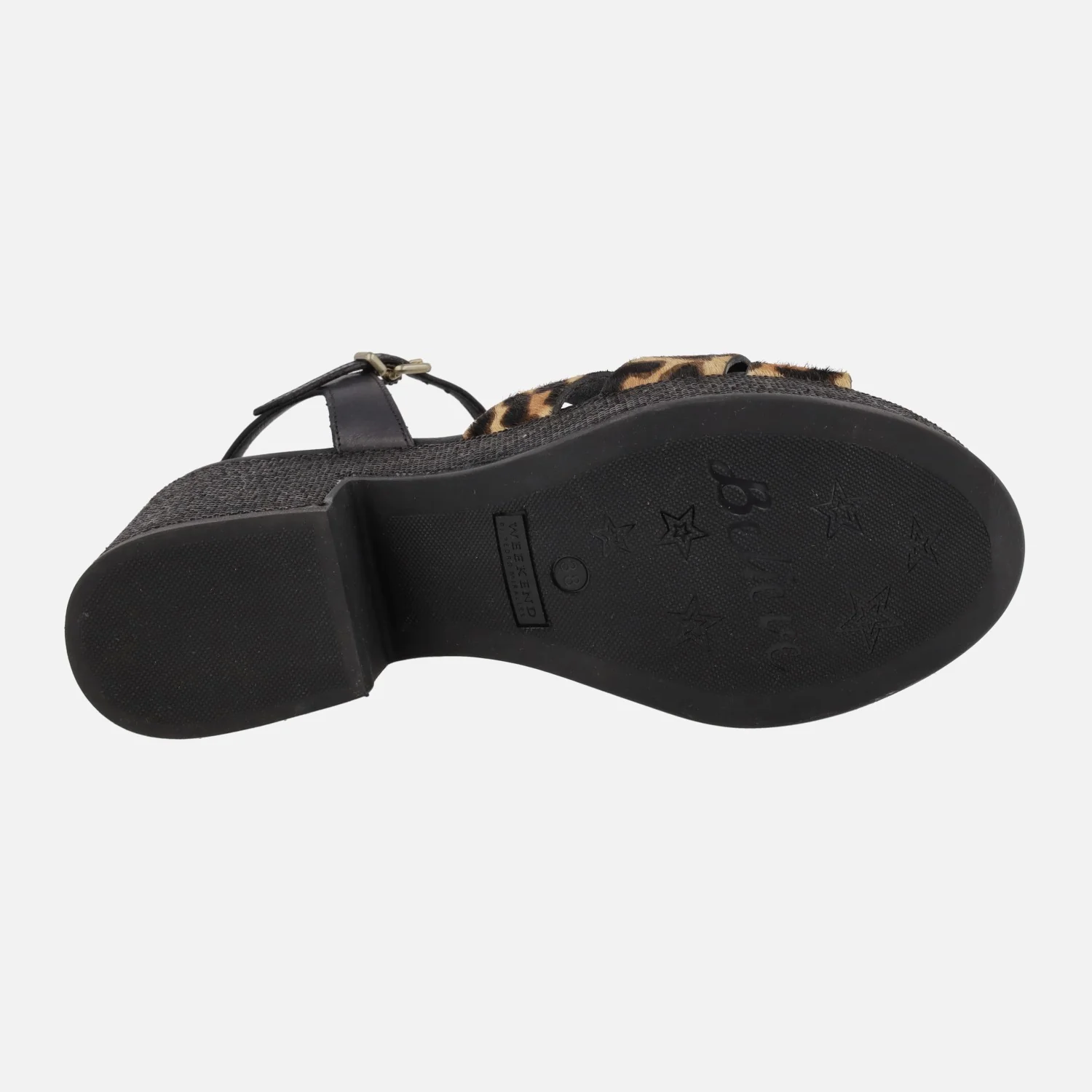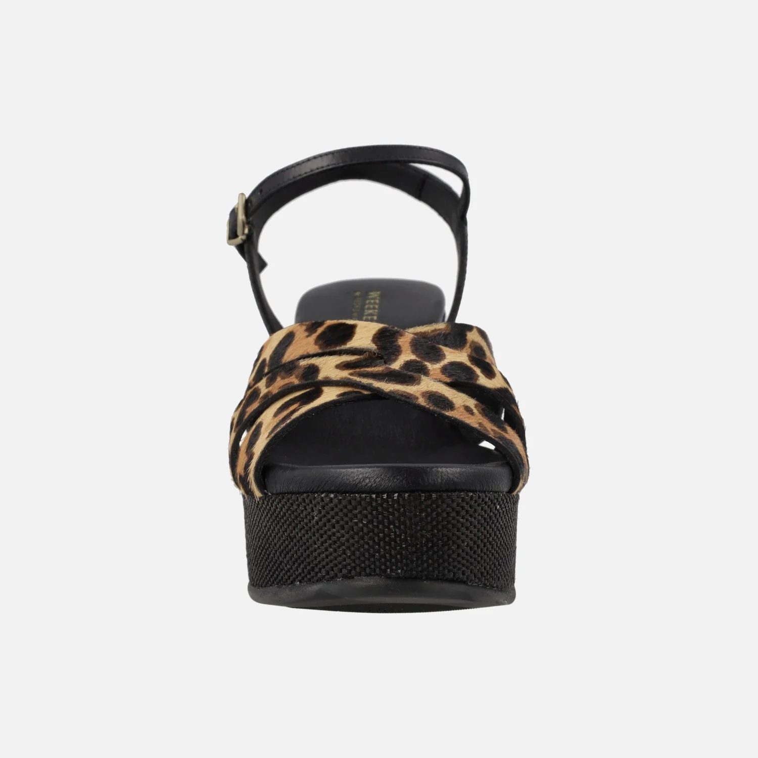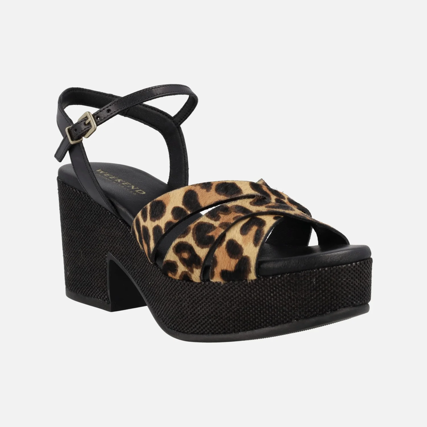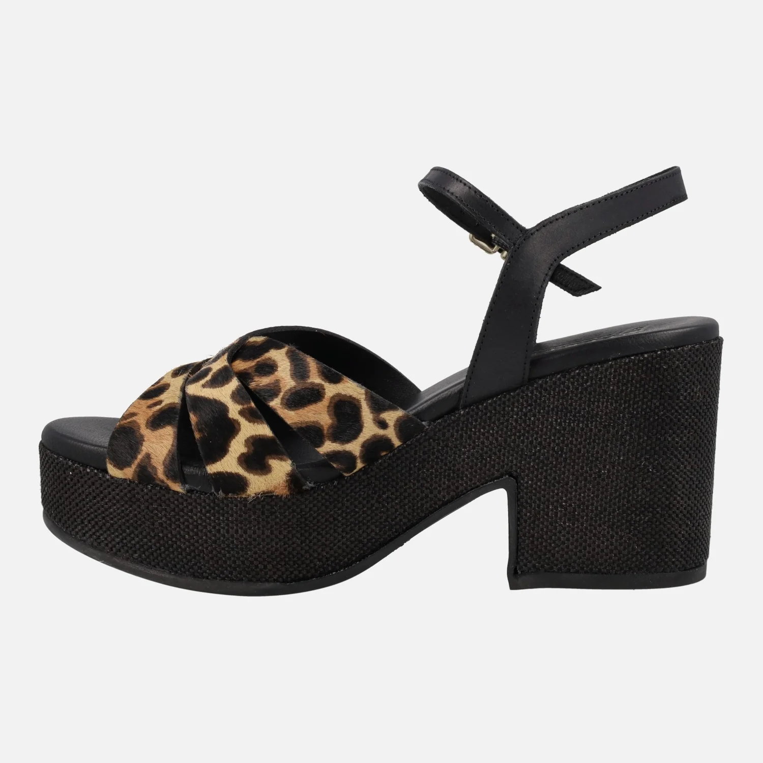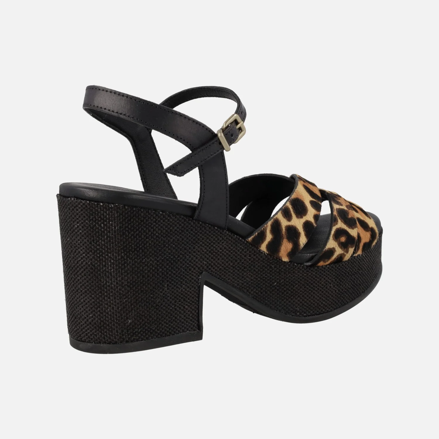 Preciosas sandalias de tacón y plataforma de la marca Pedro Miralles, línea Weekend, modelo Zael 15831 Pony leopardo camel. Sandalias elaboradas en piel con pelo animal print leopardo. Pulsera al tobillo con cierre de hebilla. Interior en piel + sintéticos. Plataforma efecto rafia en color negro, con una altura trasera de casi 9 cms y 4 cms de plataforma delantera.