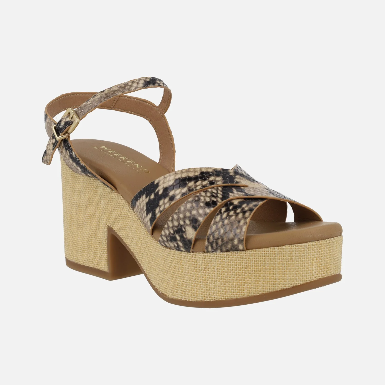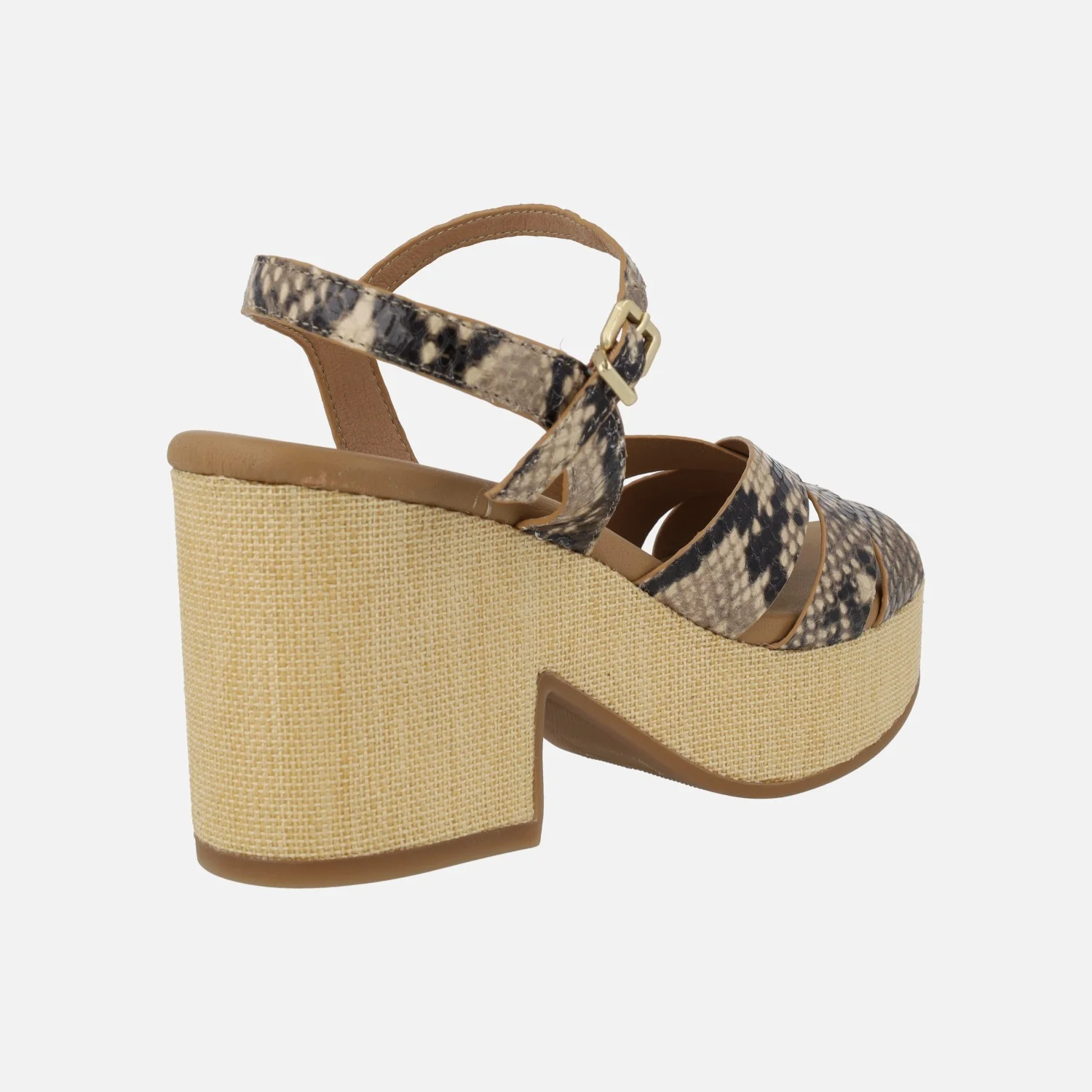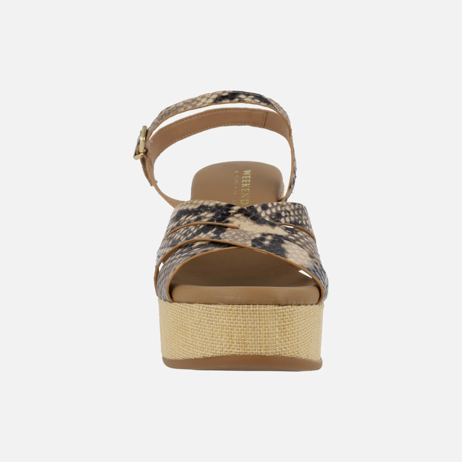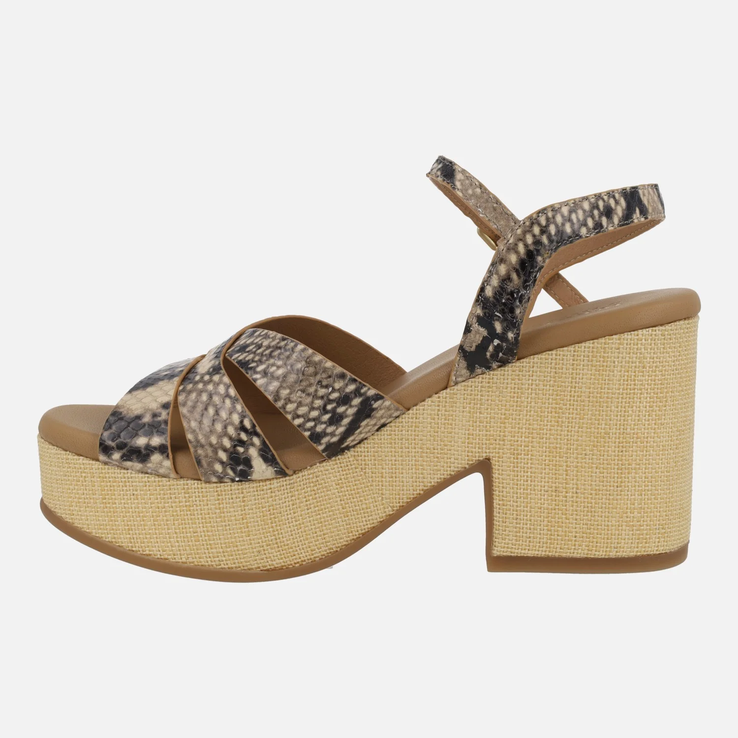 Preciosas sandalias de tacón y plataforma de la marca Pedro Miralles, línea Weekend, modelo Zael 15831 Pyton beige. Sandalias elaboradas en piel animal print serpiente. Pulsera al tobillo con cierre de hebilla. Interior en piel + sintéticos. Plataforma efecto rafia en color natural, con una altura trasera de casi 9 cms y 4 cms de plataforma delantera.