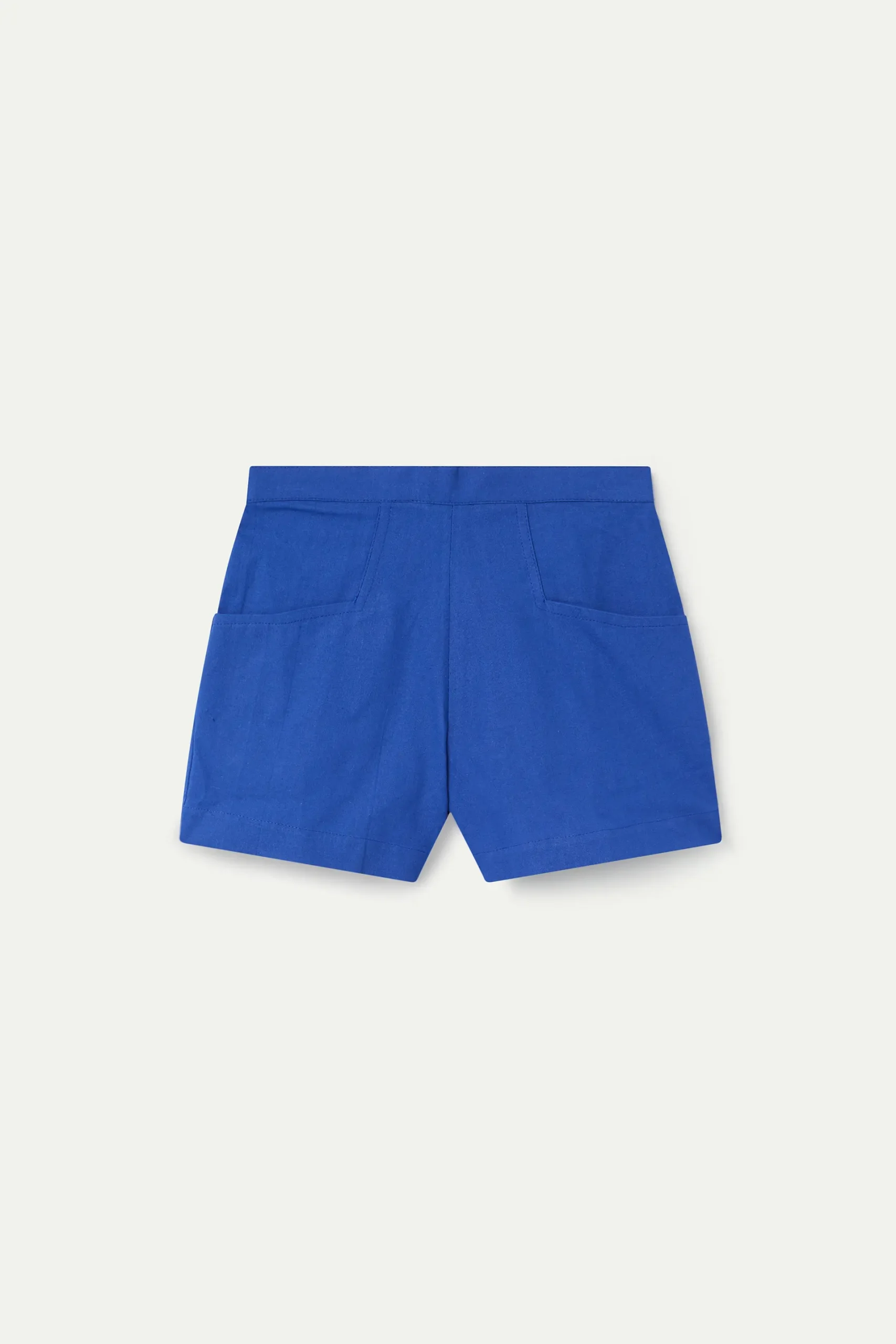 Shorts de niña con tejido 100% algodón de color azul marino. Cintura fija elástica de tiro alto. Bolsillos frontales funcionales. La modelo mide 135 cm y lleva la talla 8-9 años.
