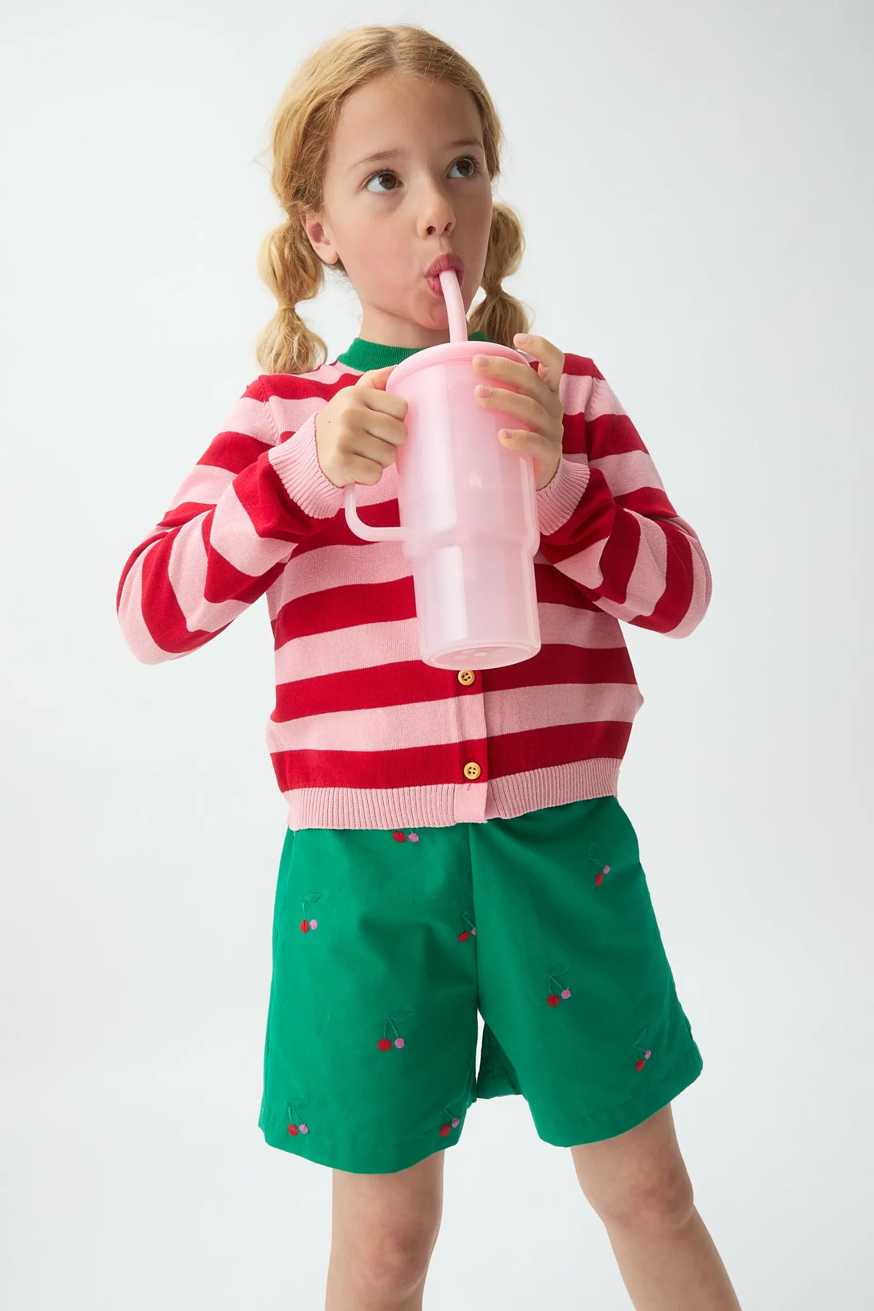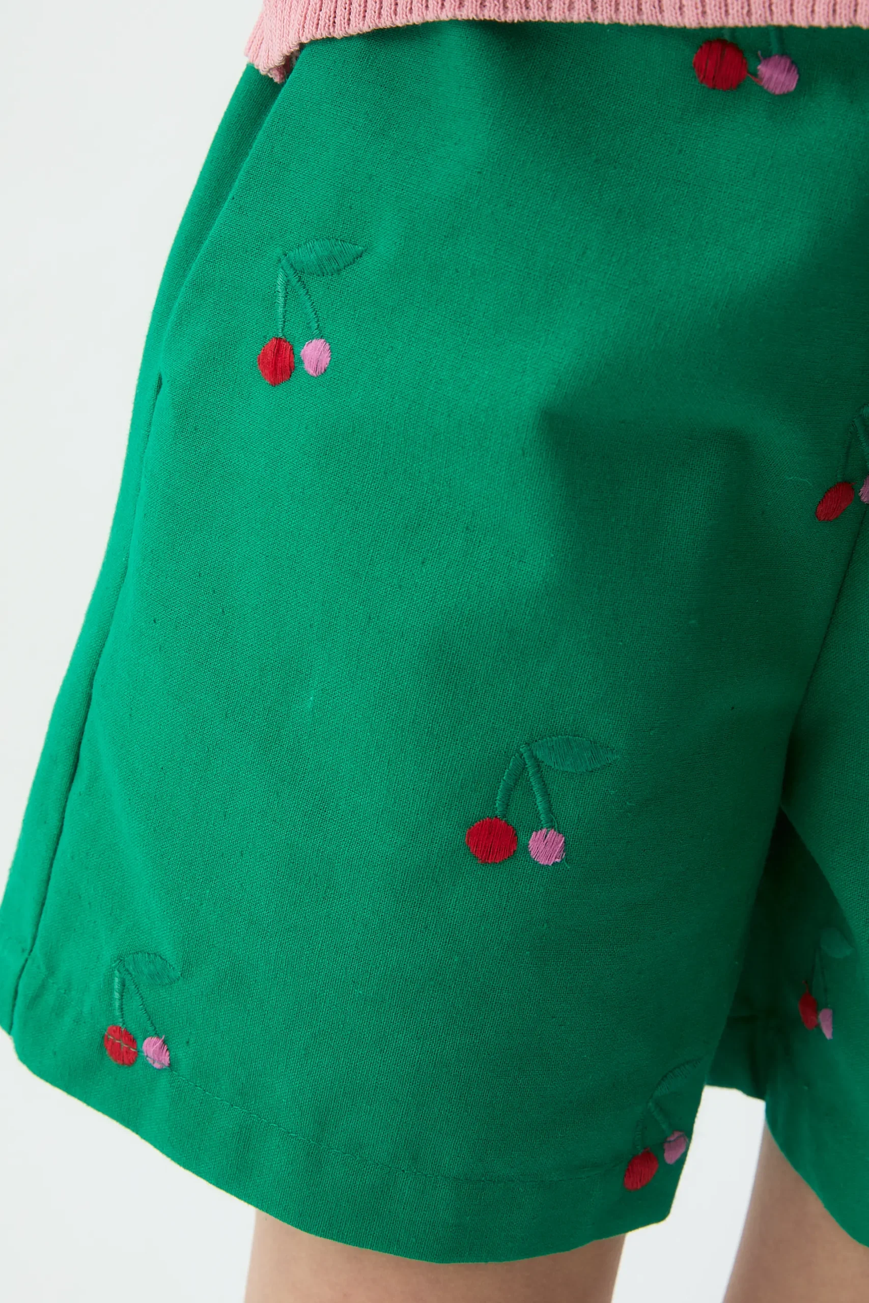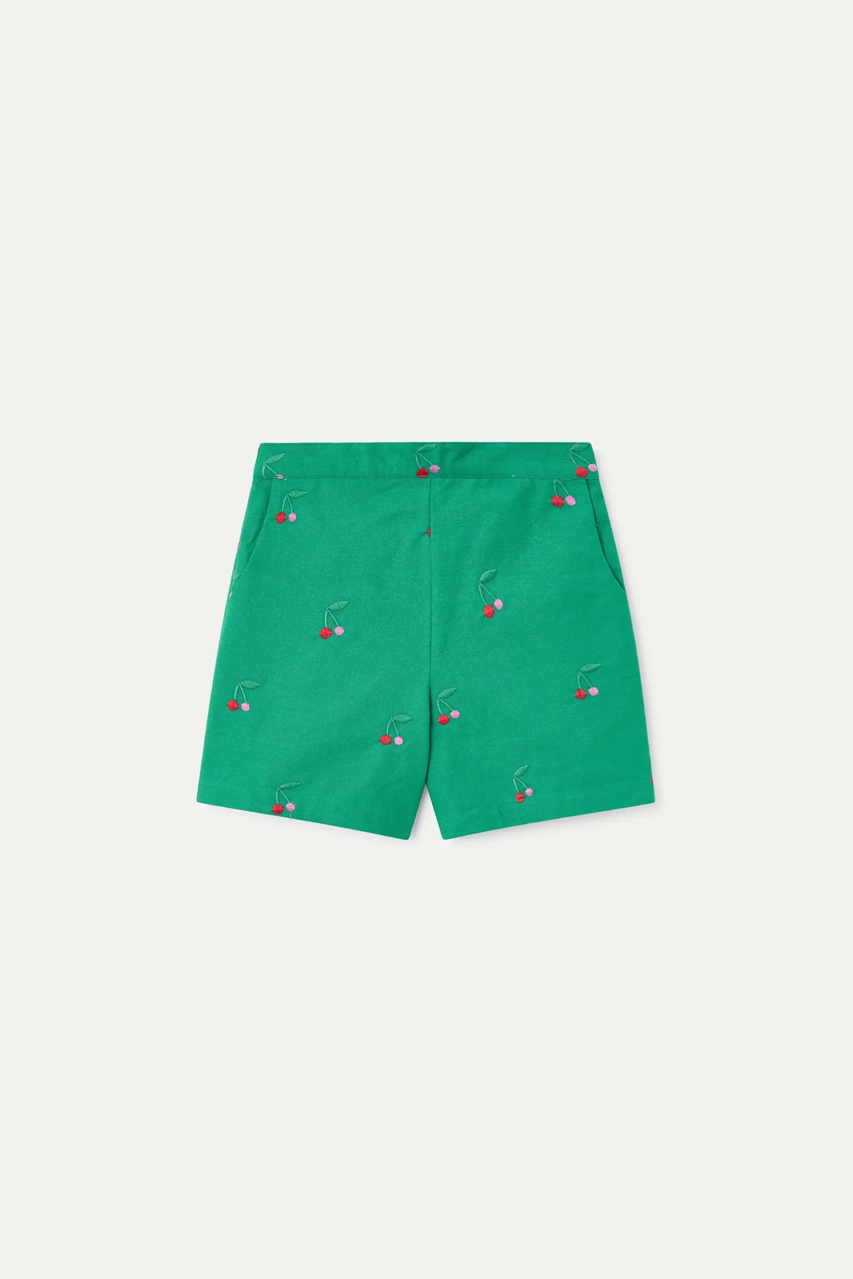 Shorts de niña con tejido 100% algodón de color verde con estampado de cherries. Cintura fija elástica de tiro algo. Bolsillos laterales.La modelo mide 126 cm y lleva la talla 8-9 años.