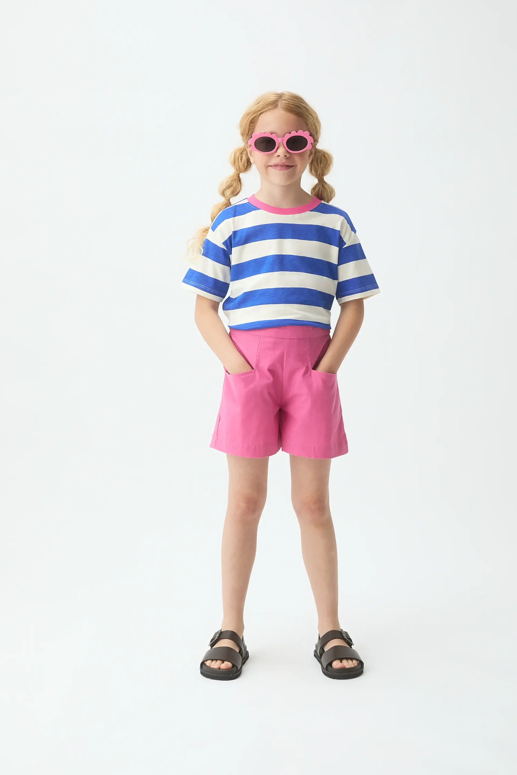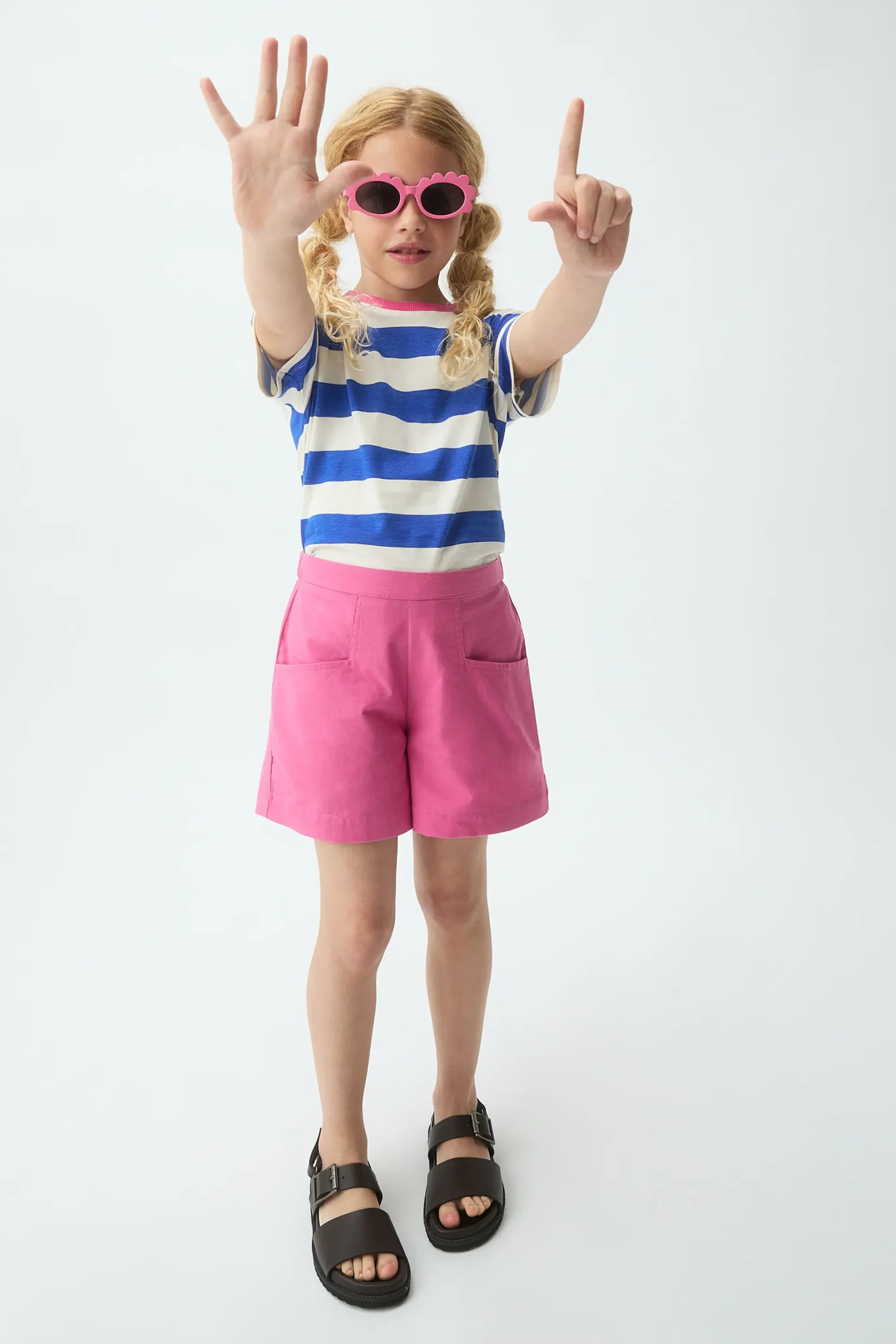 Shorts de niña con tejido 100% algodón de color rosa. Cintura fija elástica de tiro alto. Bolsillos frontales funcionales. La modelo mide 126 cm y lleva la talla 8-9 años.