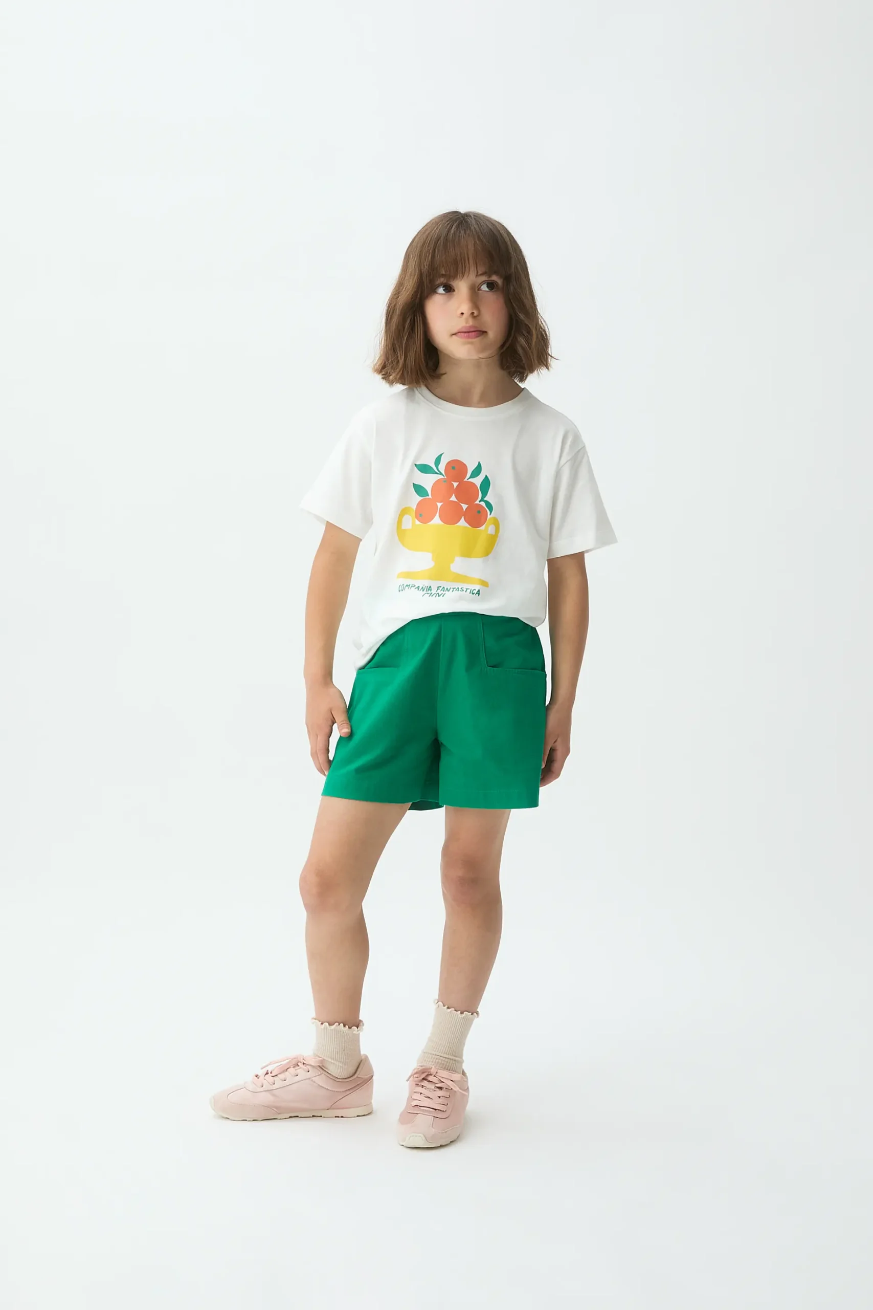 Shorts de niña con tejido 100% algodón de color verde. Cintura fija elástica de tiro alto. Bolsillos frontales funcionales. La modelo mide 127 cm y lleva la talla 8-9 años.