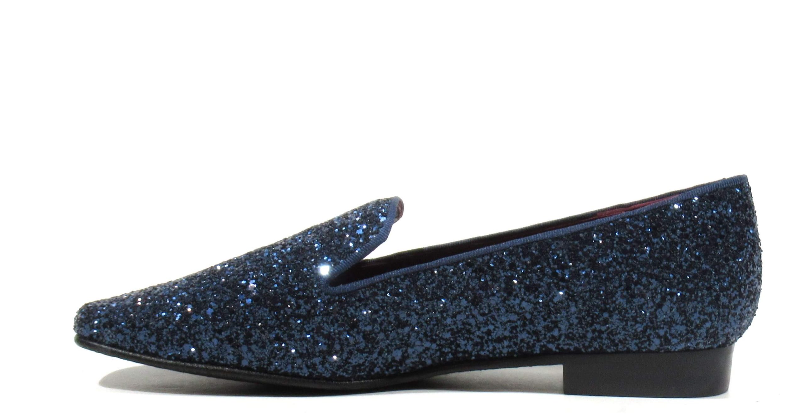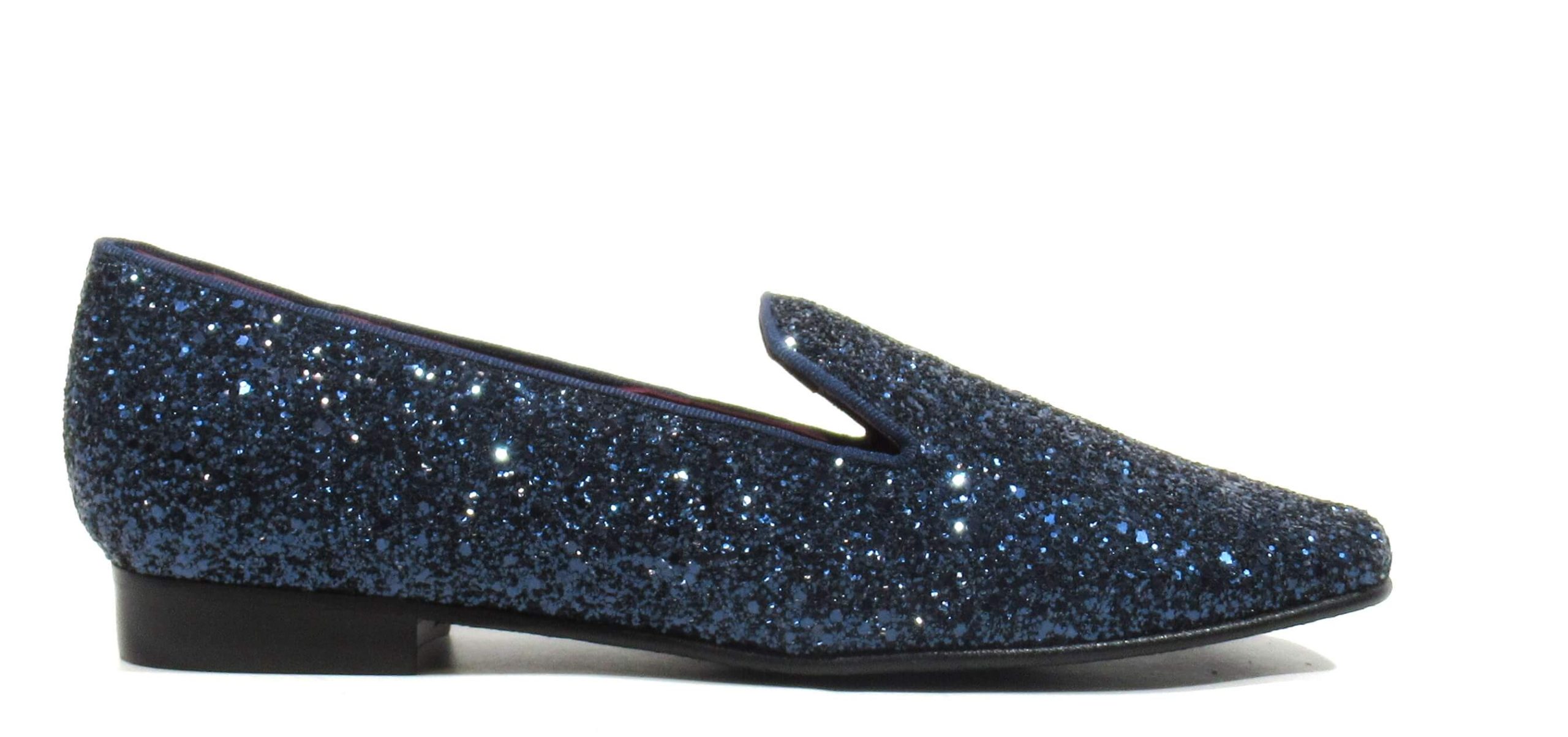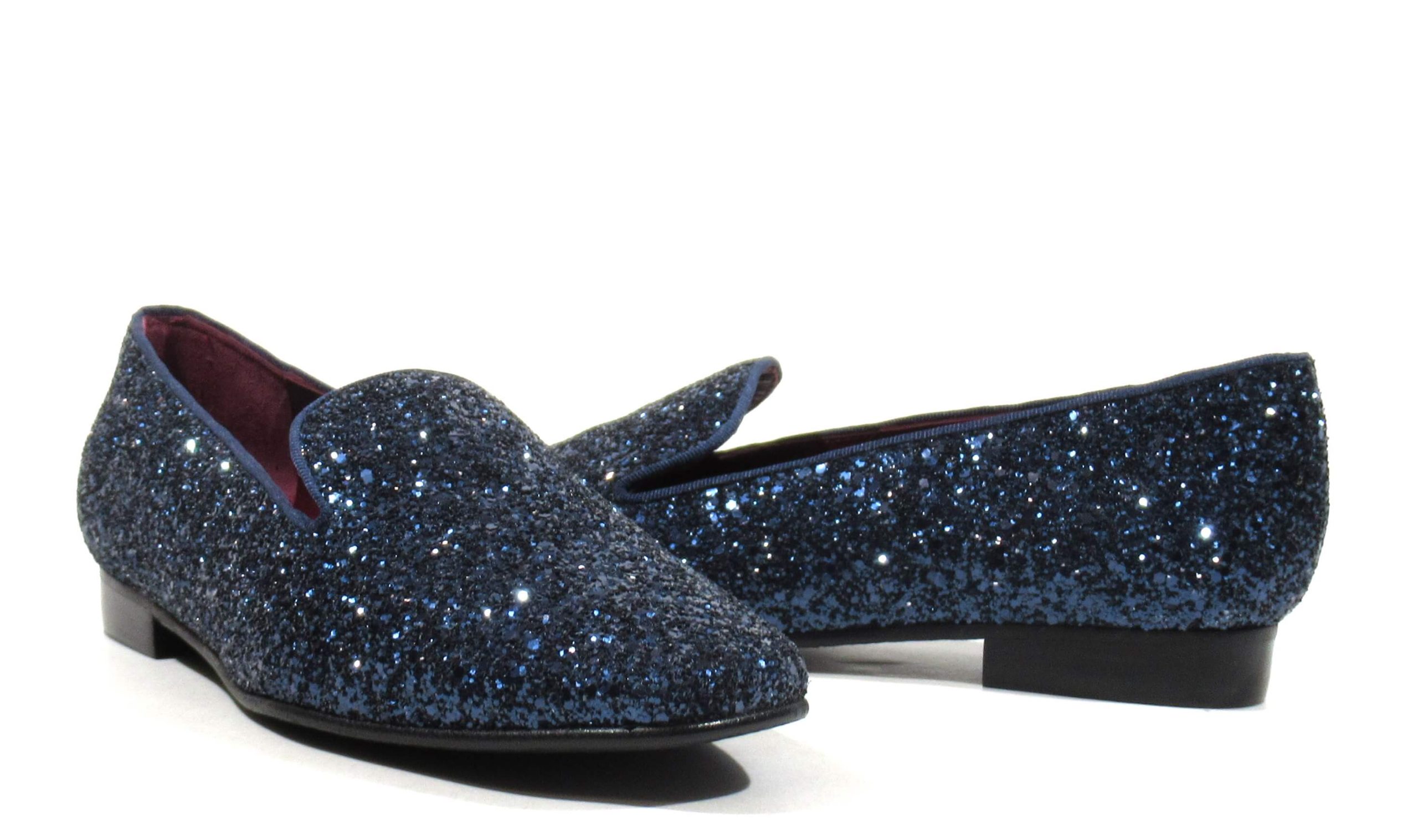Preciosos slippers para mujer de la marca española Ruth Secret, modelo S4005. Elegantes mocasines elaborados en glitter y disponibles en azul marino, negro o marrón. Ideales para darle un toque sofisticado a tus looks. Interiores de piel. Piso plano, de apenas 2 cms de altura. Made in Spain.