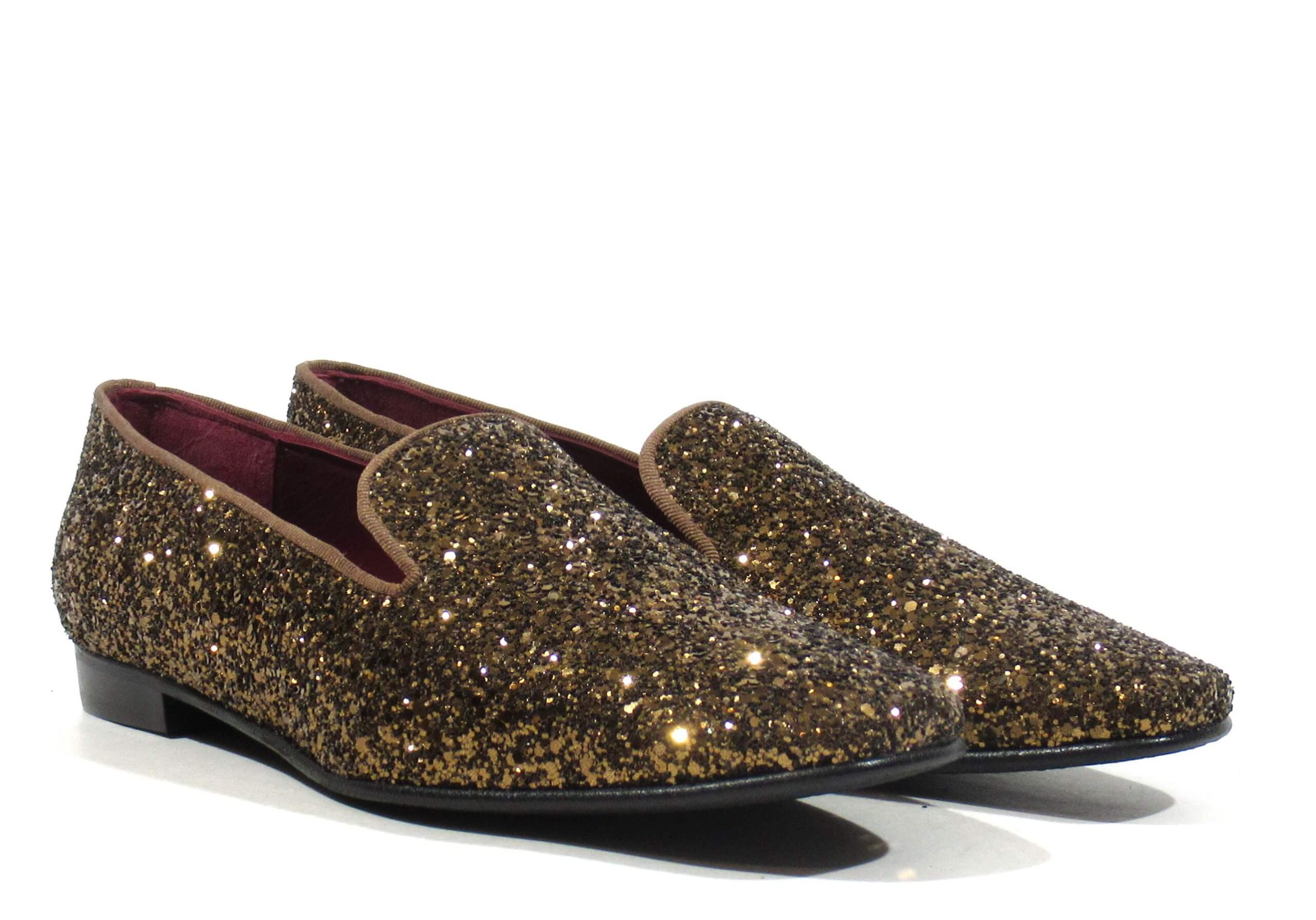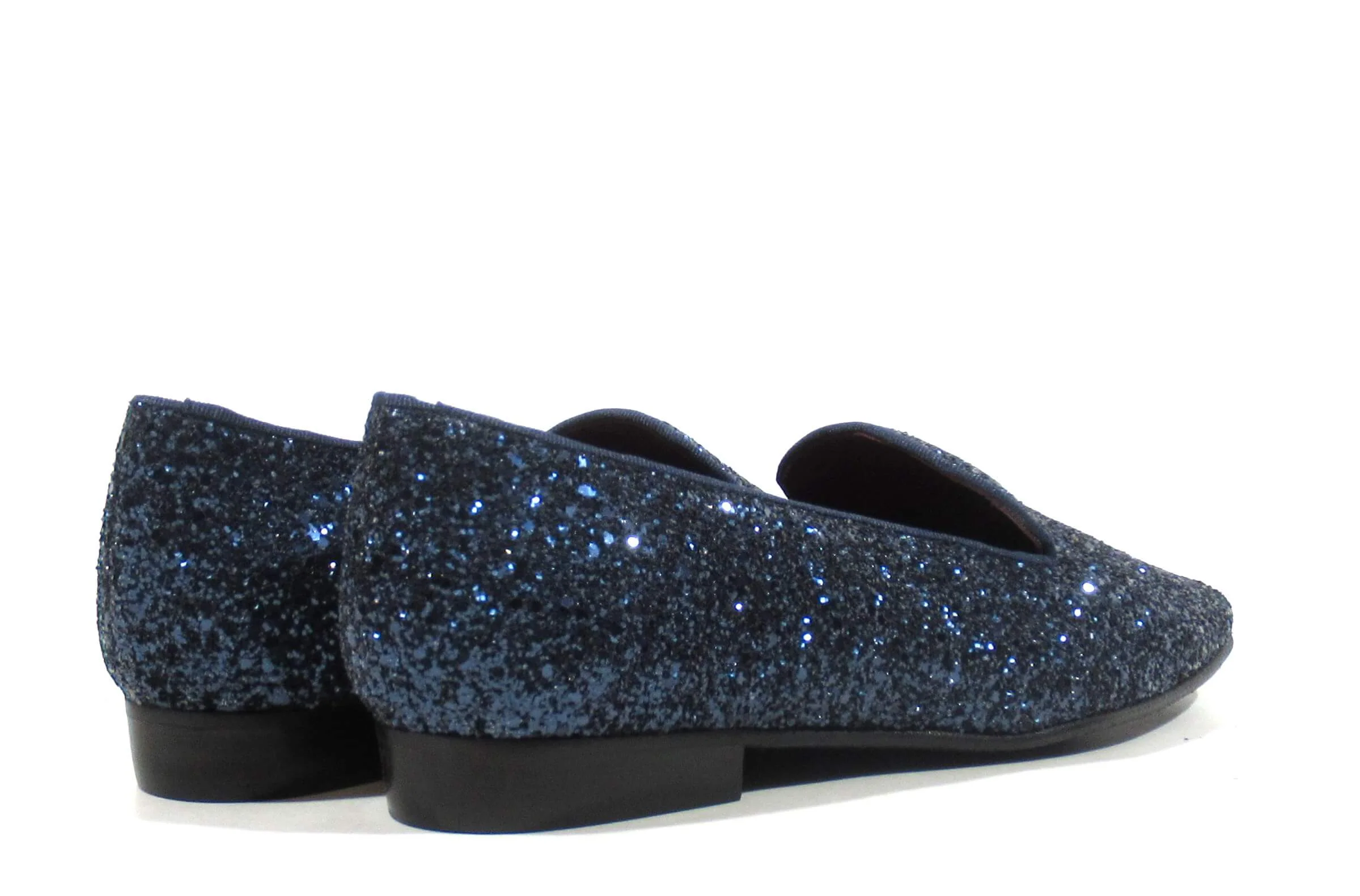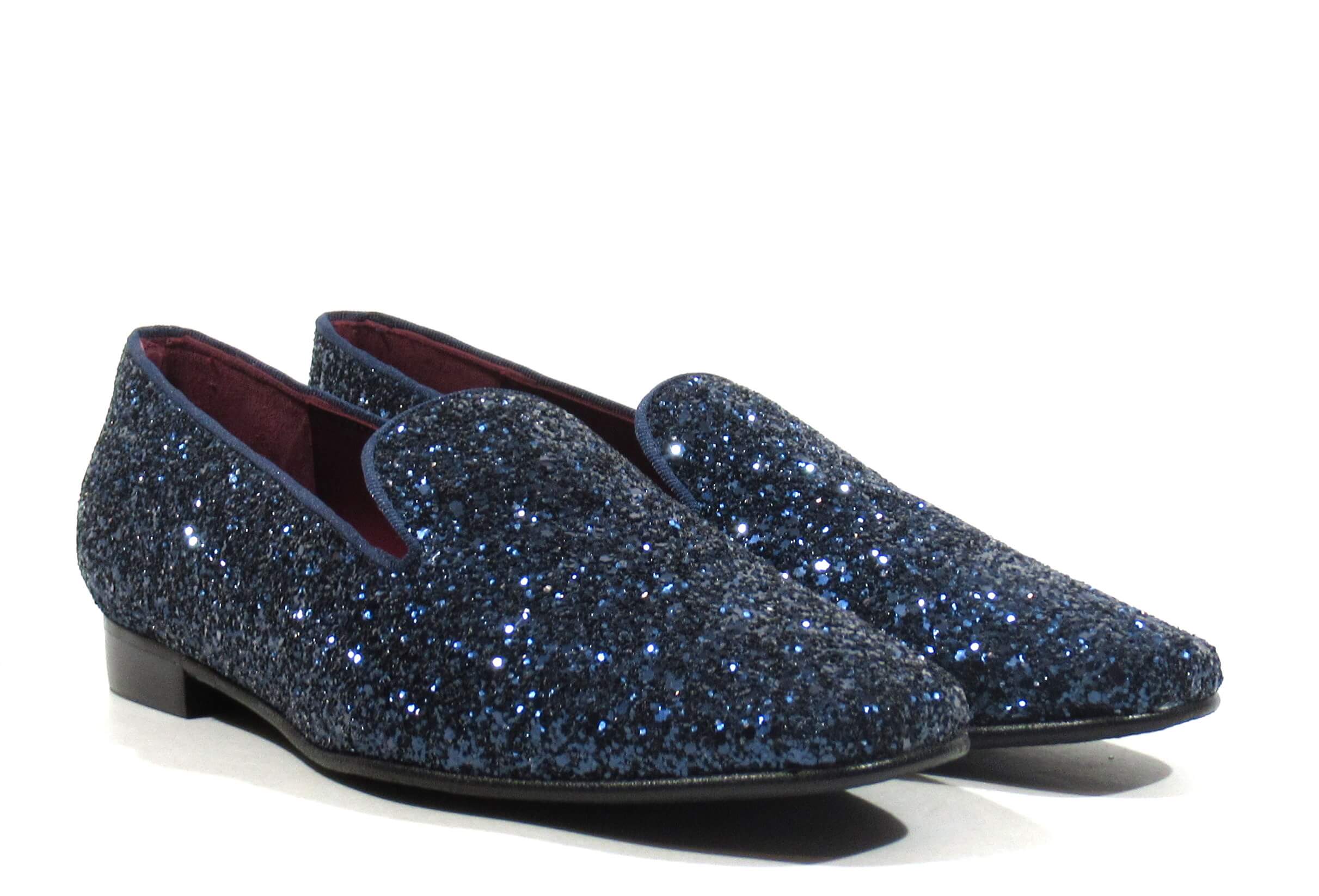 Preciosos slippers para mujer de la marca española Ruth Secret, modelo S4005. Elegantes mocasines elaborados en glitter y disponibles en azul marino, negro o marrón. Ideales para darle un toque sofisticado a tus looks. Interiores de piel. Piso plano, de apenas 2 cms de altura. Made in Spain.
