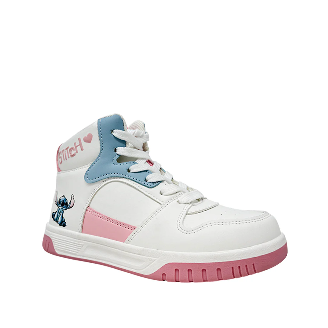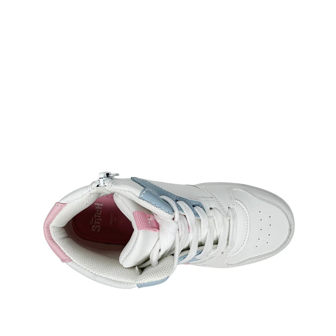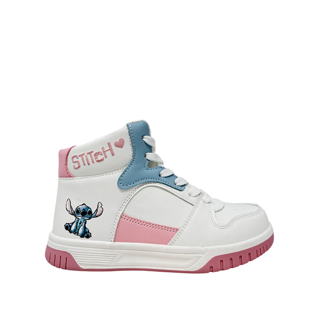 Las sneakers Stitch para niña en color blanco, tipo botín, están fabricadas con material sintético que garantiza comodidad y durabilidad. Con el personaje Stitch, ofrecen un diseño divertido y único que encantará a las pequeñas, aportando estilo y personalidad en cada paso.