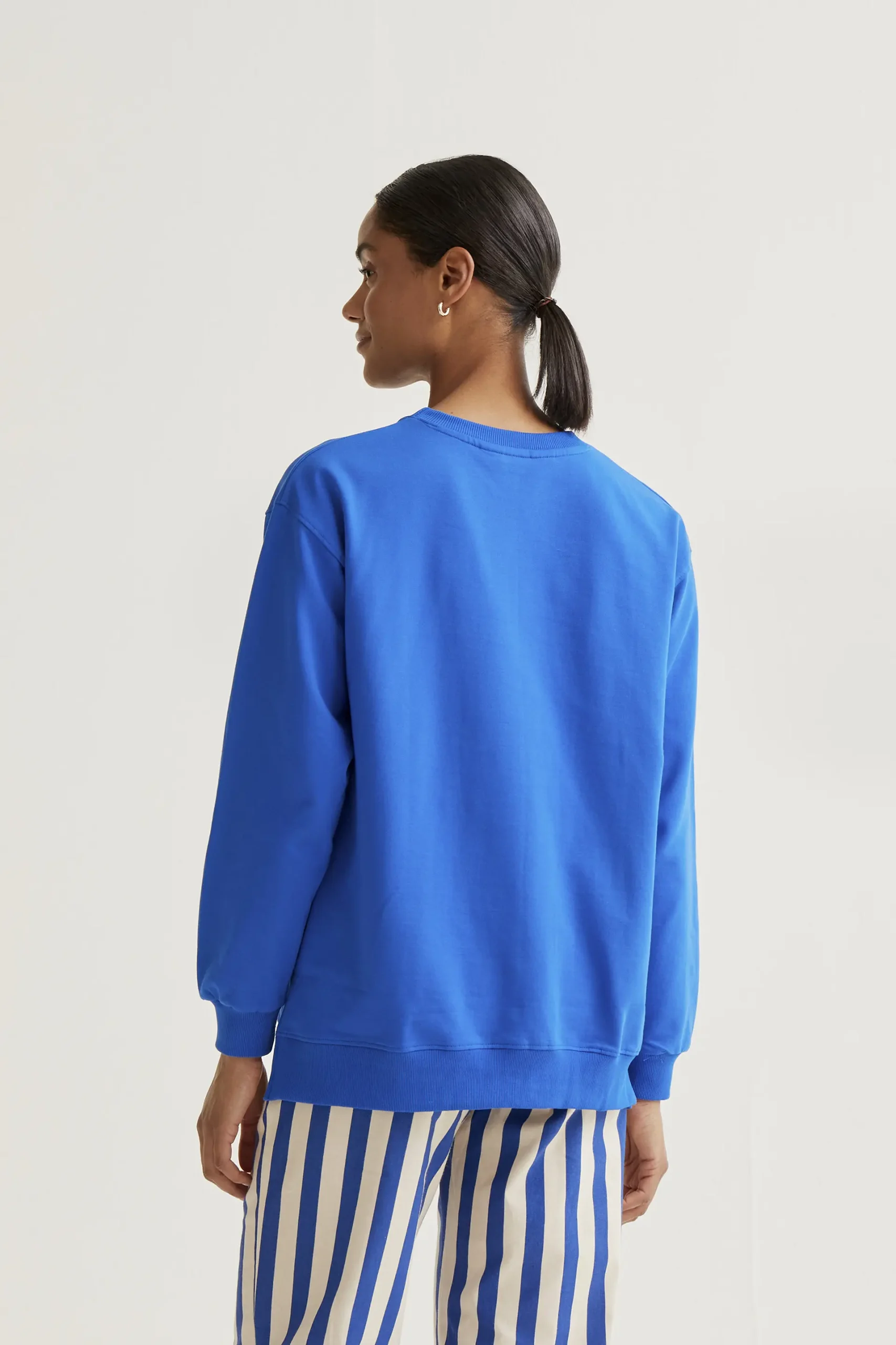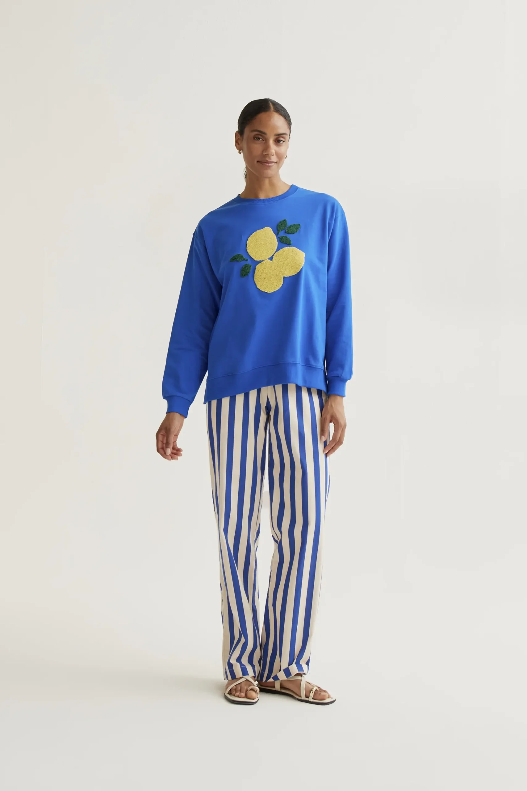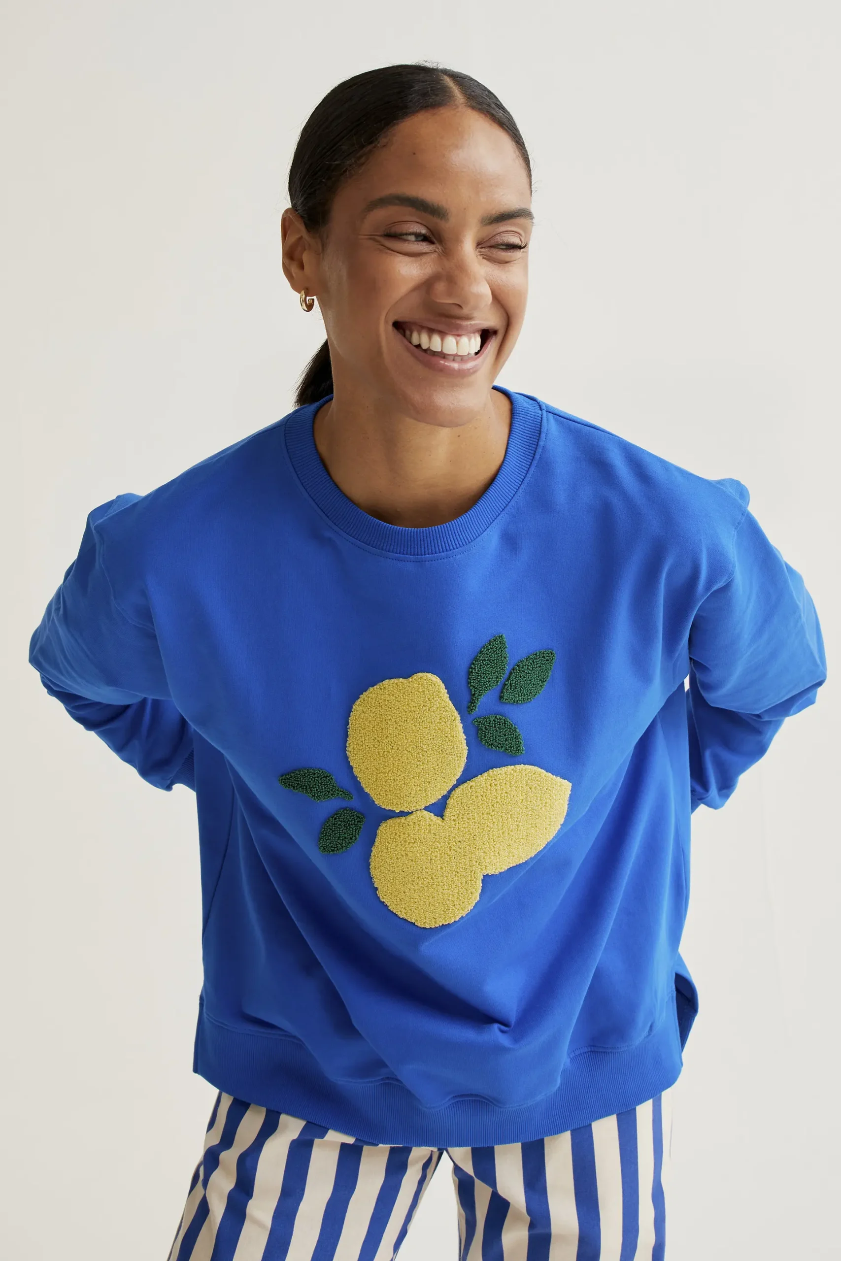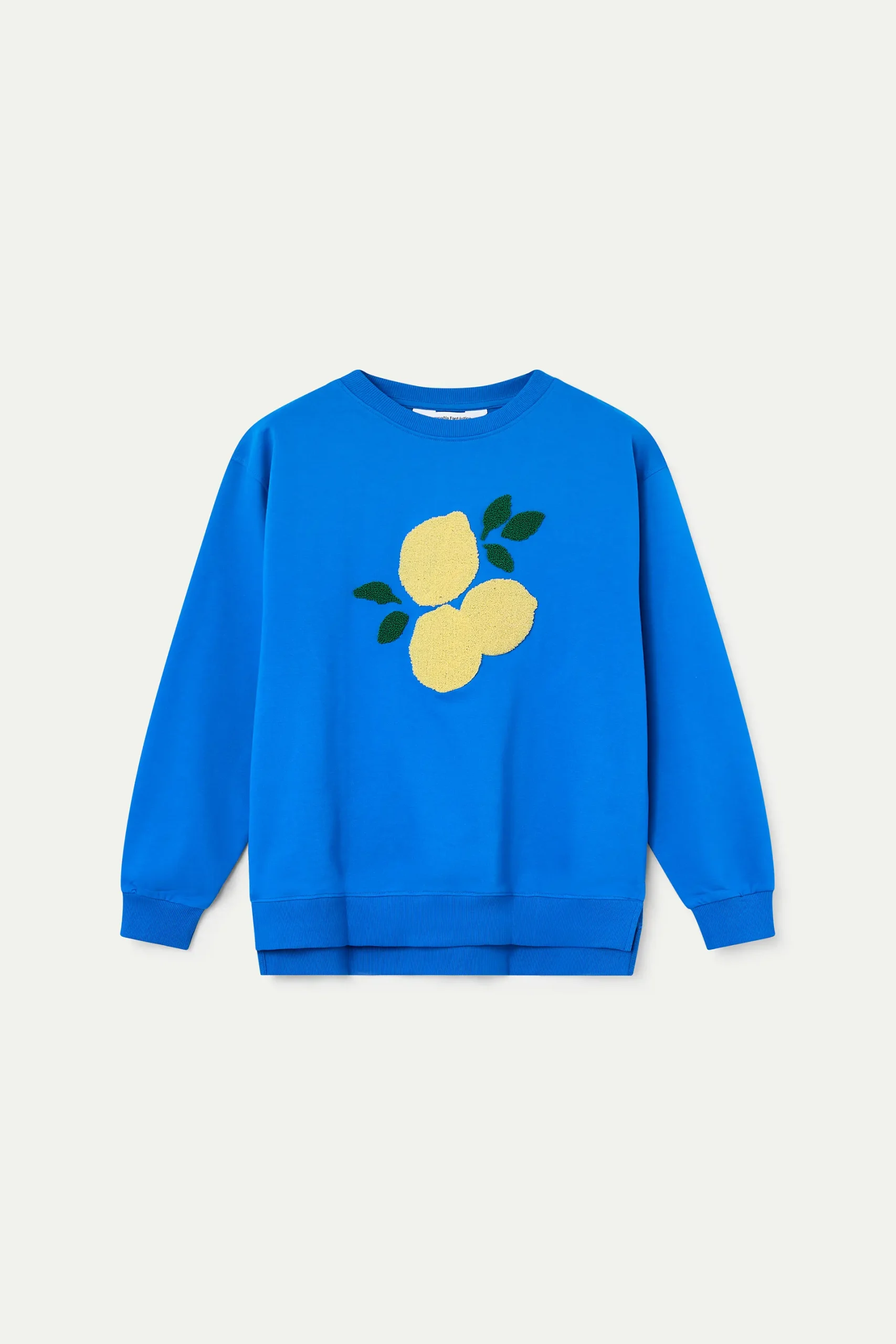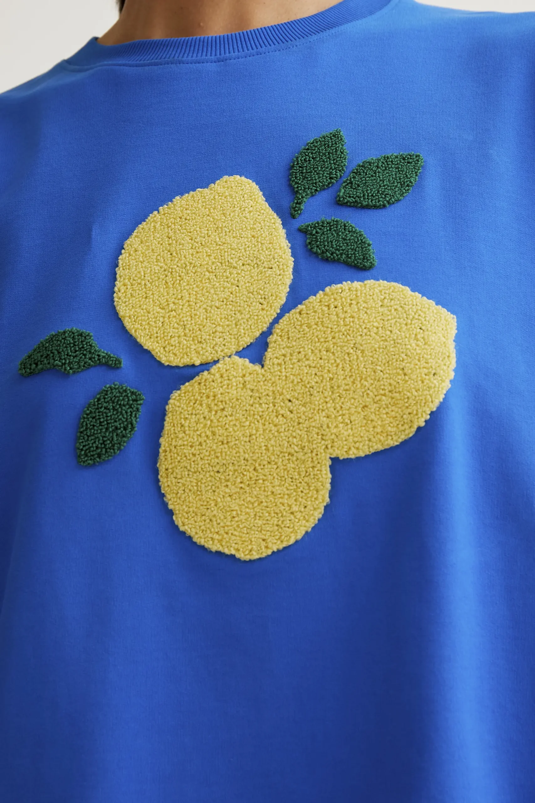 Sudadera de tejido 100% algodón de color azul con bordado de limones gigantes. Cuello redondo y manga larga. Hombro ligeramente caído. Detalles acabados en rib. La modelo mide 173 cm y lleva la talla S.