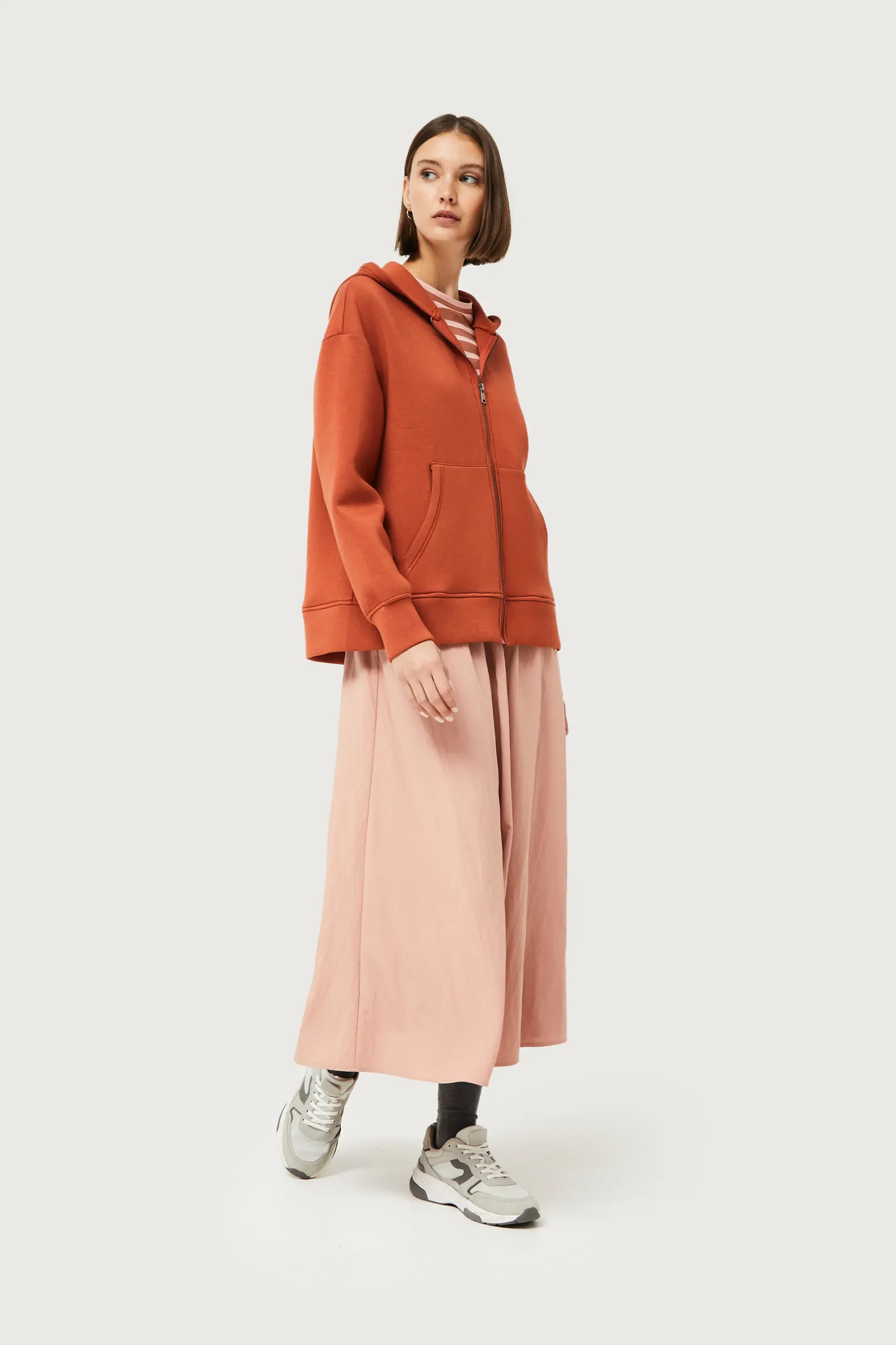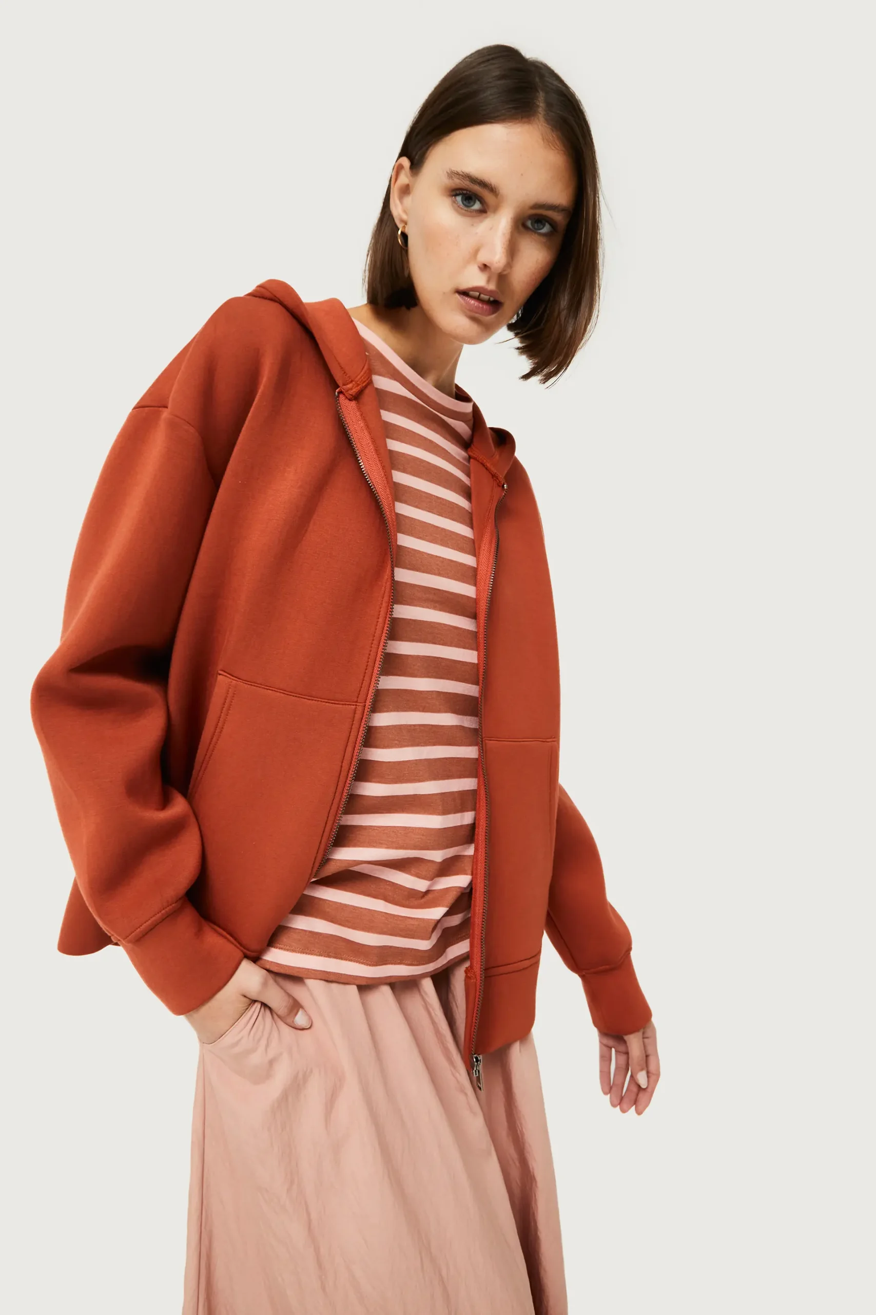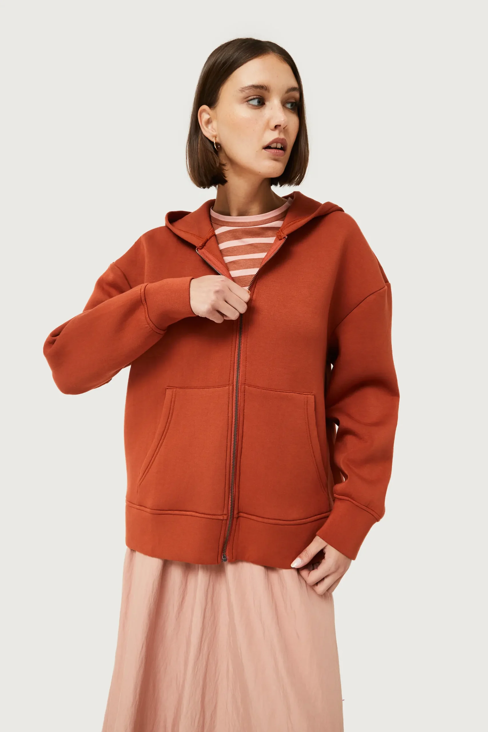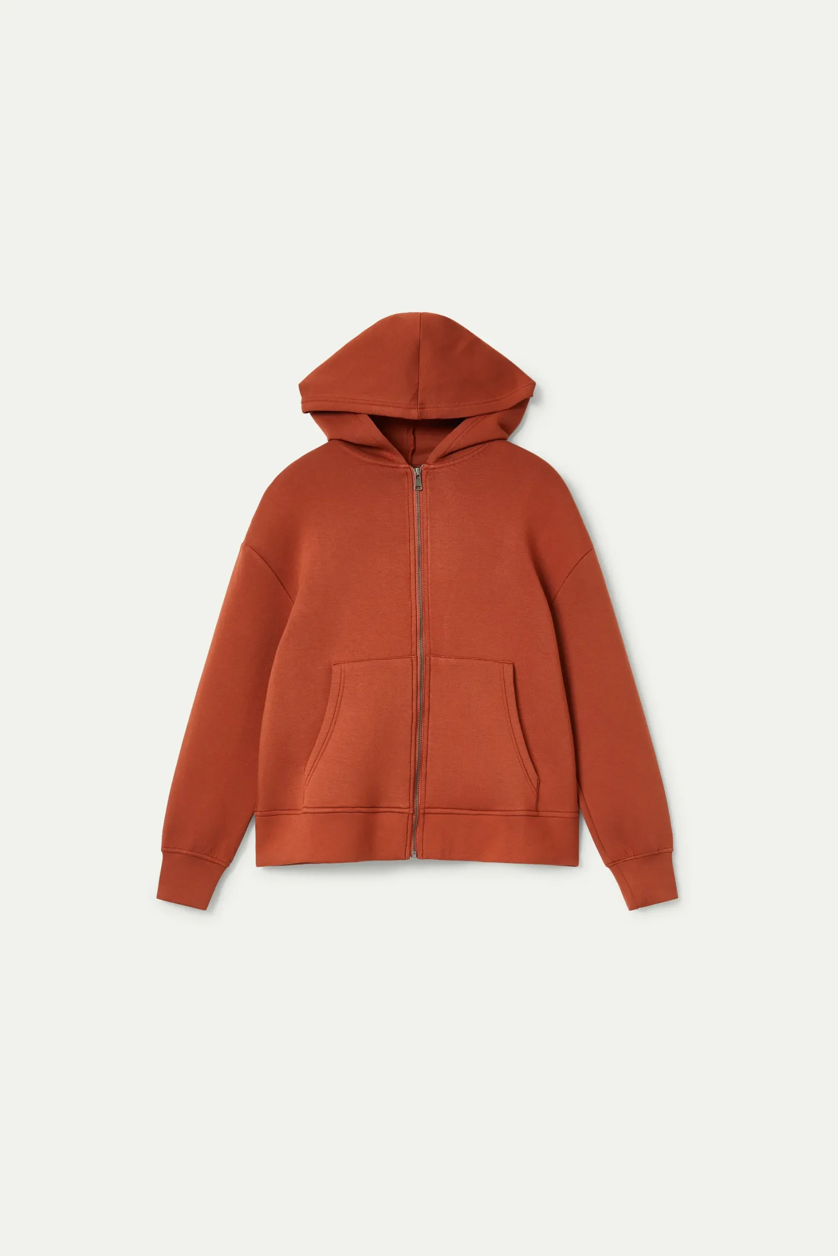 Sudadera de neopreno de color marrón. Con capucha y manga larga. Cierre frontal con cremallera y bolsillos canguro. La modelo mide 176 cm y lleva la talla S.