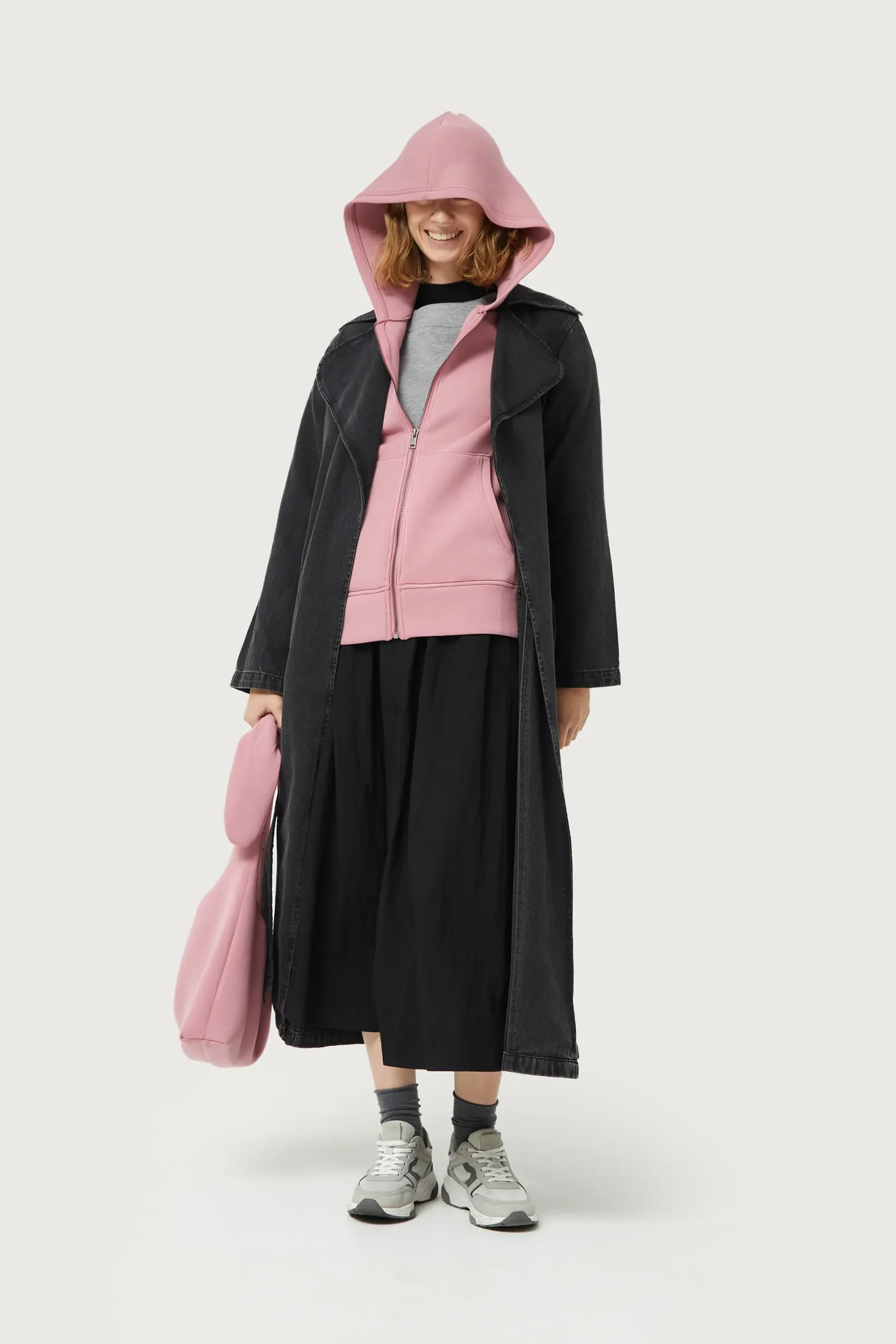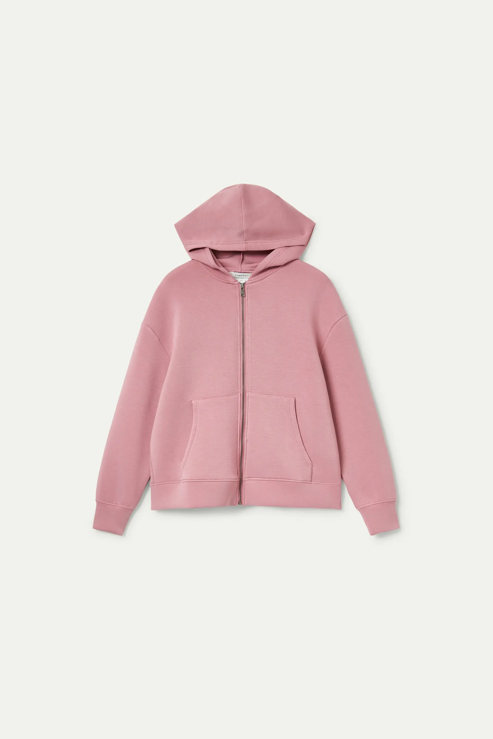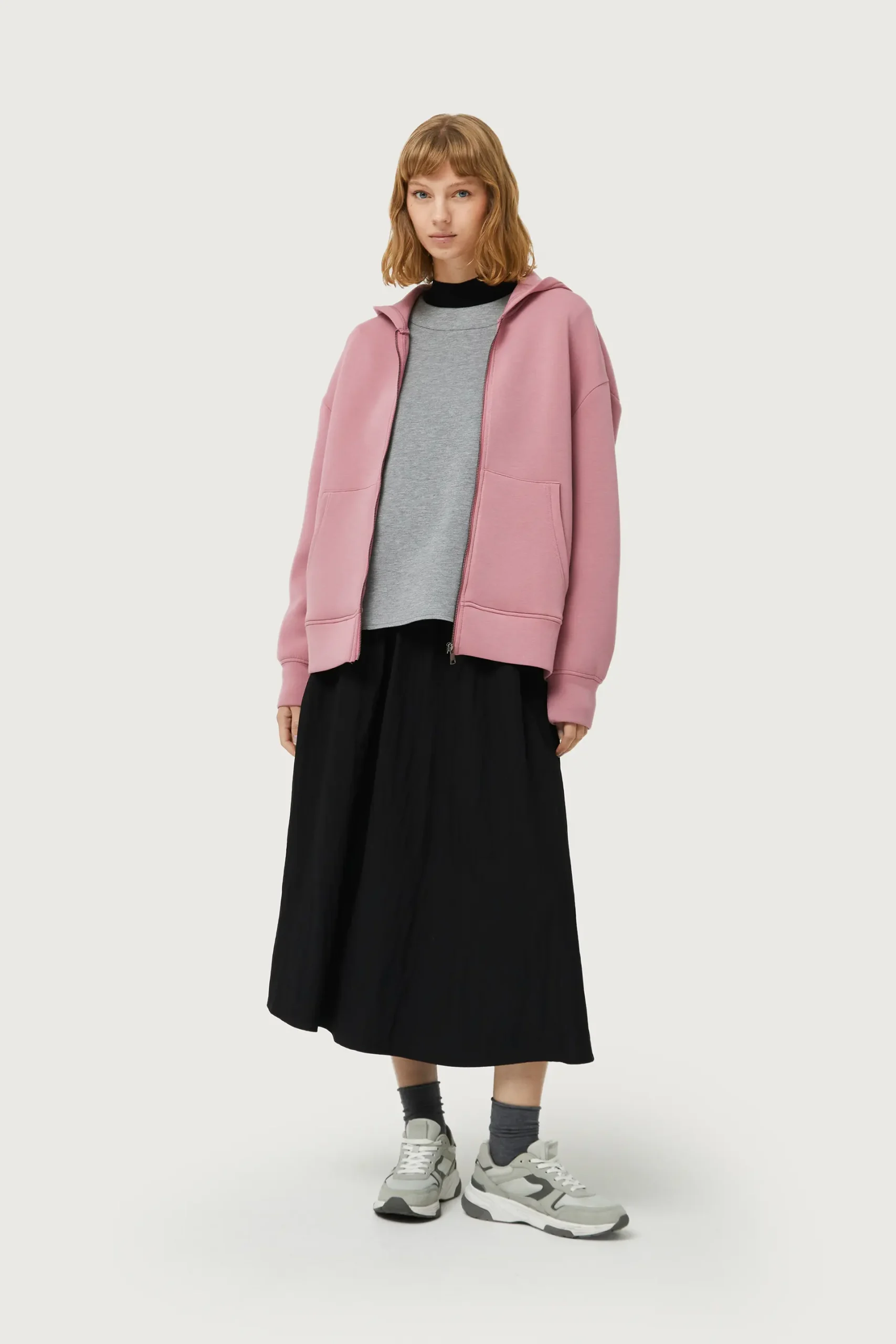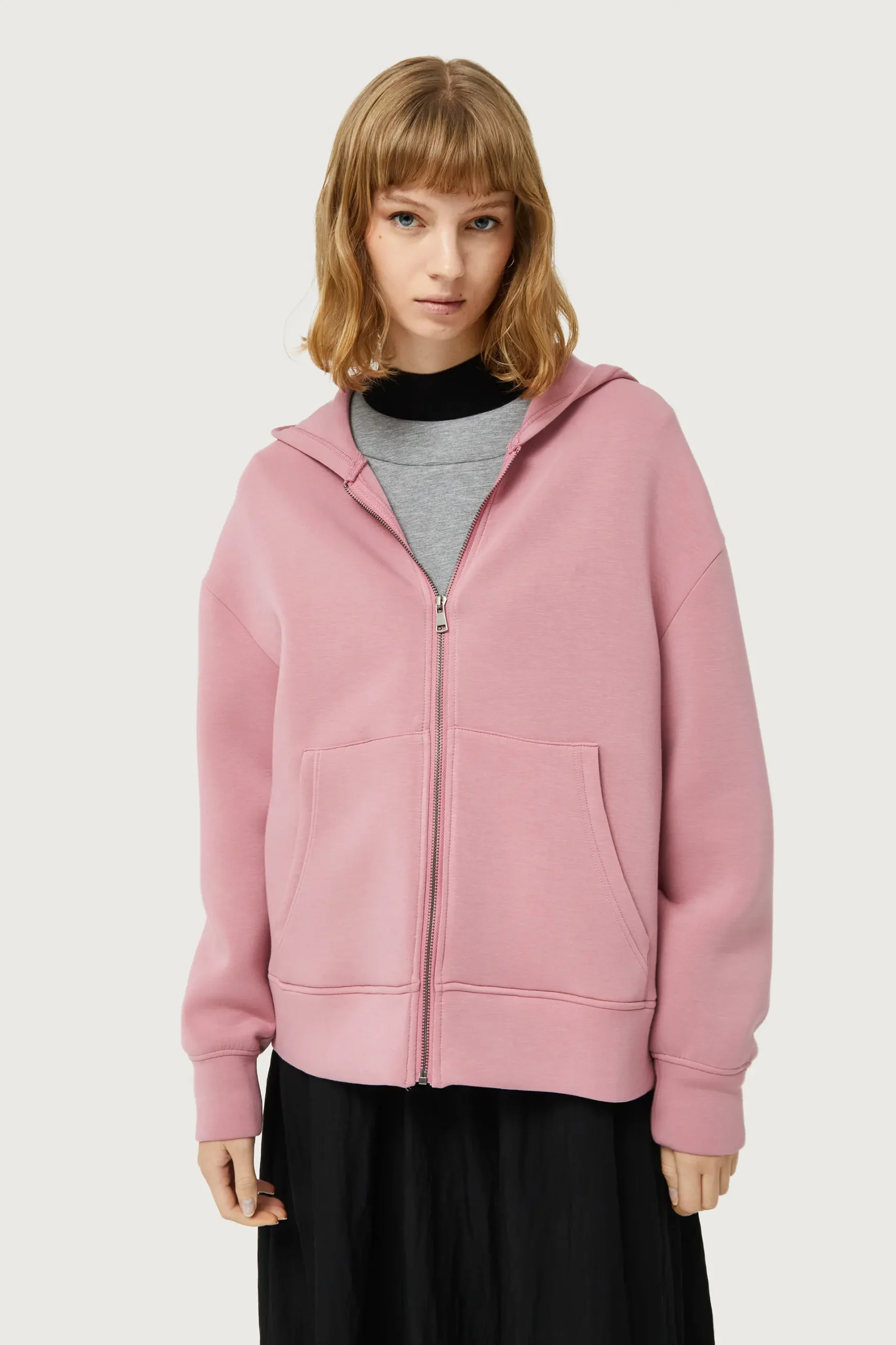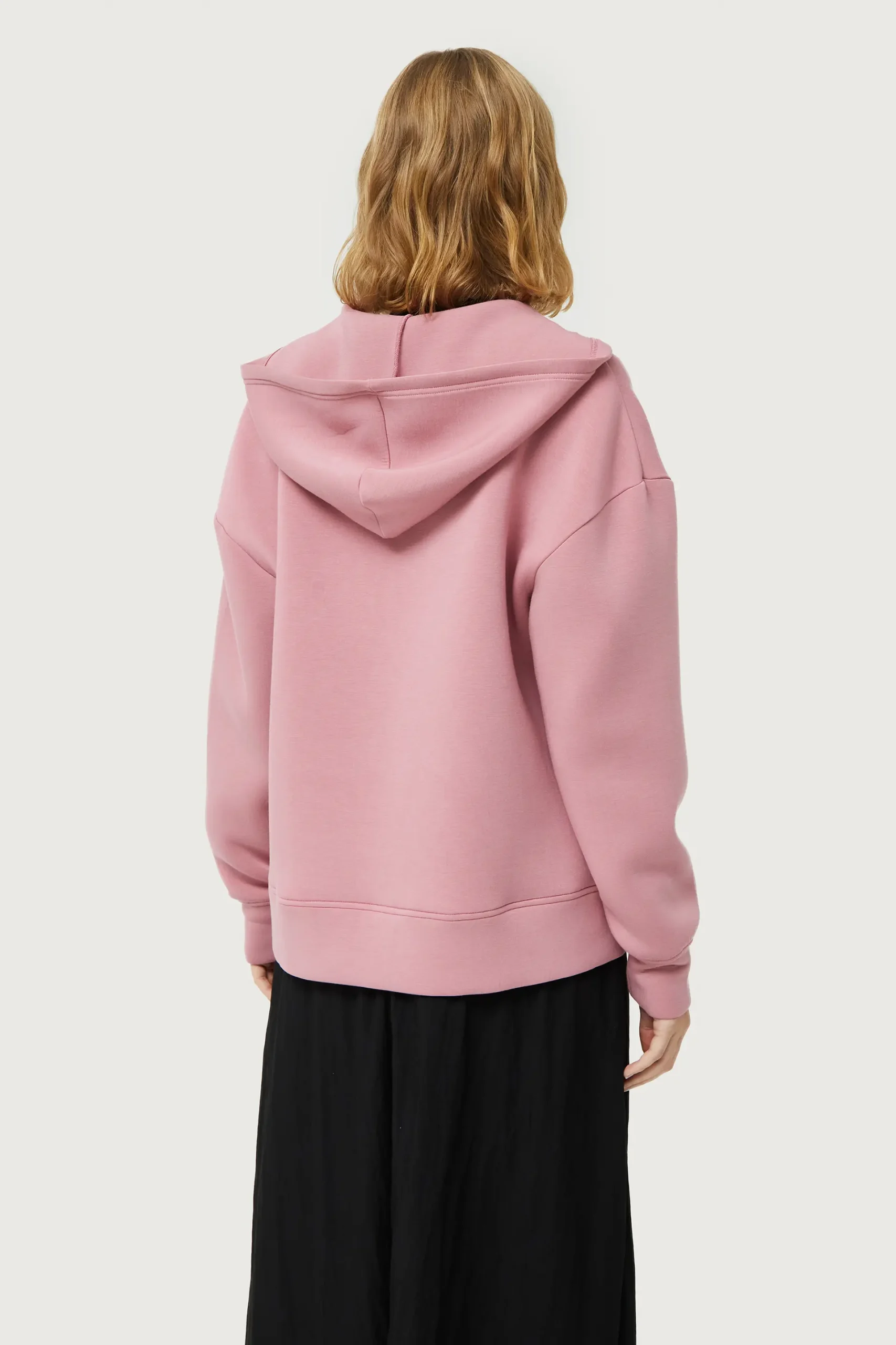 Sudadera de neopreno de color rosa. Con capucha y manga larga. Cierre frontal con cremallera y bolsillos canguro. La modelo mide 177 cm y lleva la talla S.