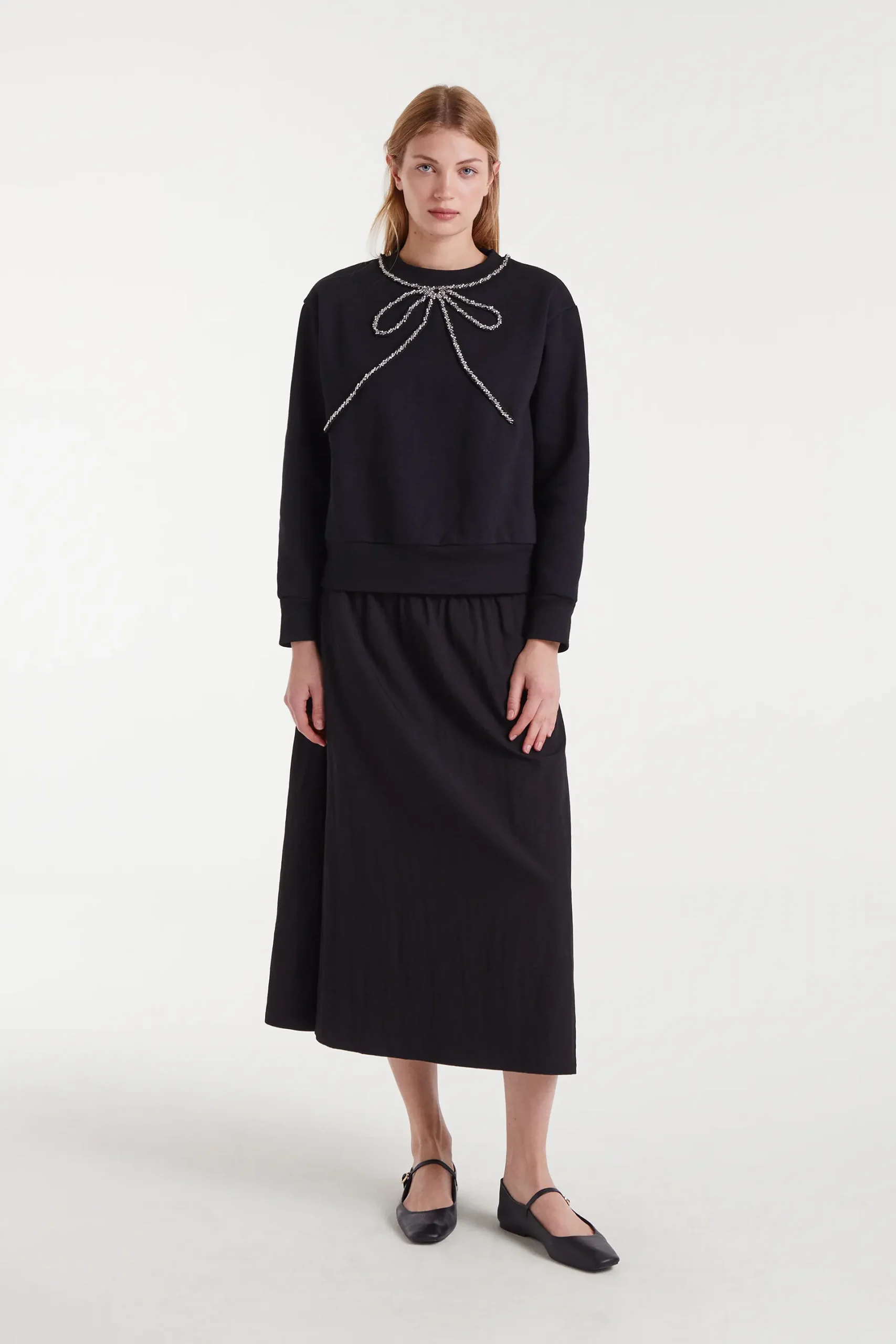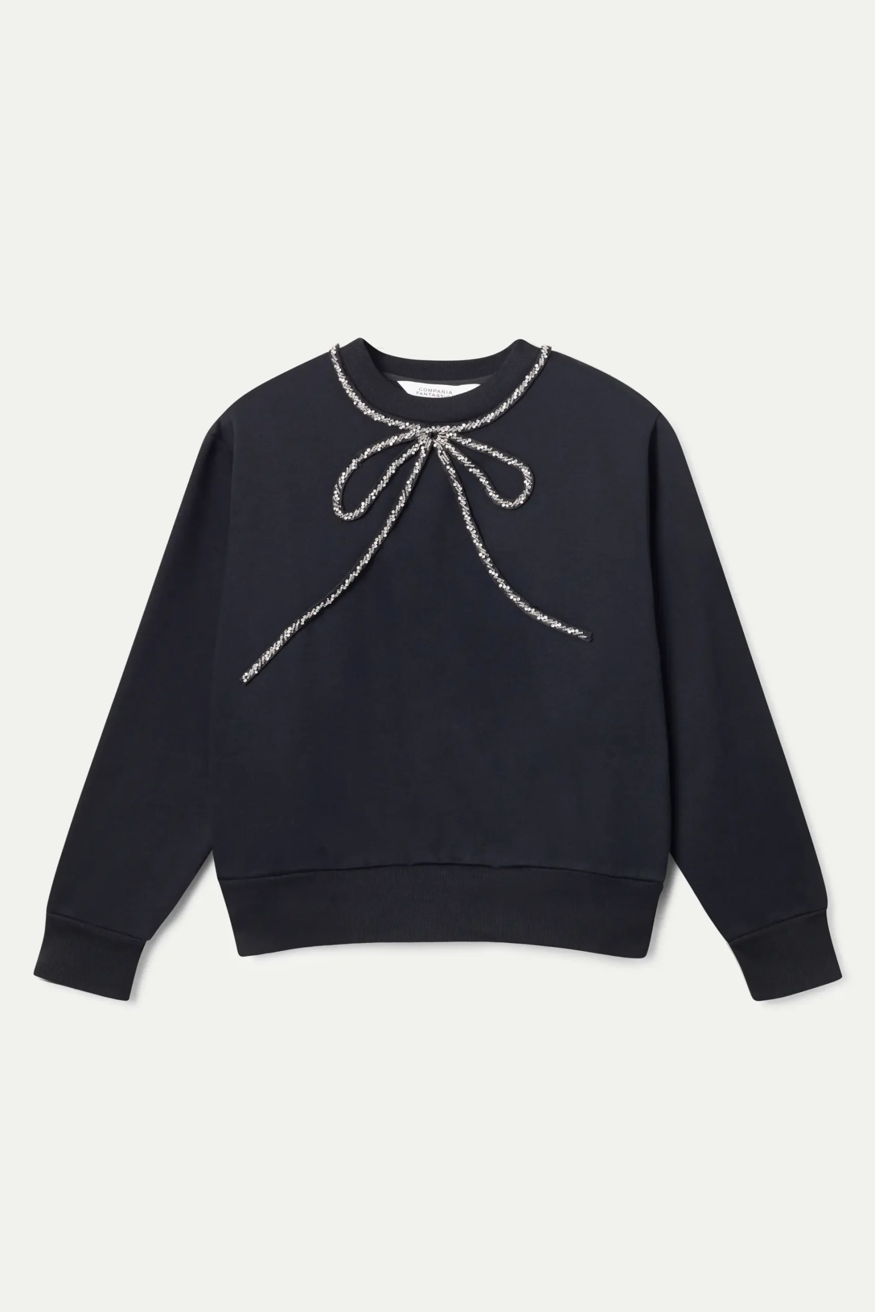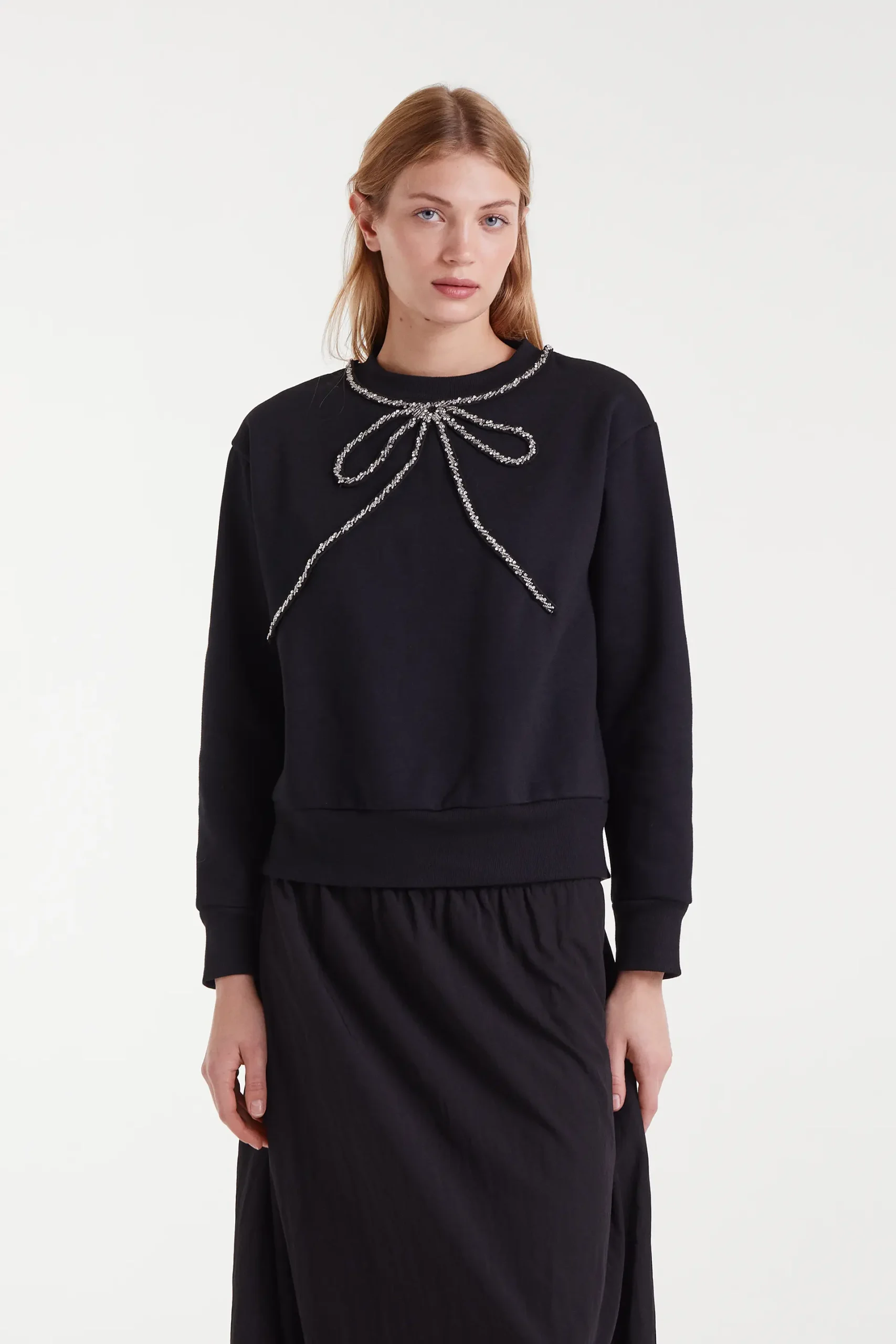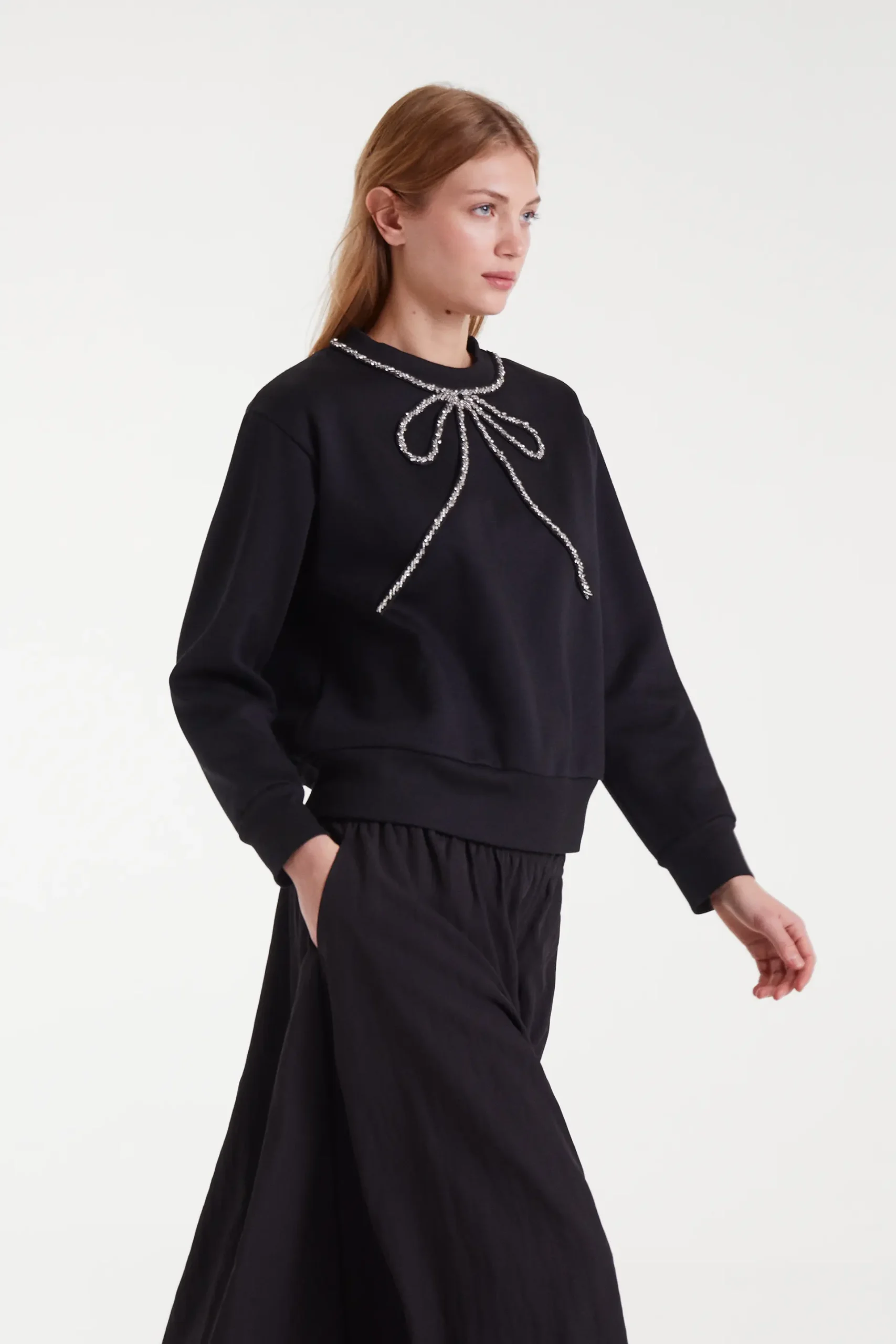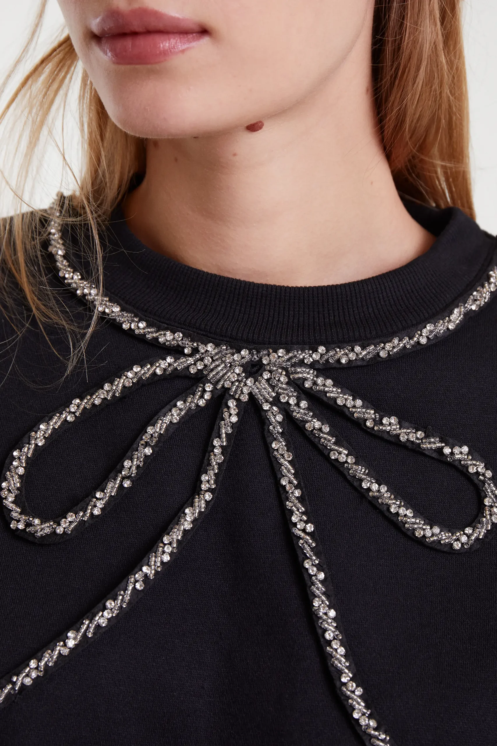 Sudadera con tejido forro polar de color negro. Cuello redondo y manga larga. Detalle de lazo con pedrería en el cuello. Acabados en rib. La modelo mide 179 cm y lleva la talla S.