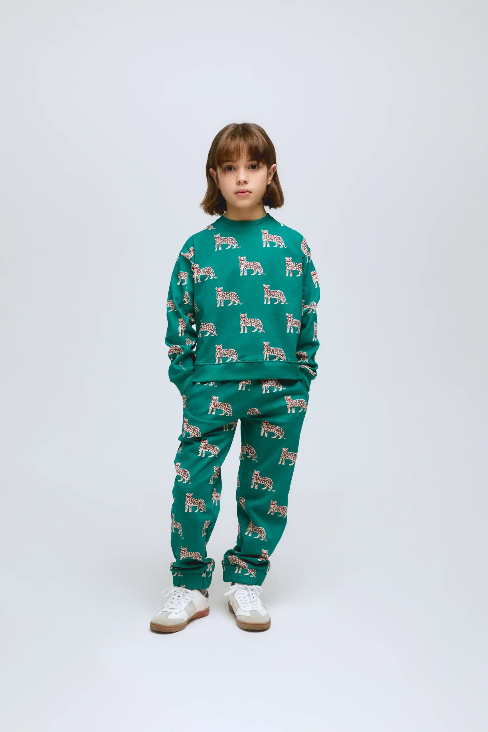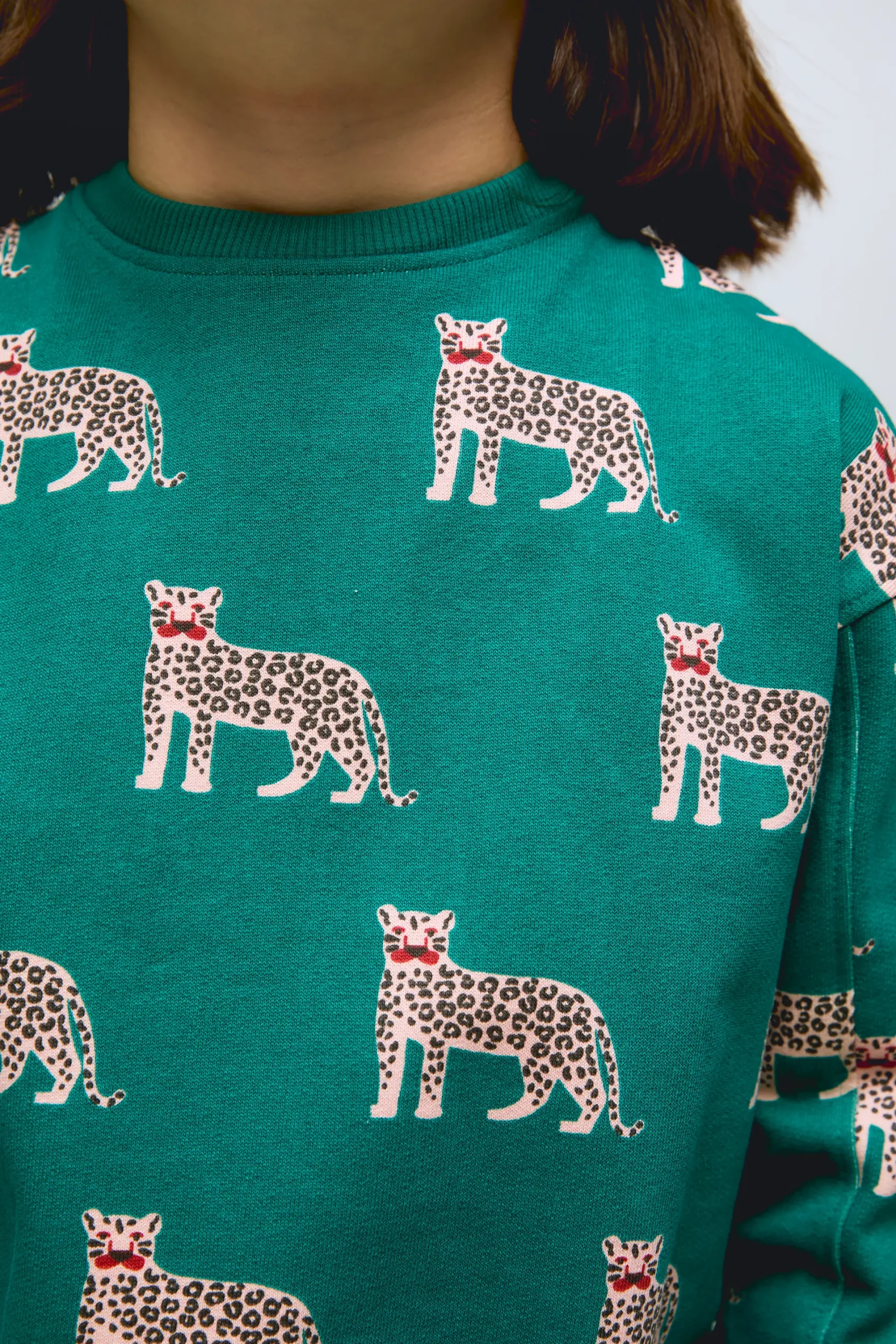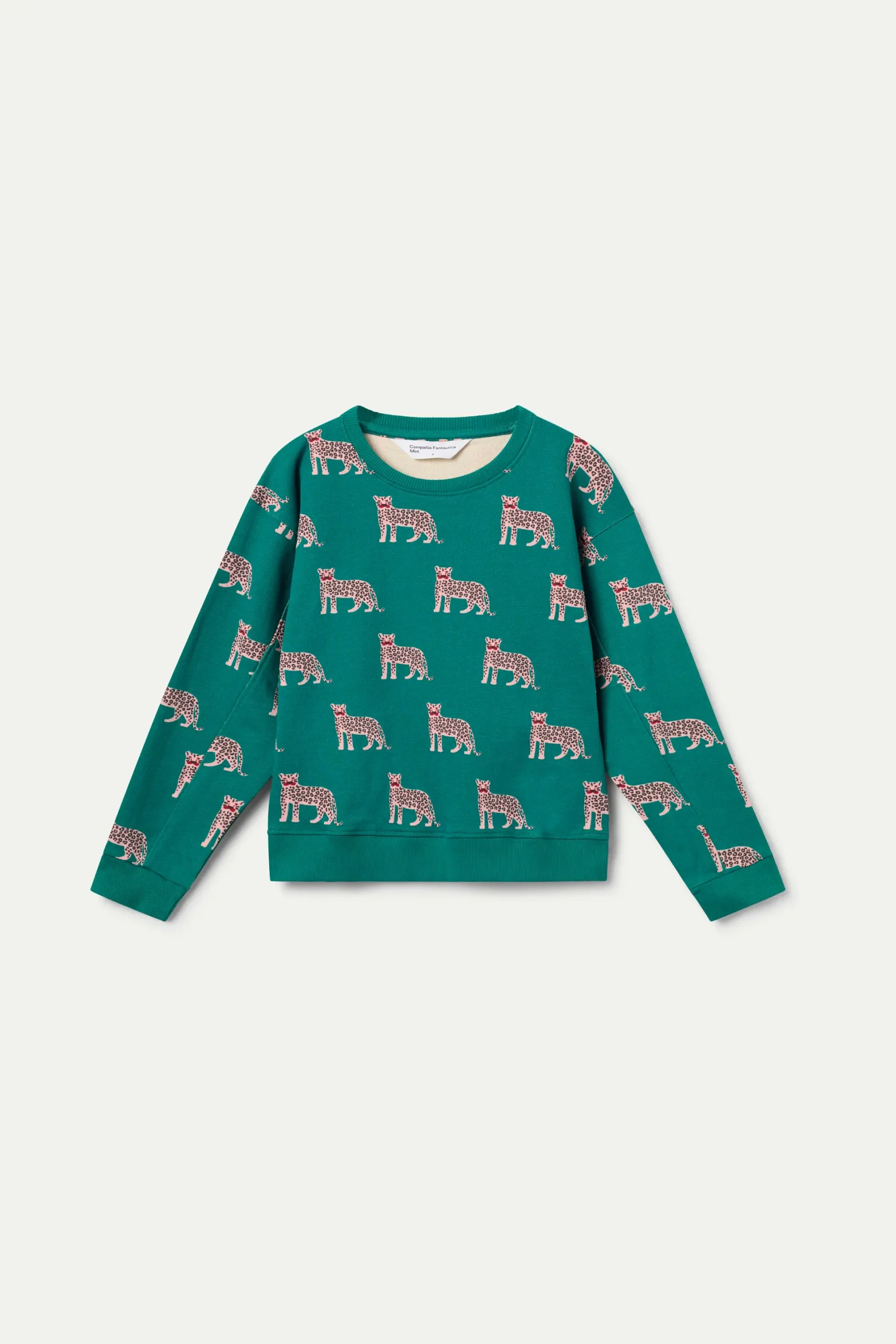 Sudadera Onca de algodón 100%, estampado de jaguar sobre fondo de color turquesa. Con cuello redondo y puños acanalados estilo sudadera.
