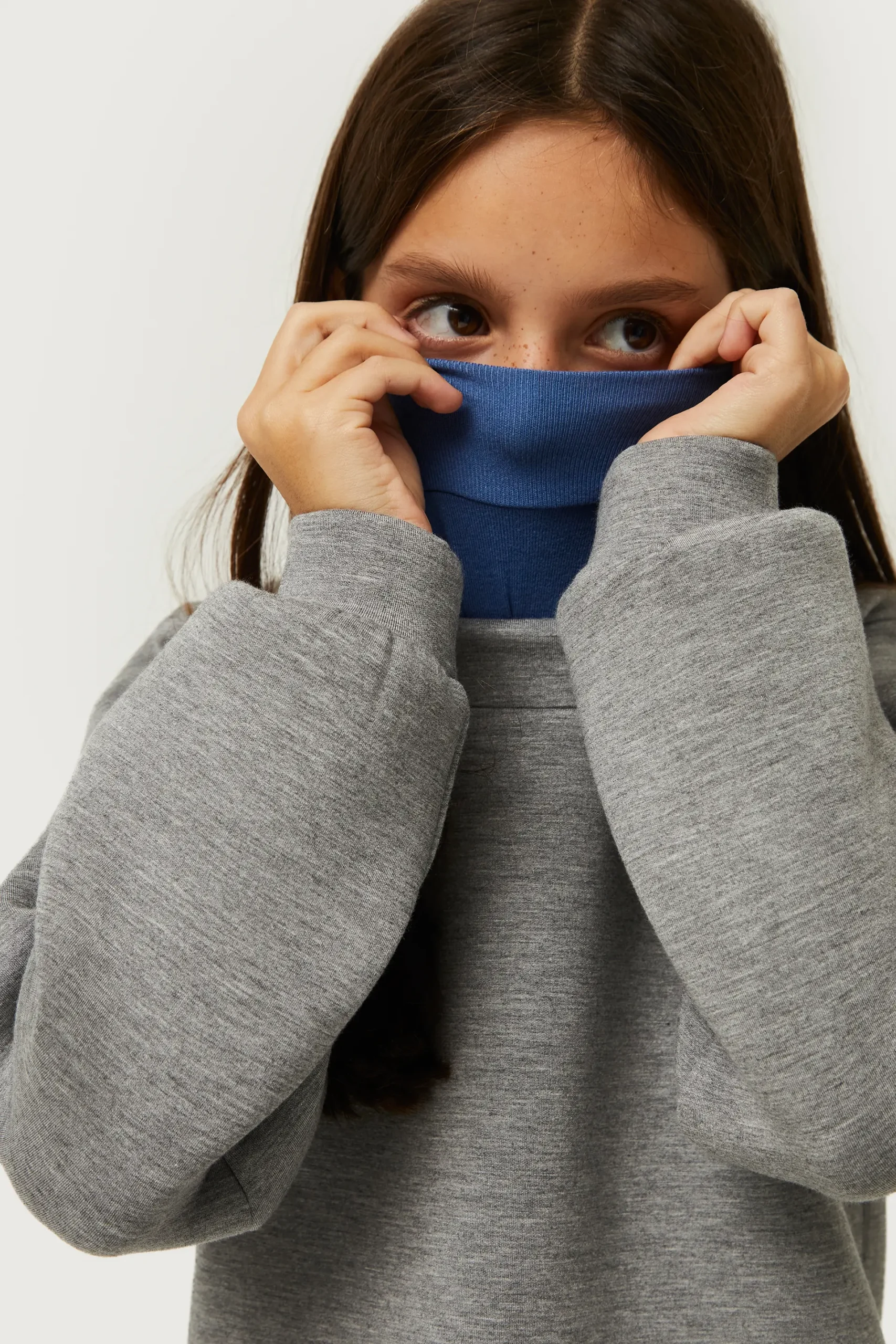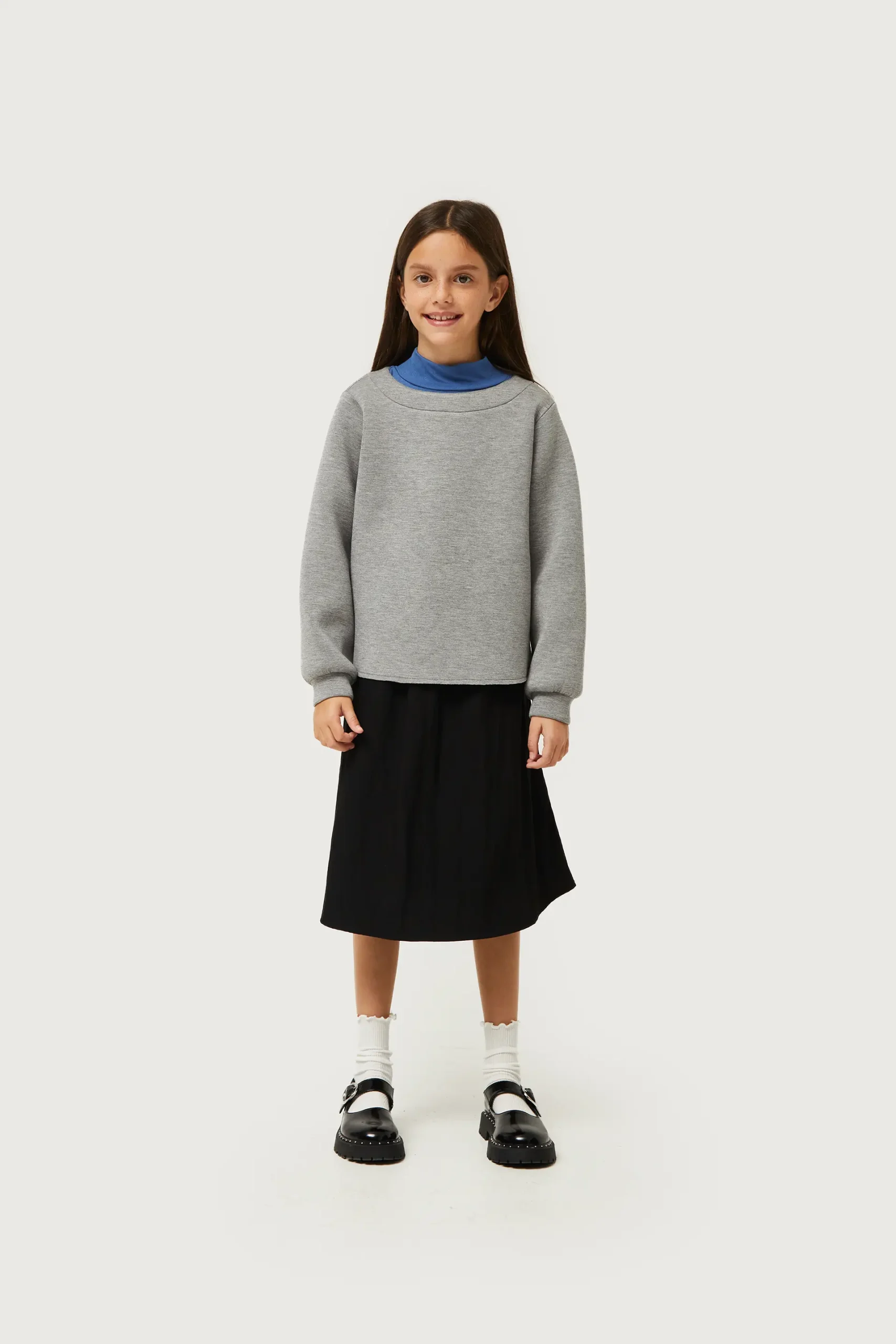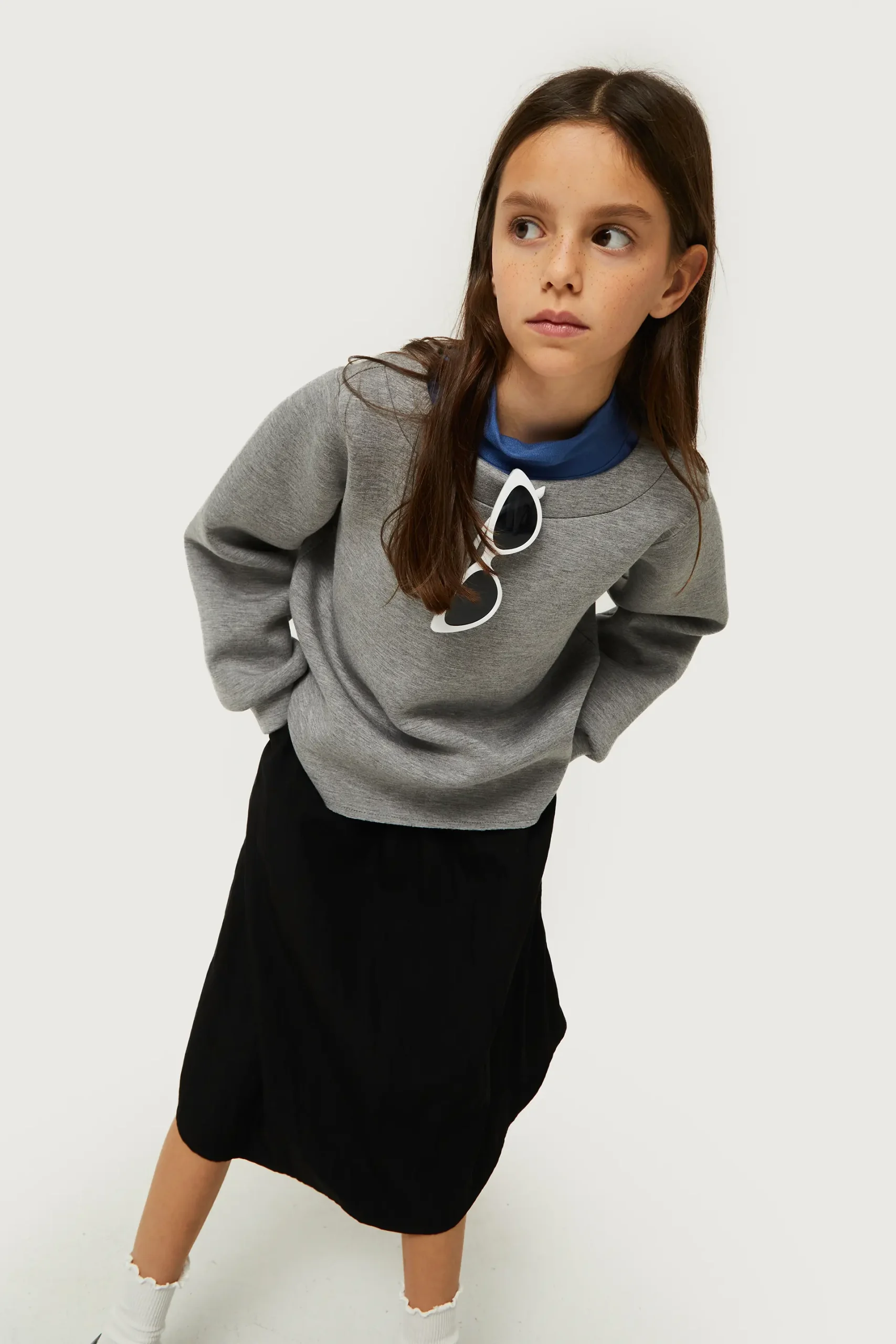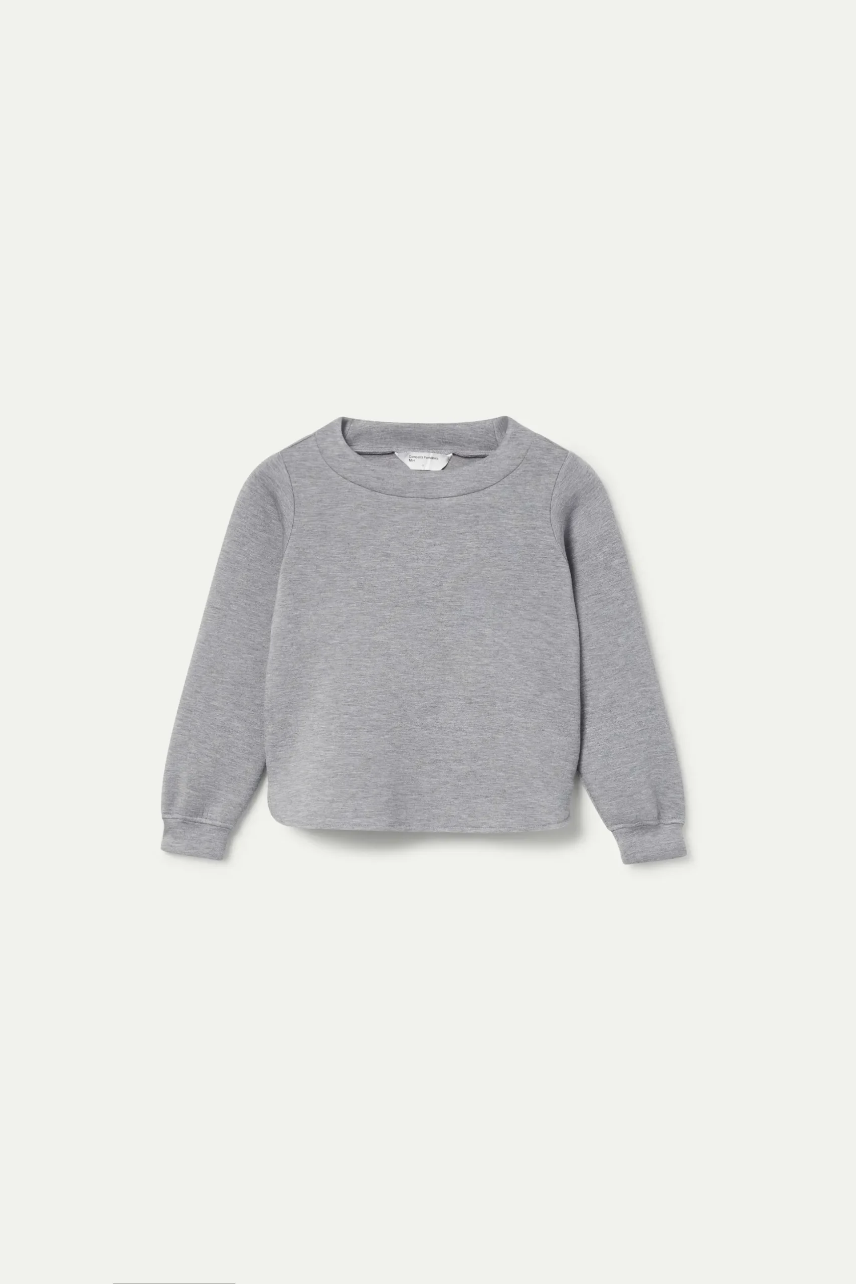 Sudadera de niña de neopreno de color gris. Con cuello redondo y manga larga. La modelo mide 134 cm y lleva la talla 8.